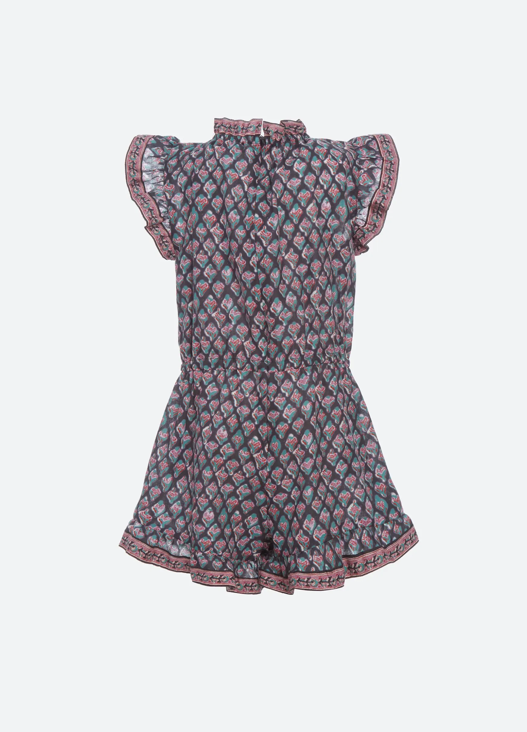 The Donna print sleeveless kids jumpsuit features a tassel tie and ruffle detailing. Part of our mommy & me coordinating collection.