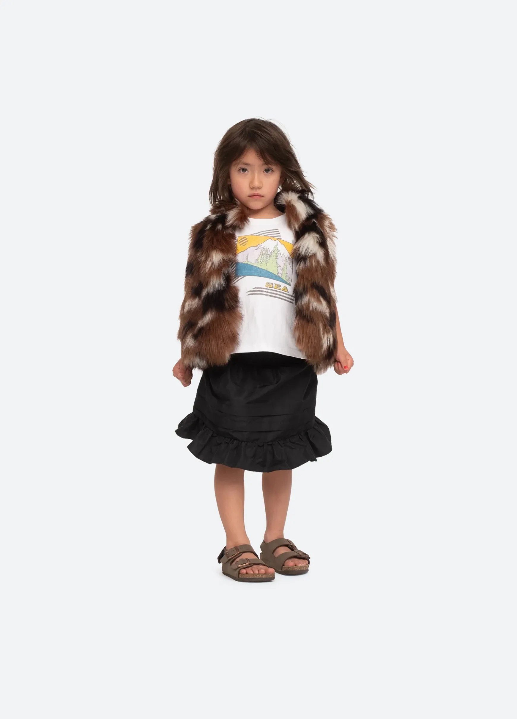The Karlie faux fur kids vest features multicolored faux fur and a cropped silhouette. Part of our mommy & me coordinating collection.