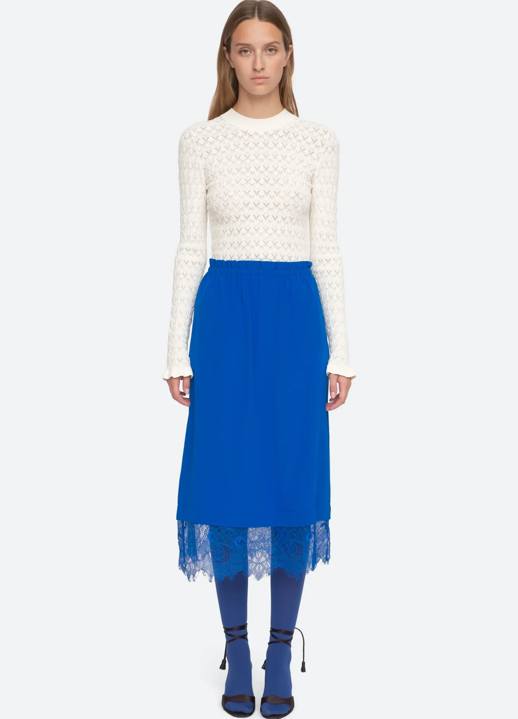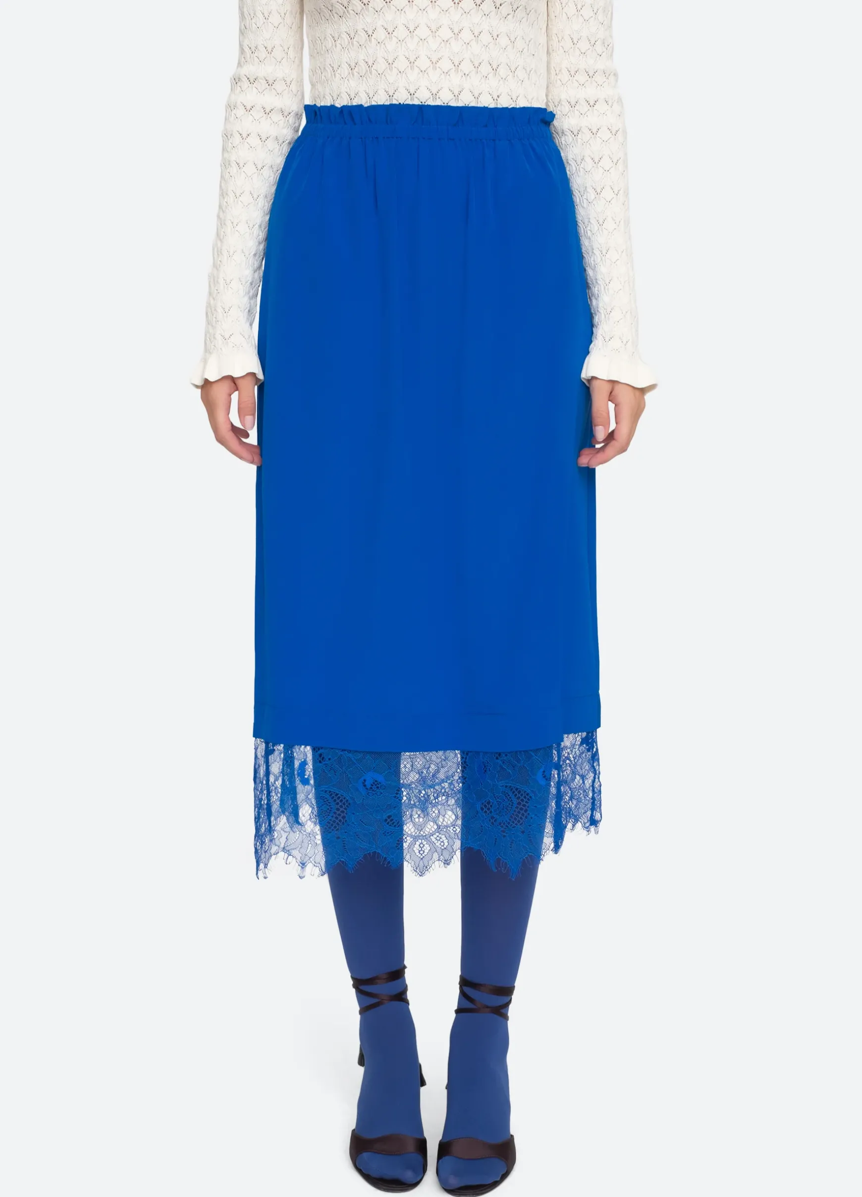 The Lorraine silk skirt features an elasticated waist and lace trimmed hemline.