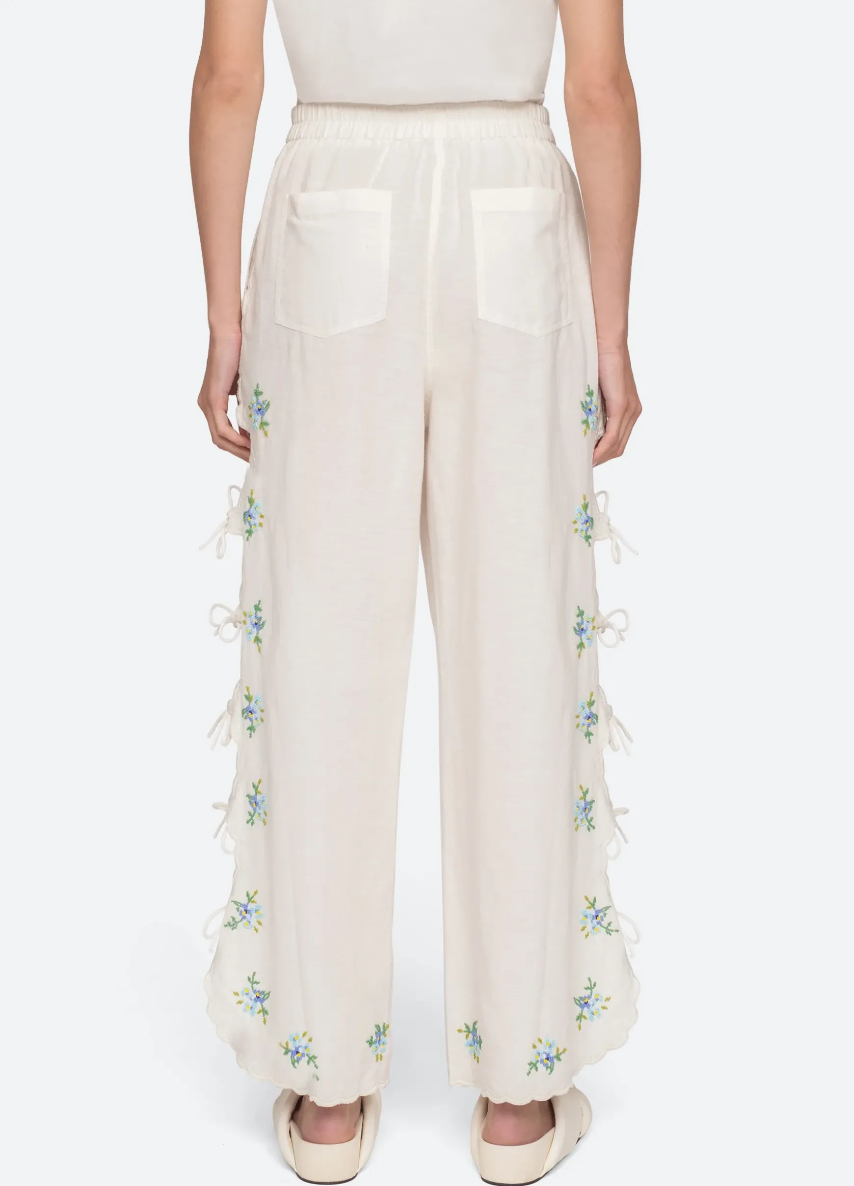 The Tania beaded pants feature an elasticized waistband, floral beaded detailing and ties down the side of the leg. Designed for an easy, relaxed fit.