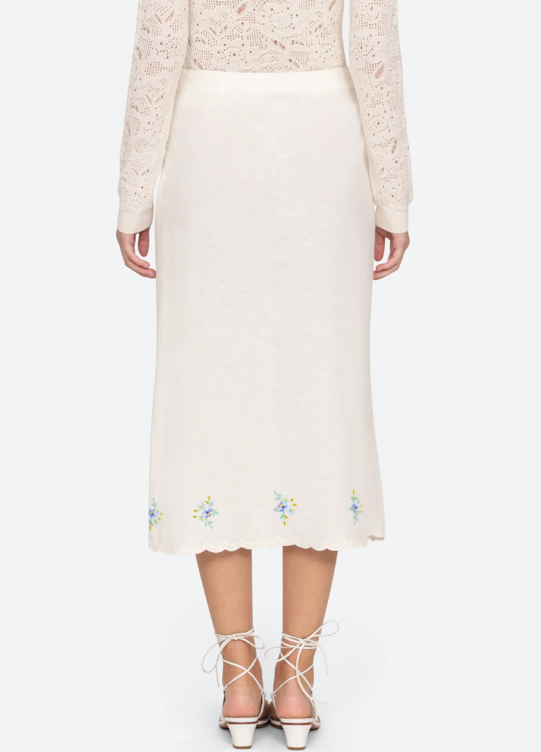 The Tania beaded skirt features an asymmetrical front slit with self ties, floral beaded detailing and scalloped hemline.