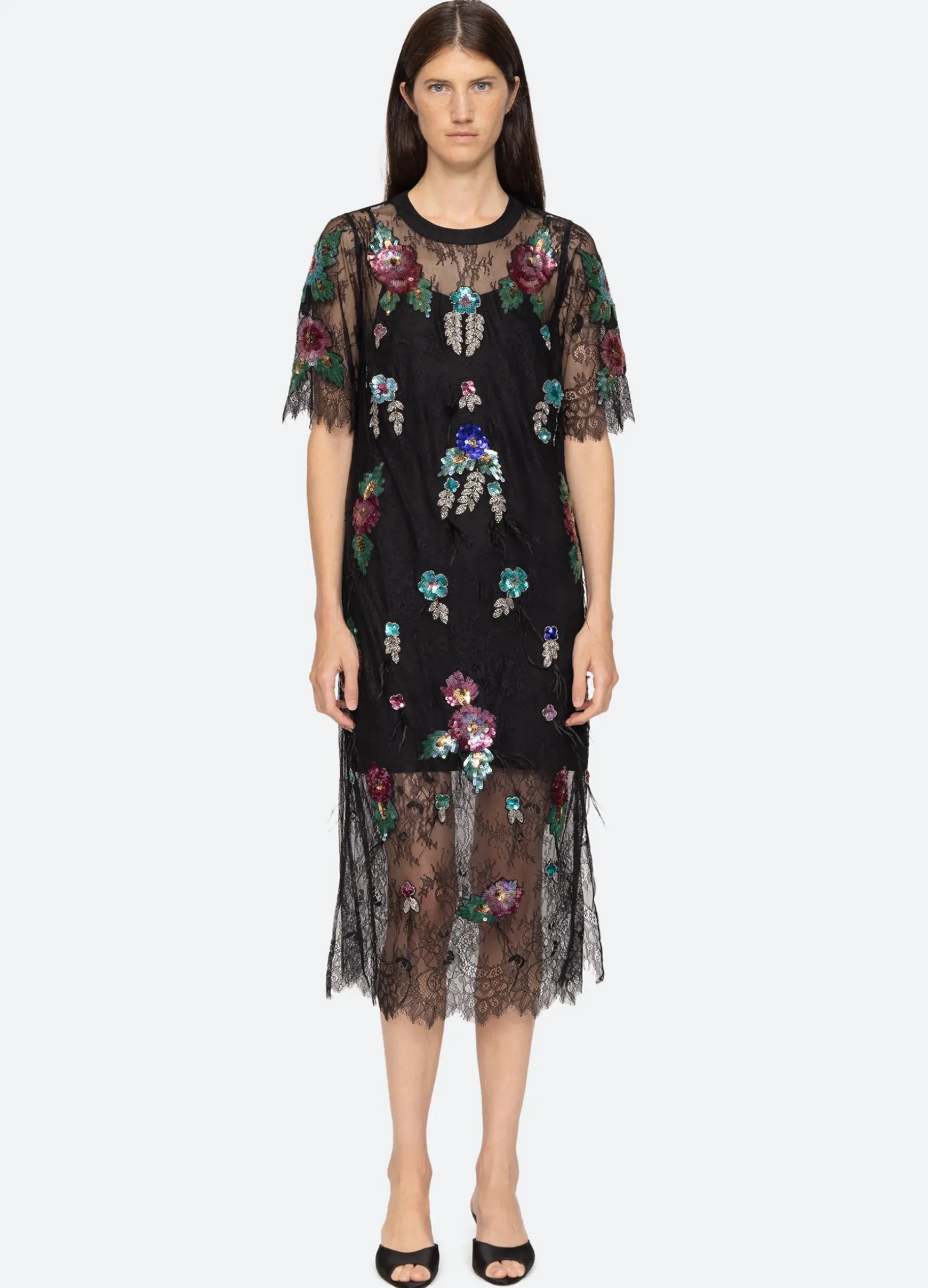 The Bethany T-Shirt dress features side slits and is accented with floral sequin appliques, beaded detailing and feathers.