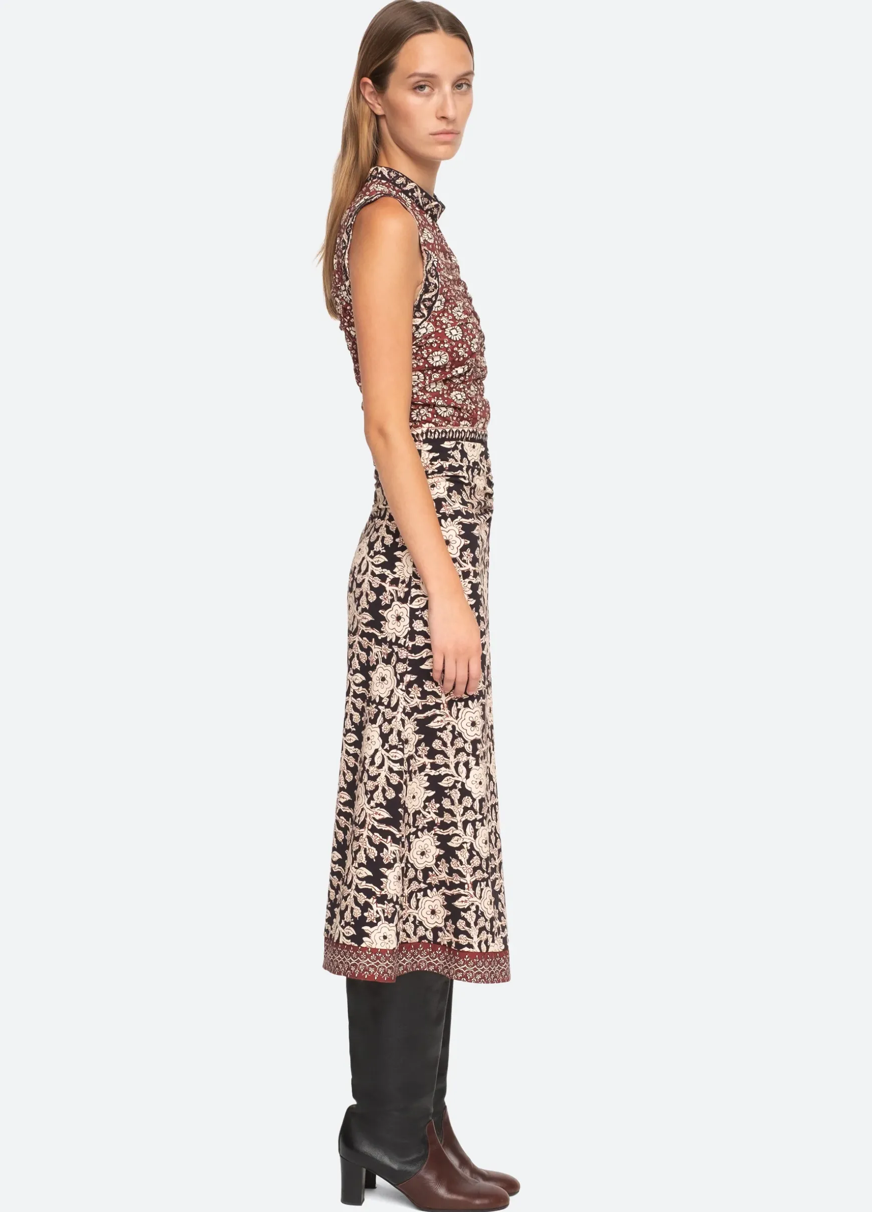 The Danae floral print sleeveless dress features ruched detailing and a midi silhouette.