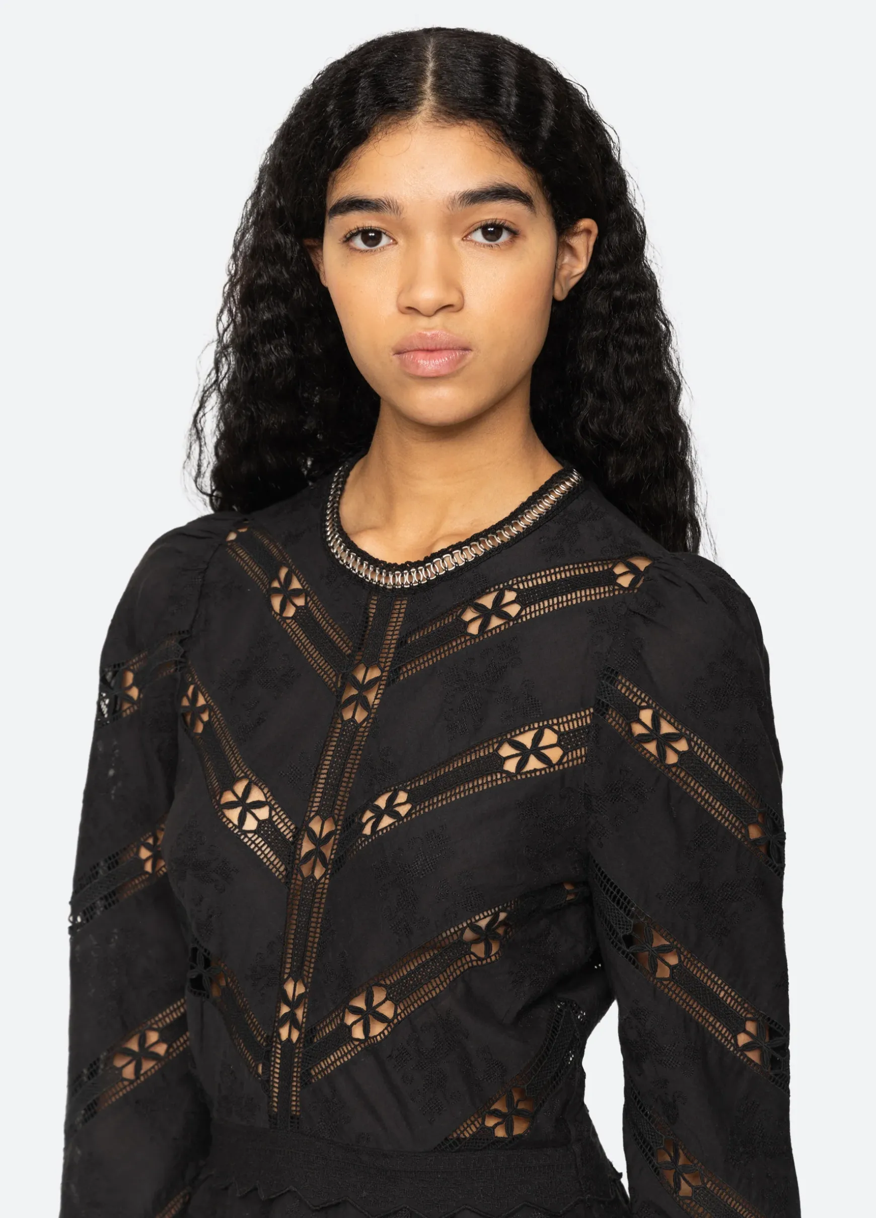 The Sharika embroidered lace dress features long sleeves, mini silhouette, scalloped trim and crocheted metal chain accents.