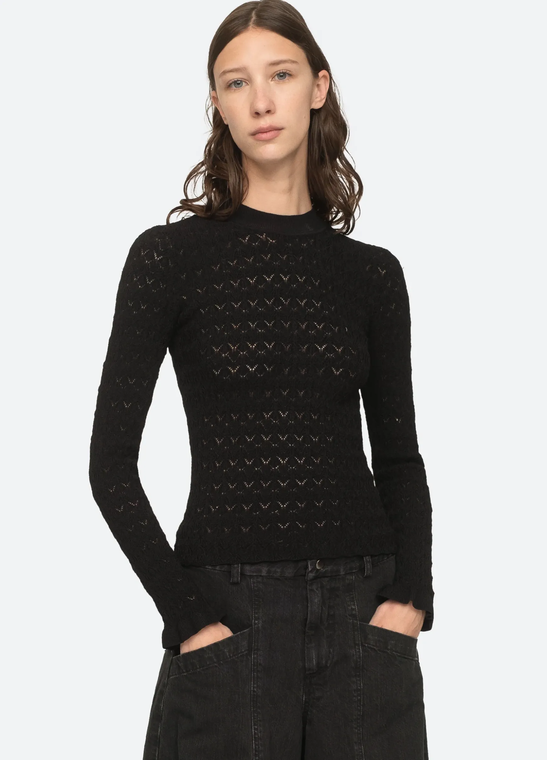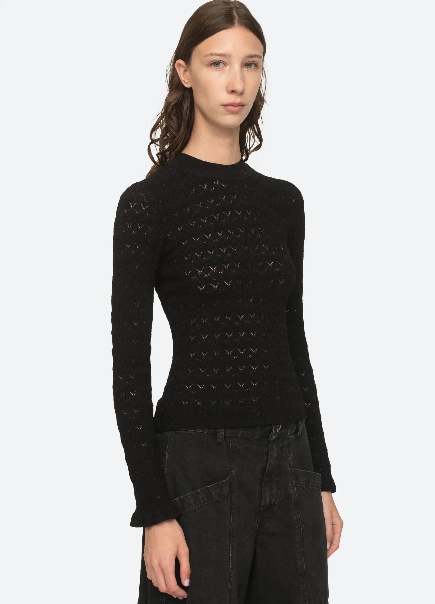The Rue fine gauge knit sweater features ruffle cuffs and is crafted for a slim fit. The perfect layering piece.