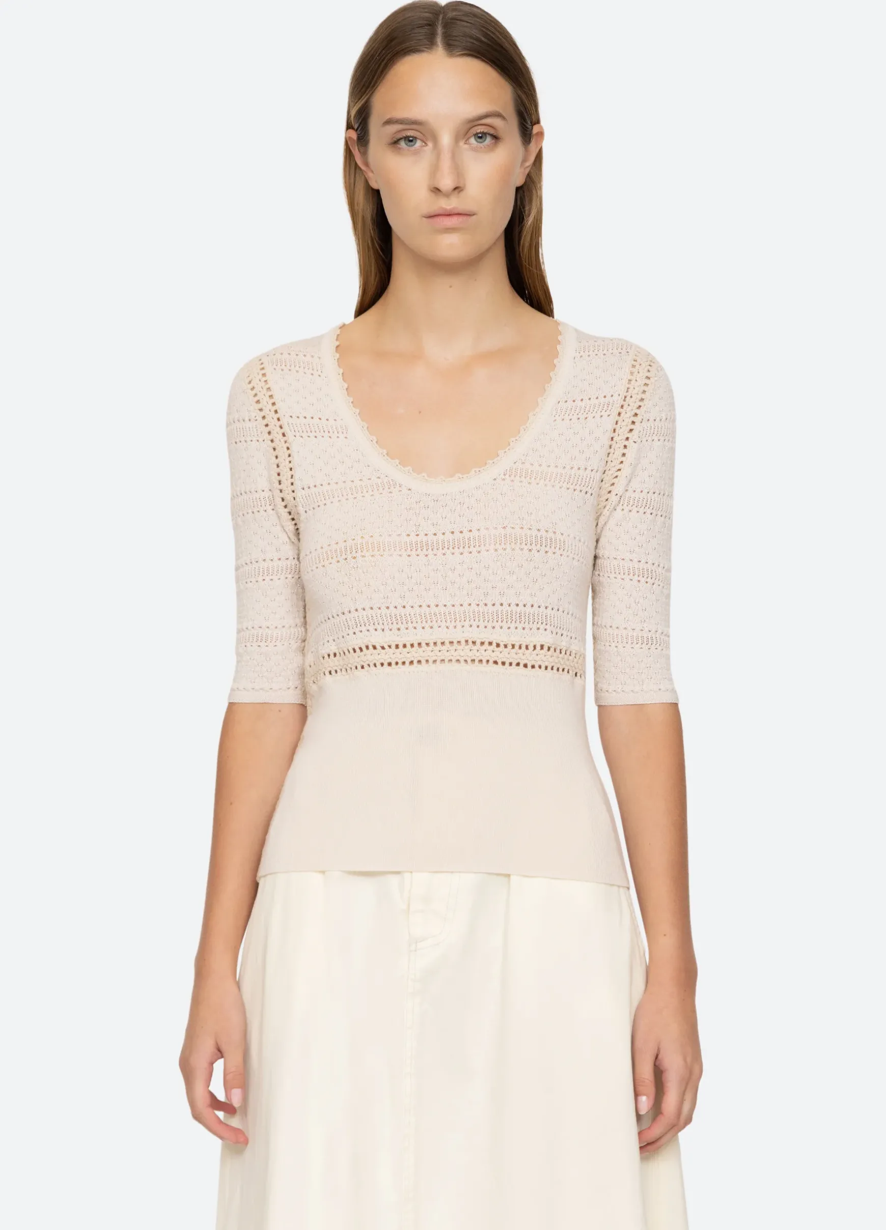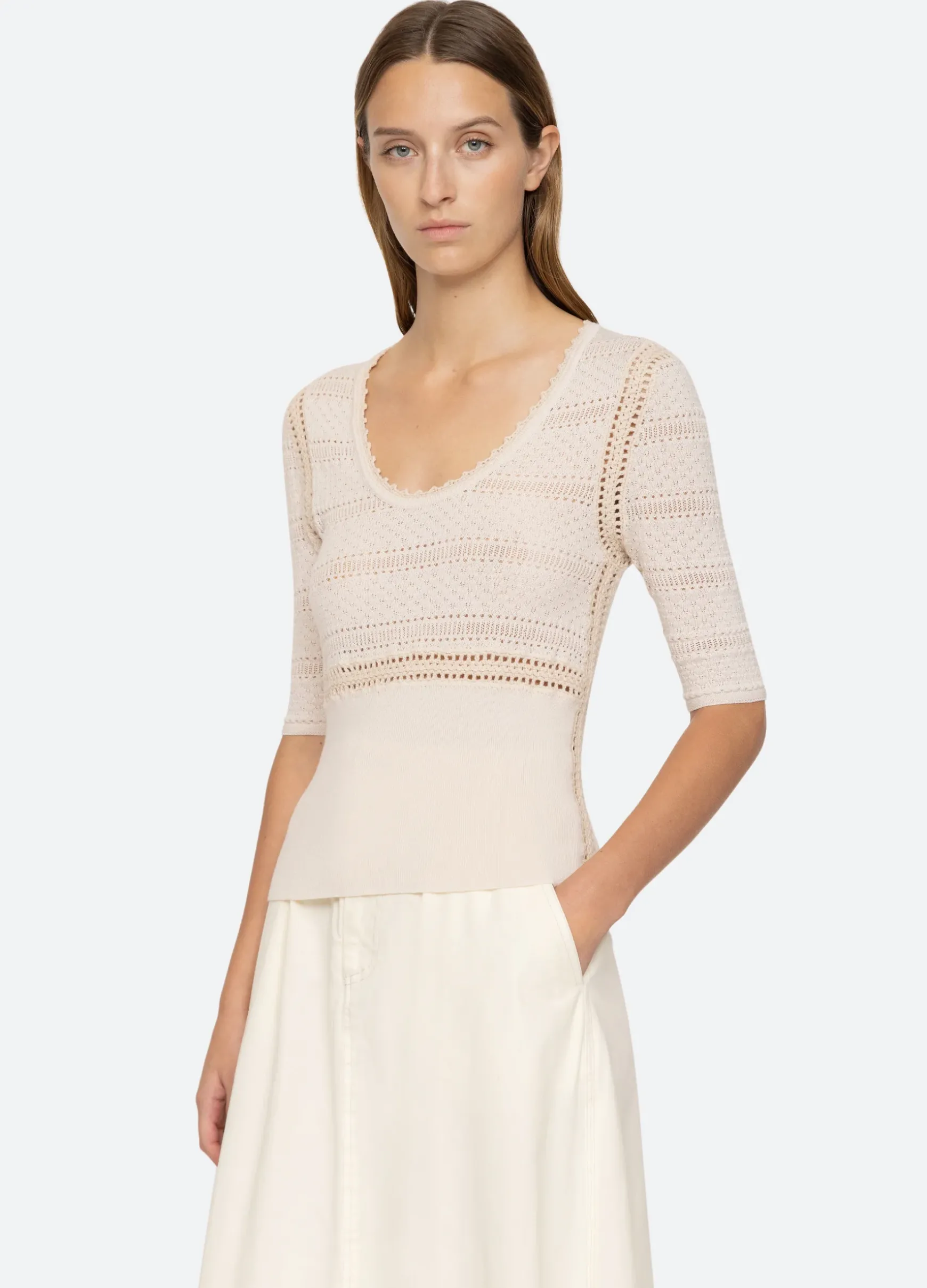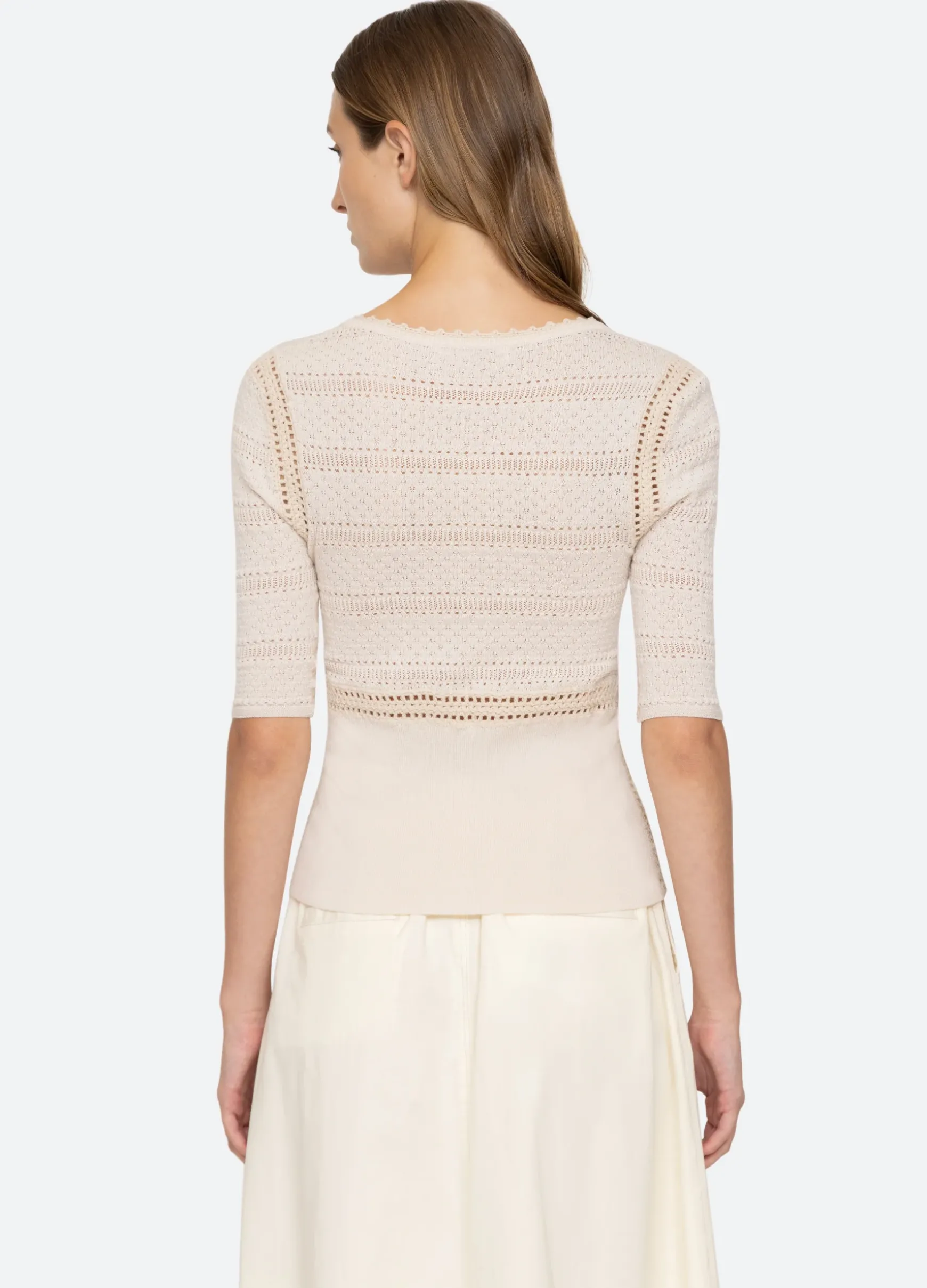 The Syble pointelle short sleeve sweater is crafted from merino wool and is a perfect wardrobe staple.