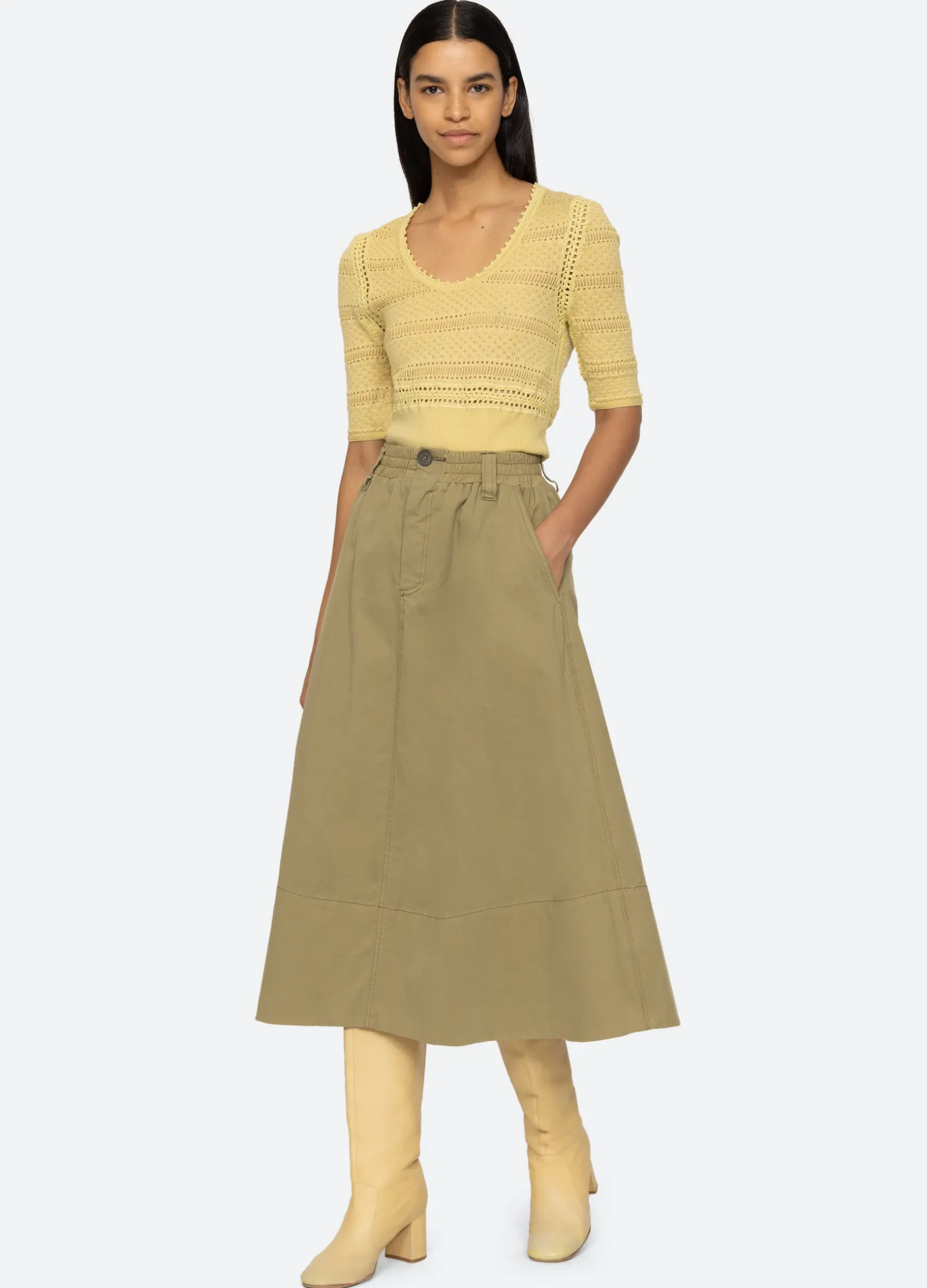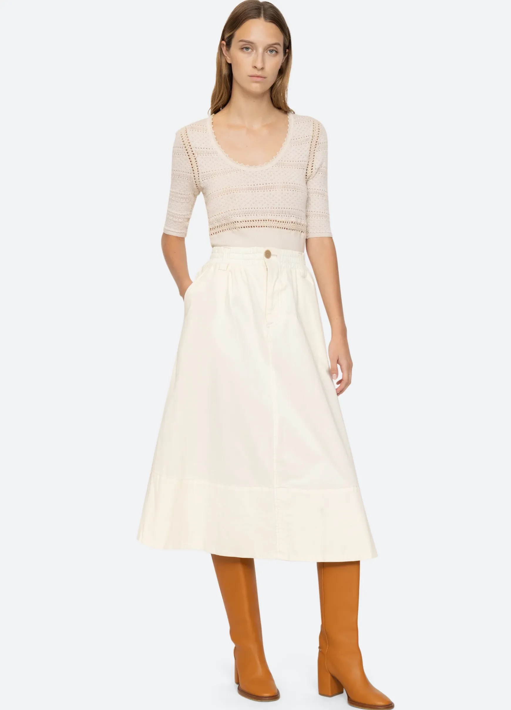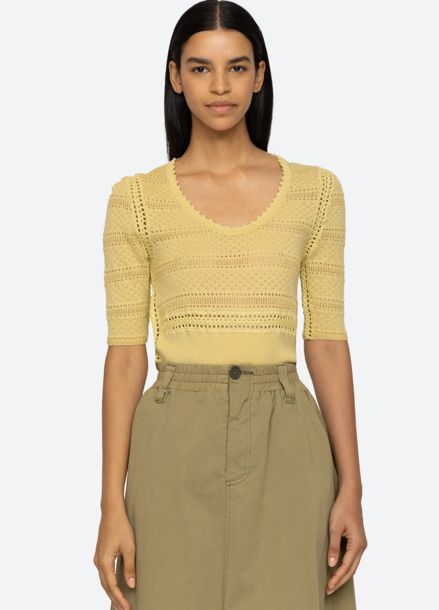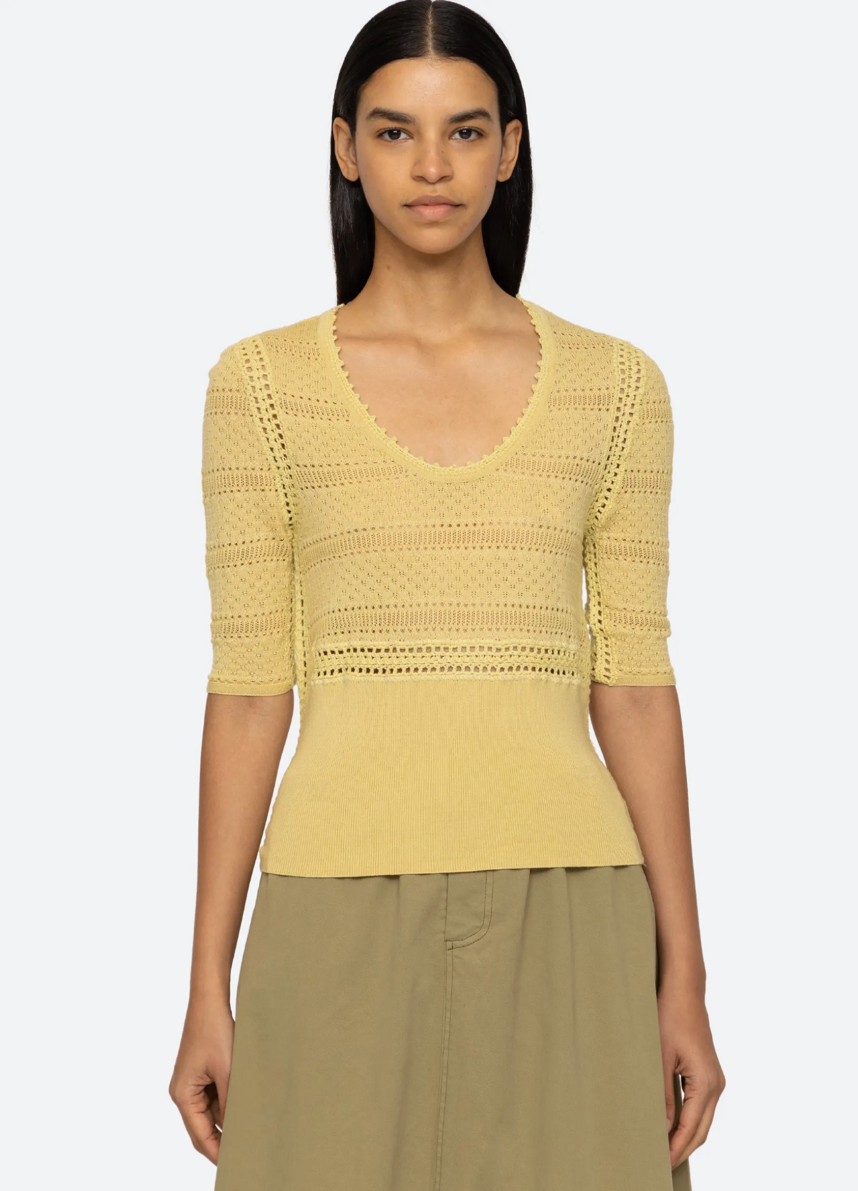The Syble pointelle short sleeve sweater is crafted from merino wool and is a perfect wardrobe staple.