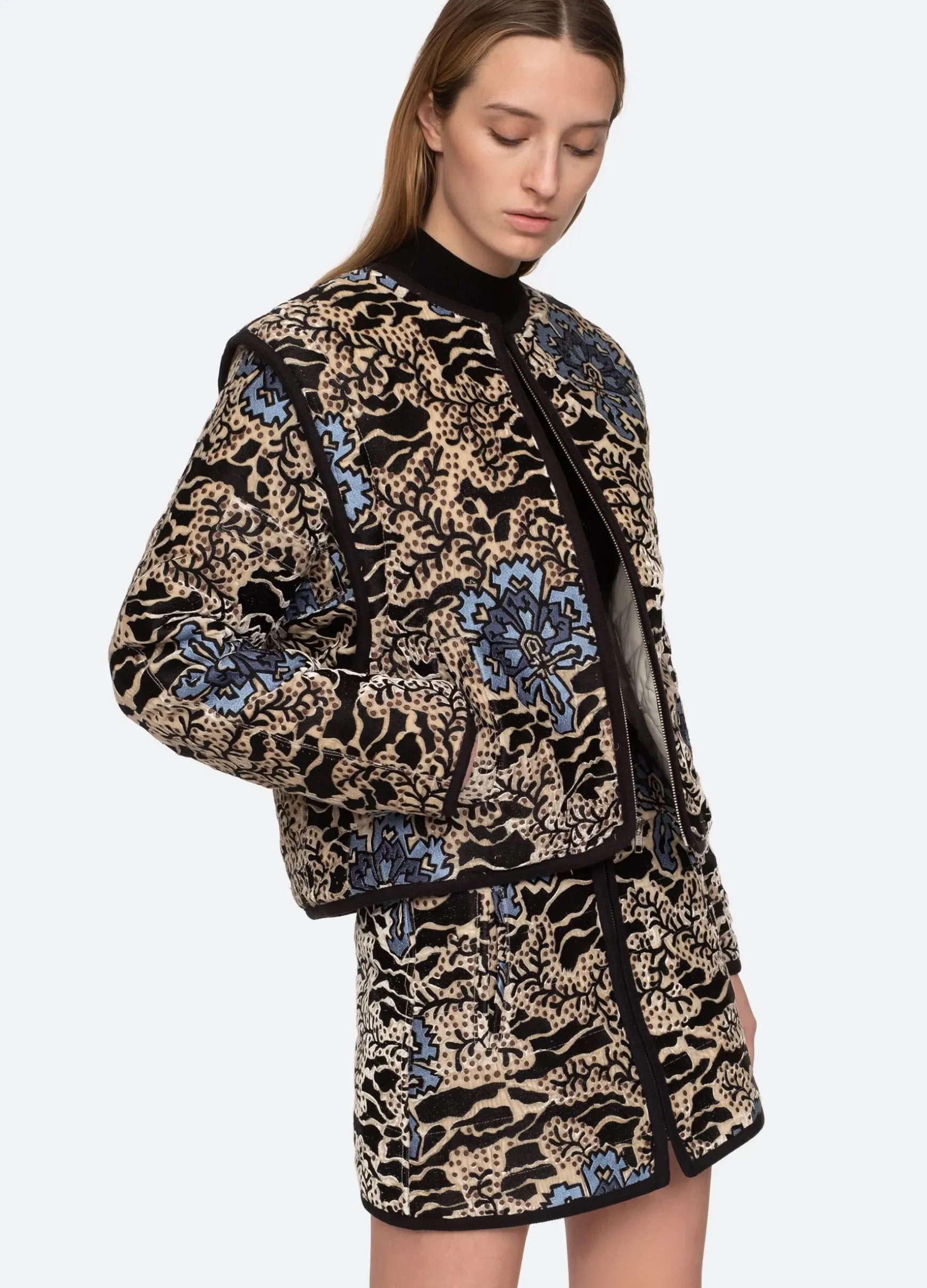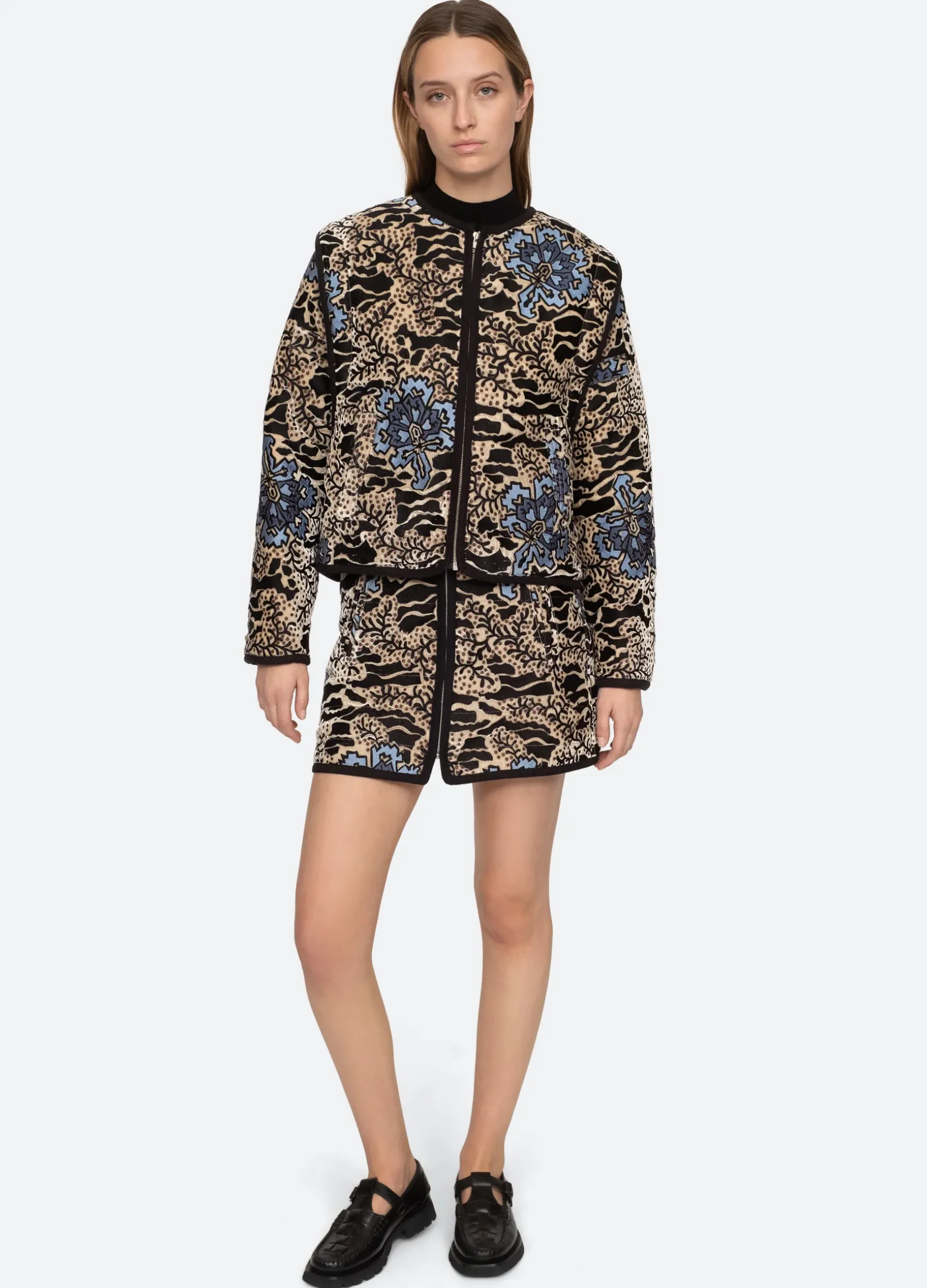 The Haley velvet embroidered skirt features contrast trim detailing, floral embroidery and exposed front zipper. Pairs perfectly with the matching Haley jacket. Please note there is variation in embroidered placement on each garment.