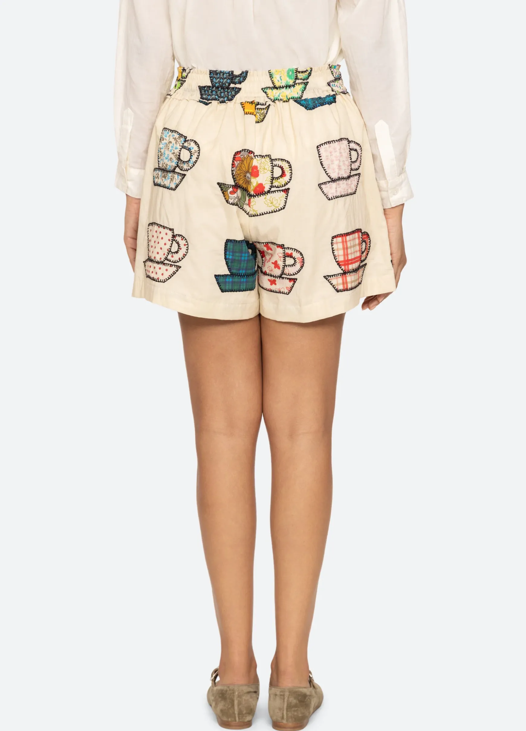 The Karmen tea cup embroidered shorts feature an elasticized waist and playful tea cup print. Designed for an easy, relaxed fit. Due to the handmade appliqué process, motif variations may occur form garment to garment. No two are exactly alike.