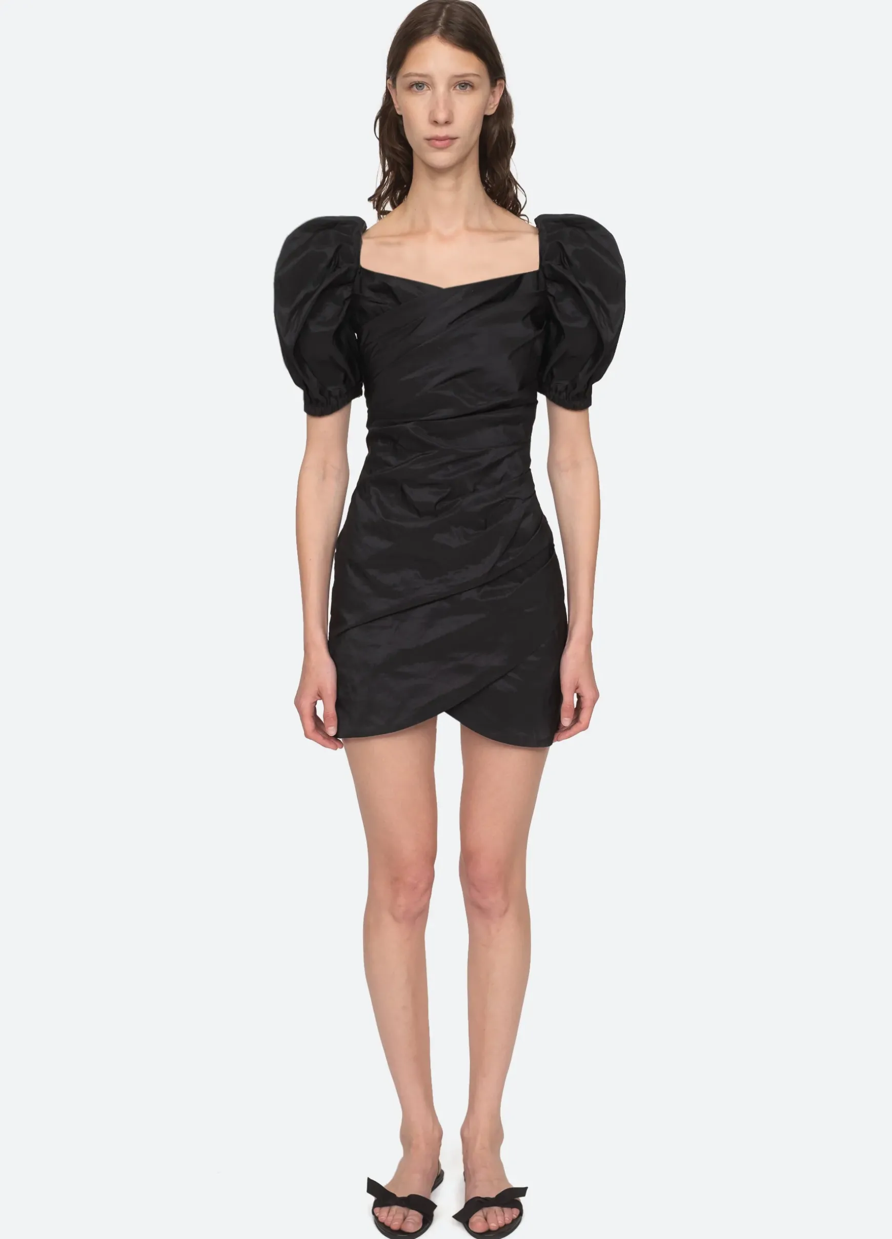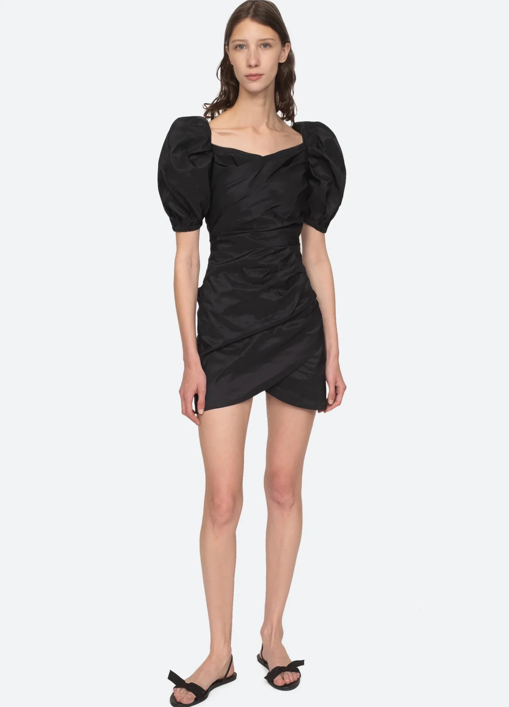 The Diana taffeta dress features a sweet heart neckline, short puff sleeves and ruched detailing throughout.