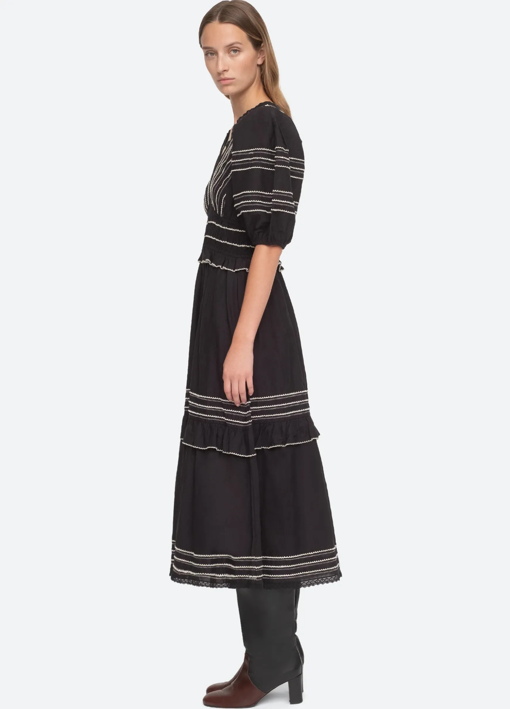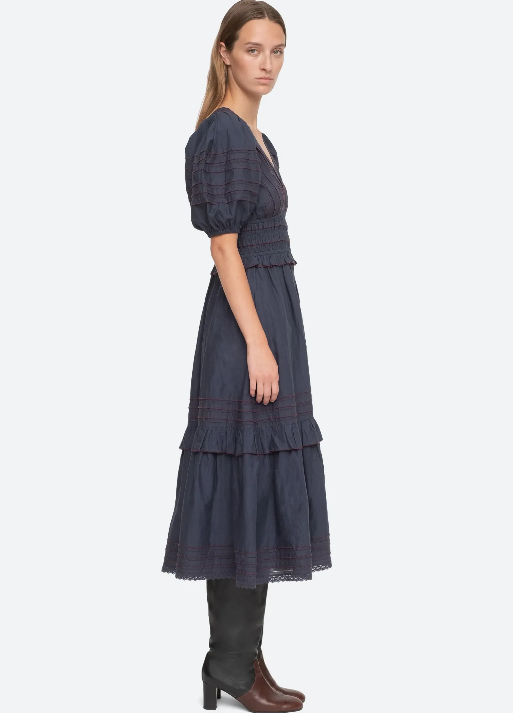 The Mable midi dress features a v-neckline, puff sleeves, pleated detailing, lace trim and smocking.