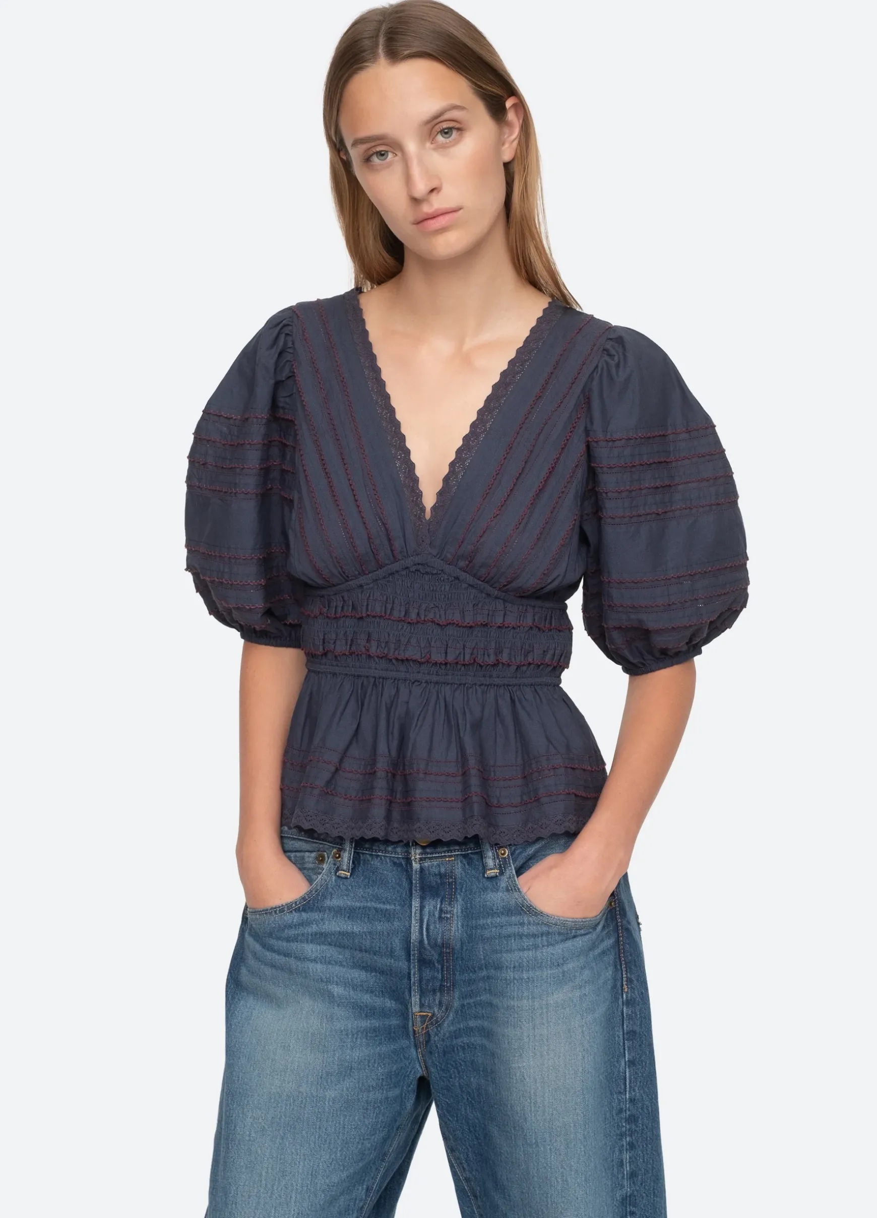 The Mable top features puff sleeves, v-neckline, pleated detailing and lace trim.
