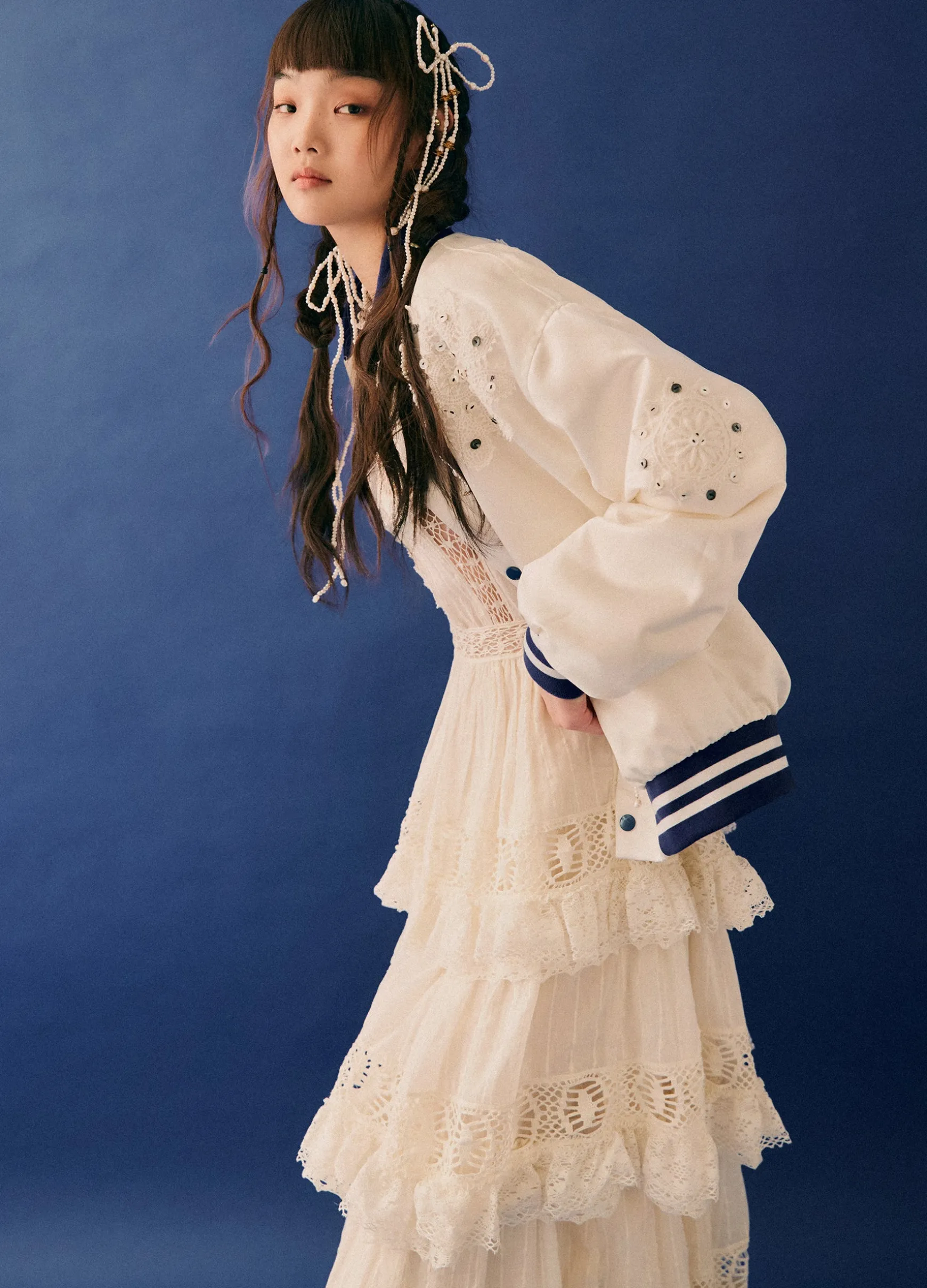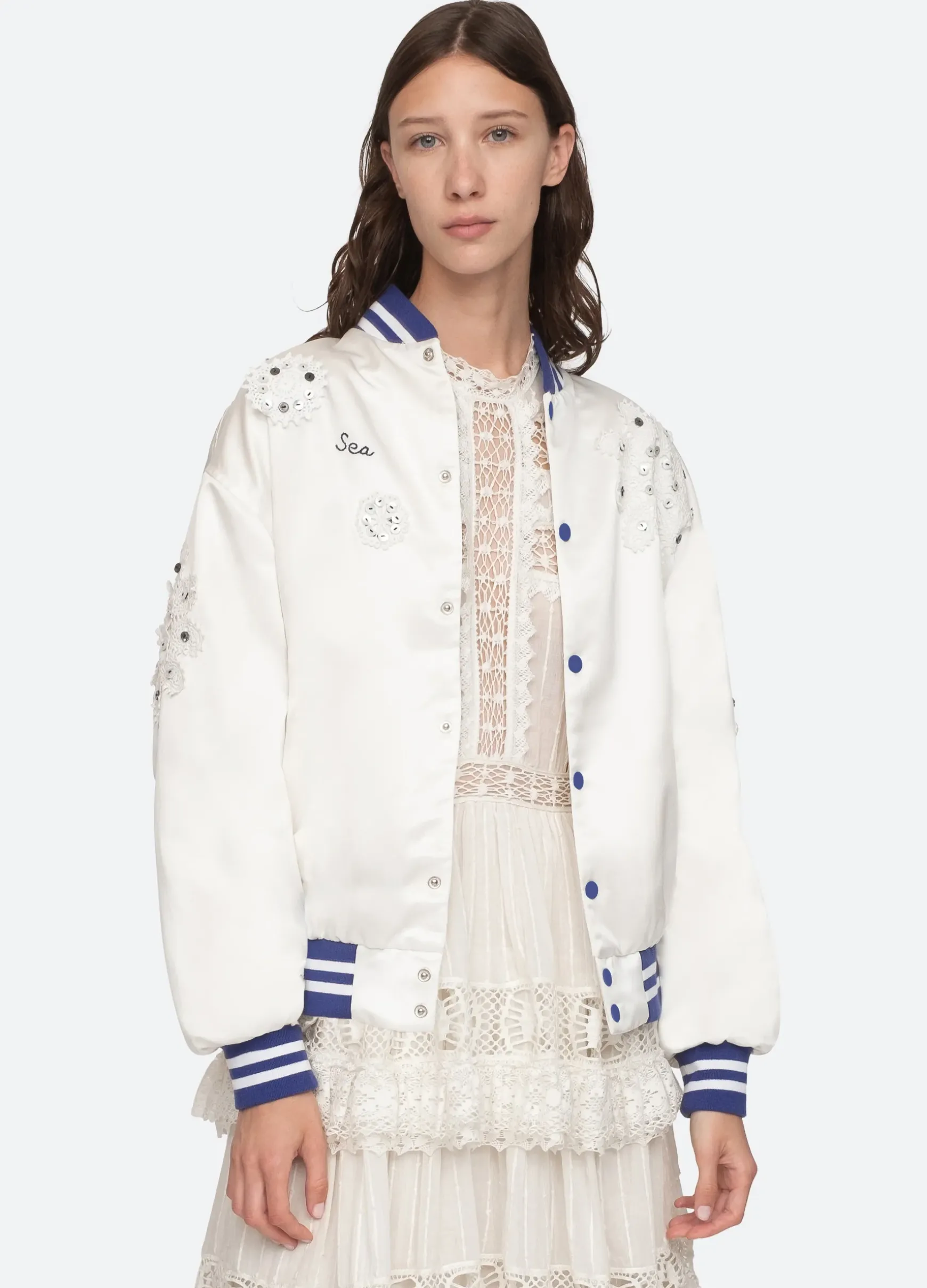 The Betina bomber jacket features beaded and lace embellishments and striped ribbed trim.