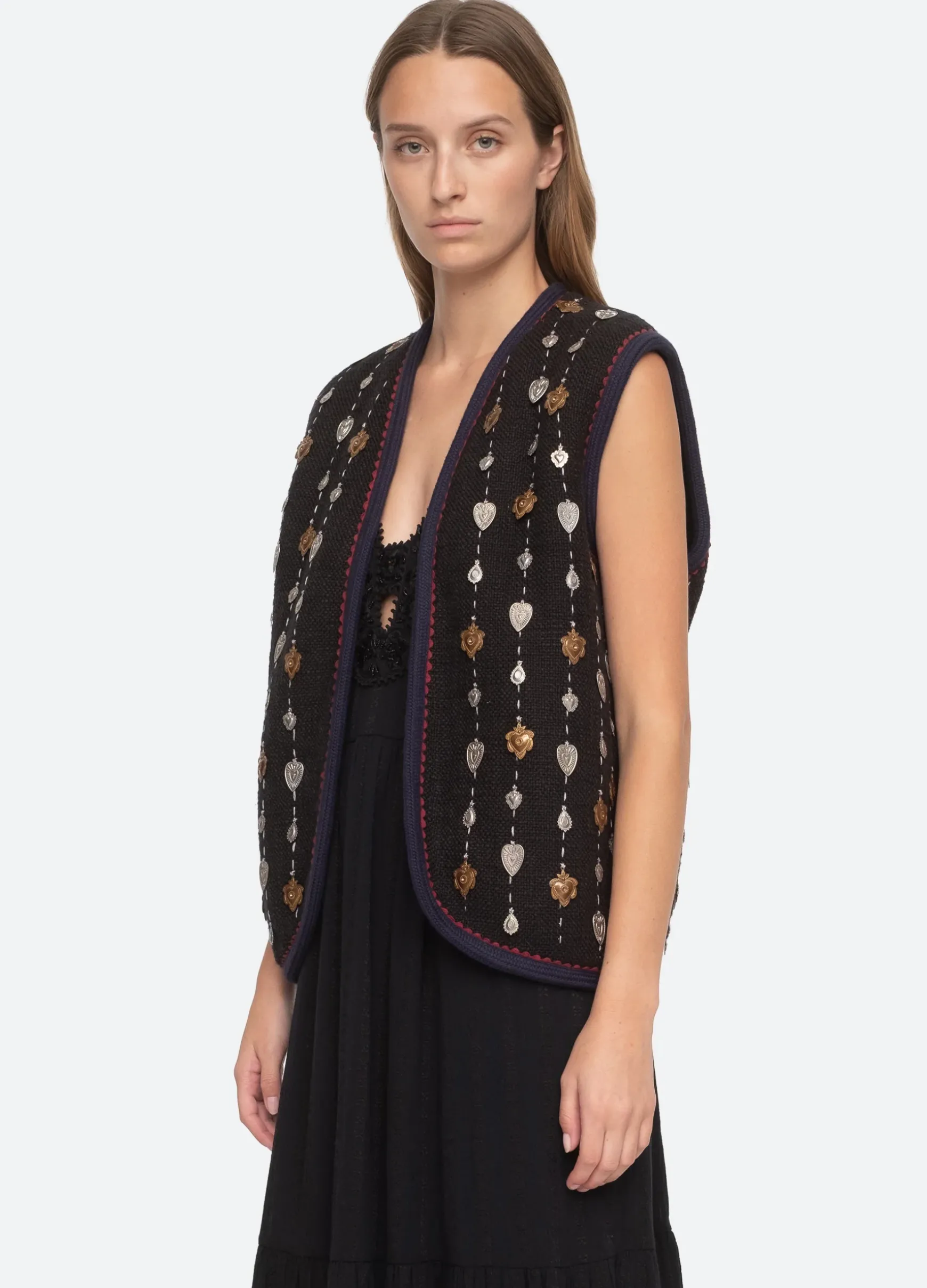 The Betina beaded vest is embellished with heart and beaded accents throughout.