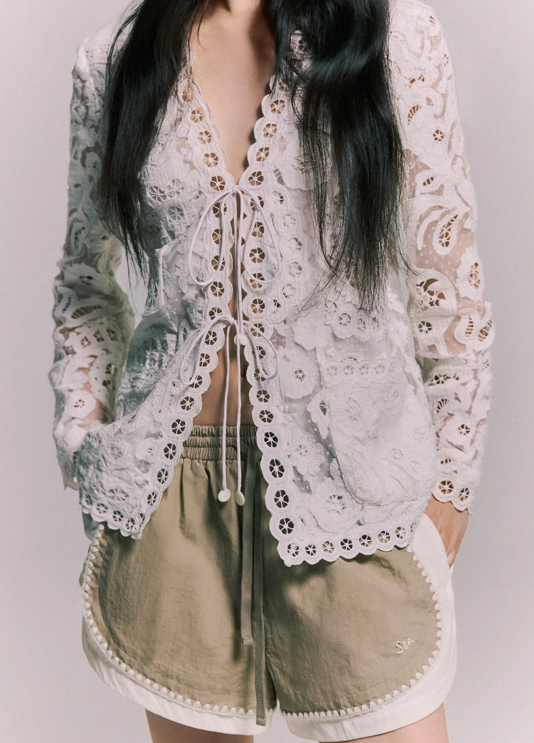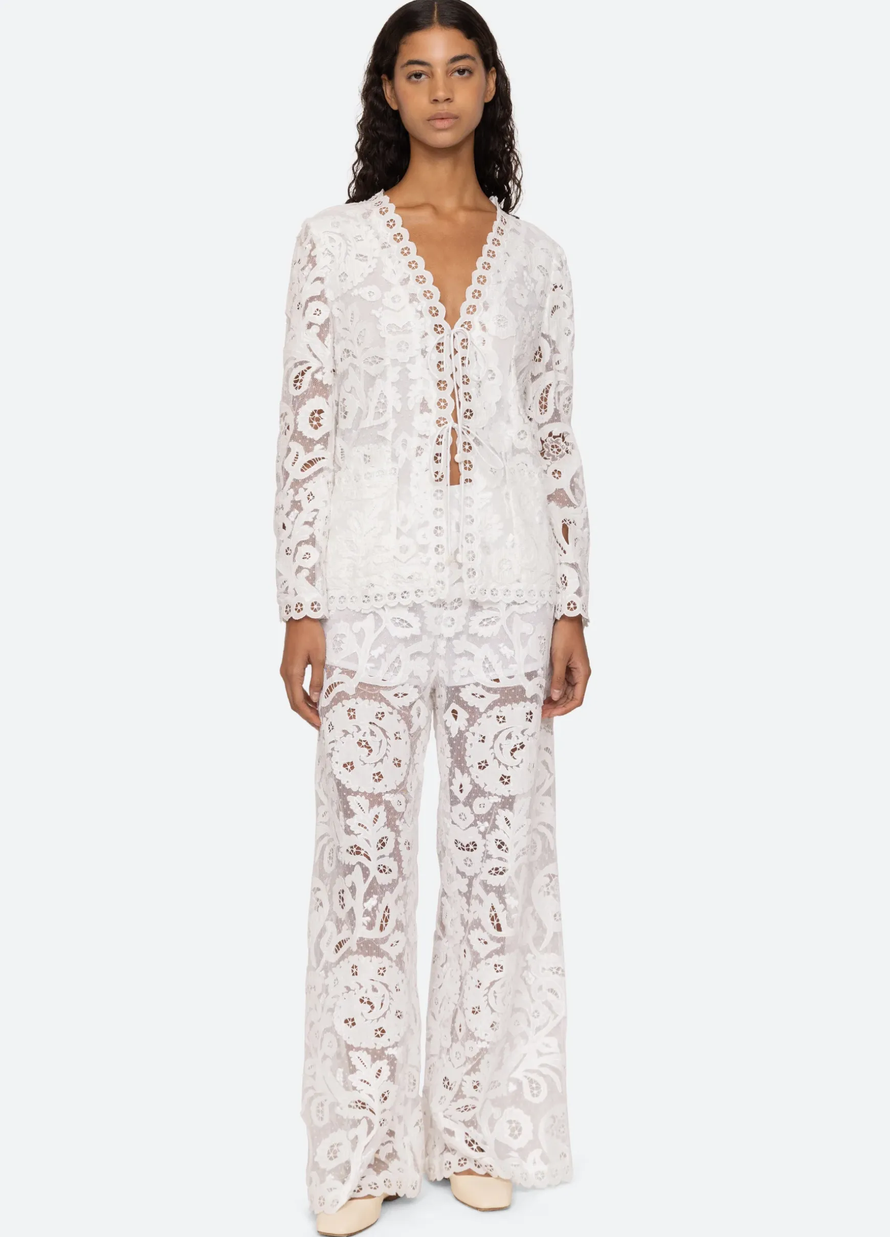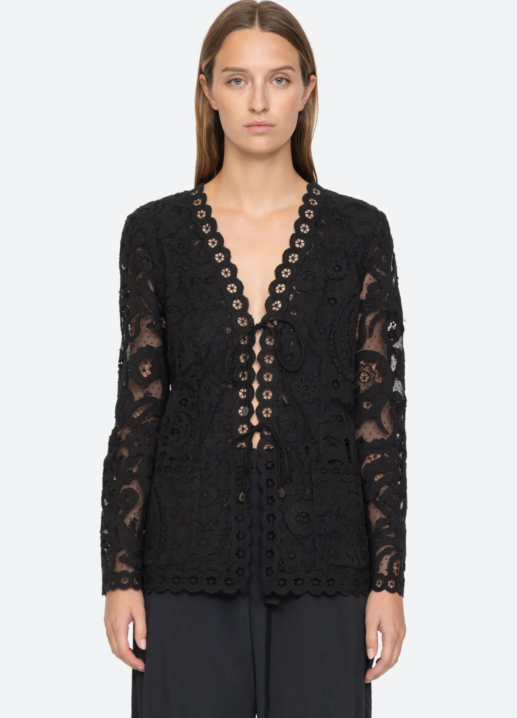 The Lovina embroidered lace jacket features delicate embroidered lace, eyelet trim and front tie closures. Designed for an easy, relaxed fit.