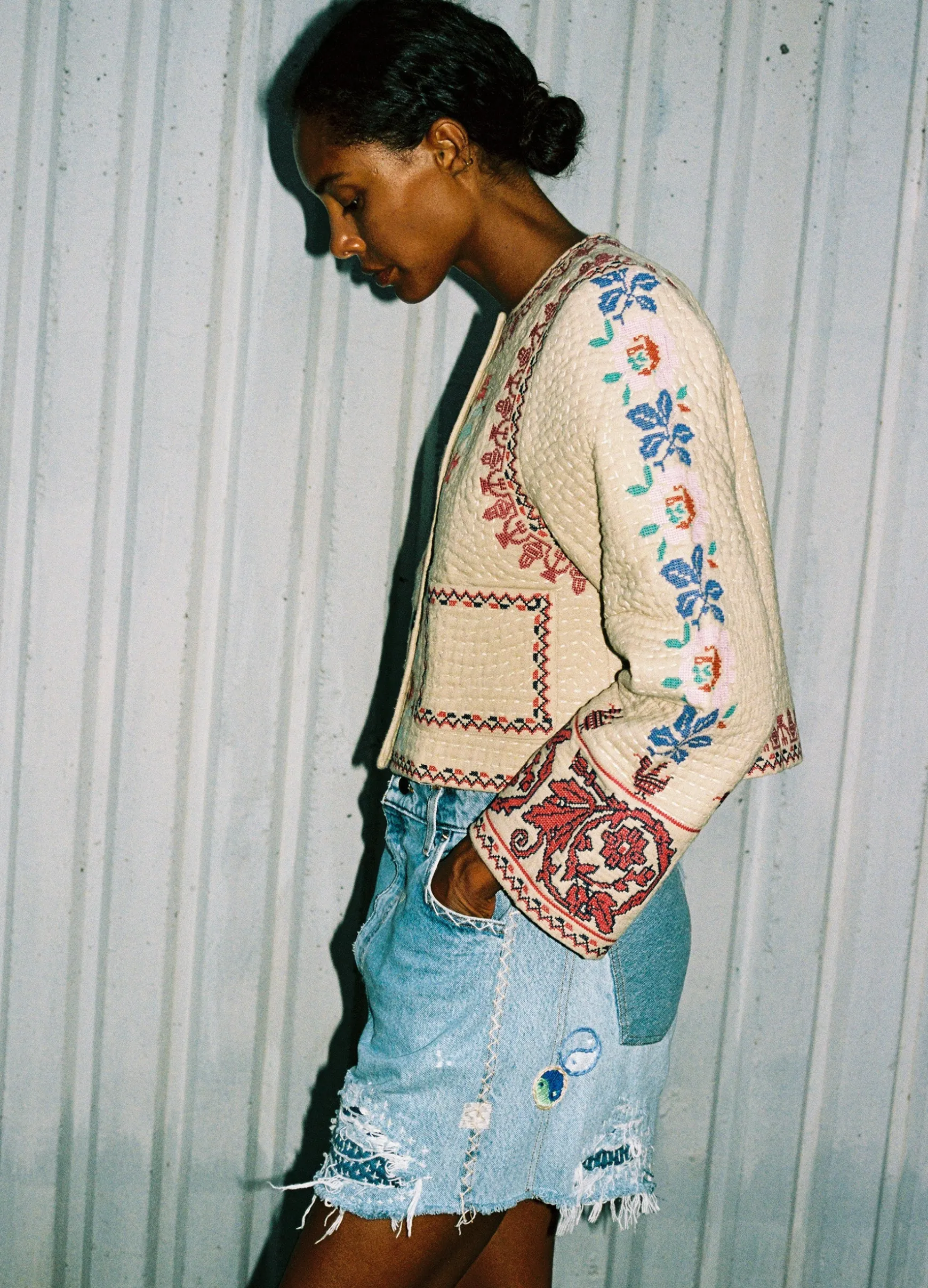 The Ramona embroidered jacket features cross stitch embroidery, cropped silhouette and front button closure. Designed for an easy, relaxed fit.