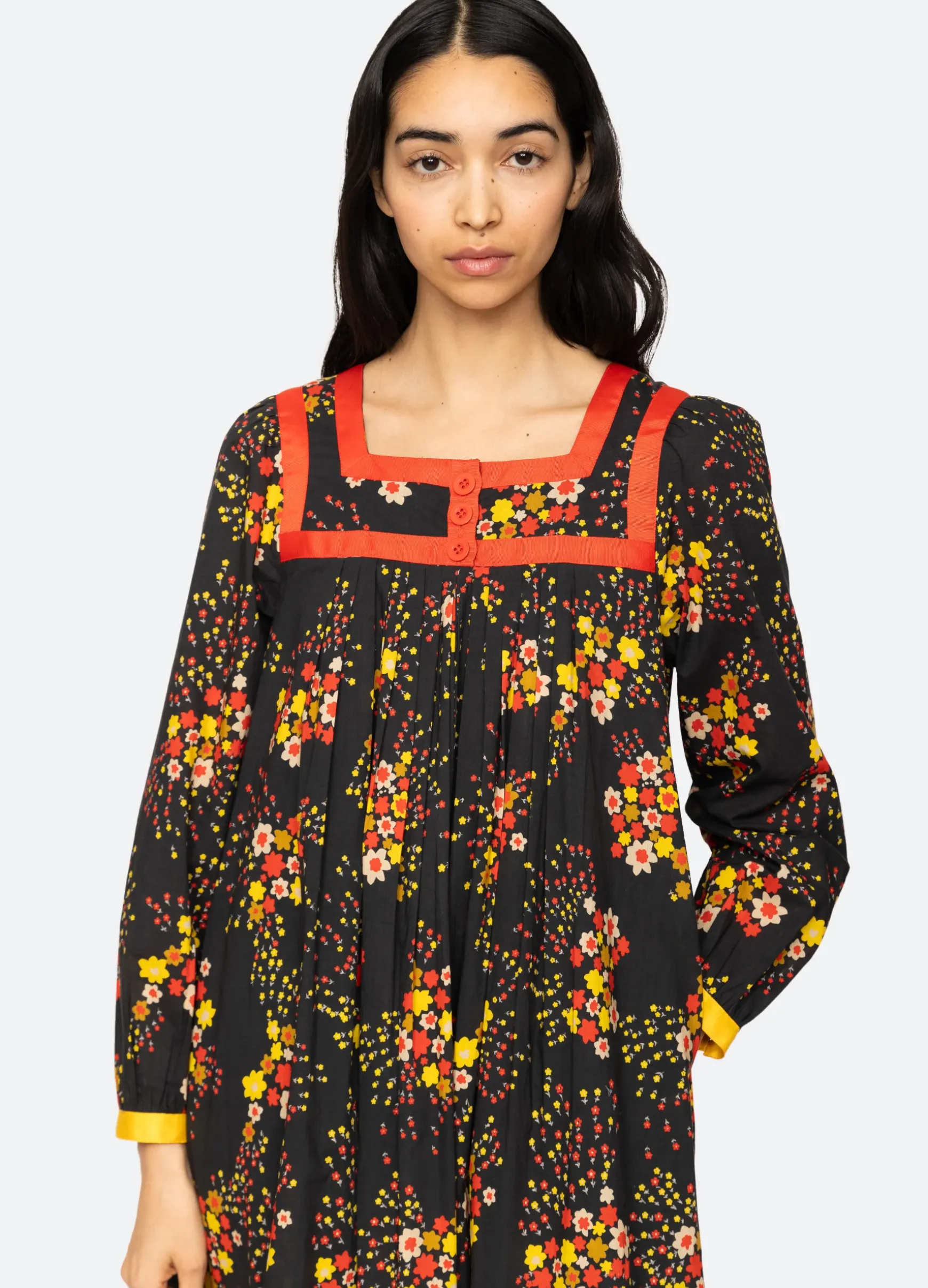 The Paloma Vintage x Sea collection was born from Monica and Ferial’s shared passion for vintage. Monica discovered Paloma Vintage on a trip to Copenhagen and immediately was drawn to the shop’s unique curation of vintage treasures. Over the years, Monica forged a friendship with Ferial which led to designing a capsule collection together inspired by Ferial’s vintage finds and unique styling sensibility. The Paloma flora dress features a square neckline, long sleeves and solid trim detailing. Designed for an oversized fit.