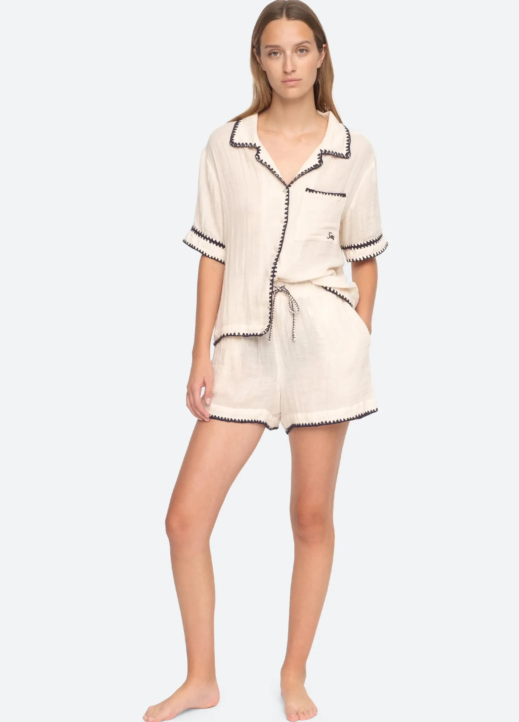The Desiree double gauze pajama set features crochet detailing and an embroidered “Sea” logo on the pocket. Designed for an easy, relaxed fit.