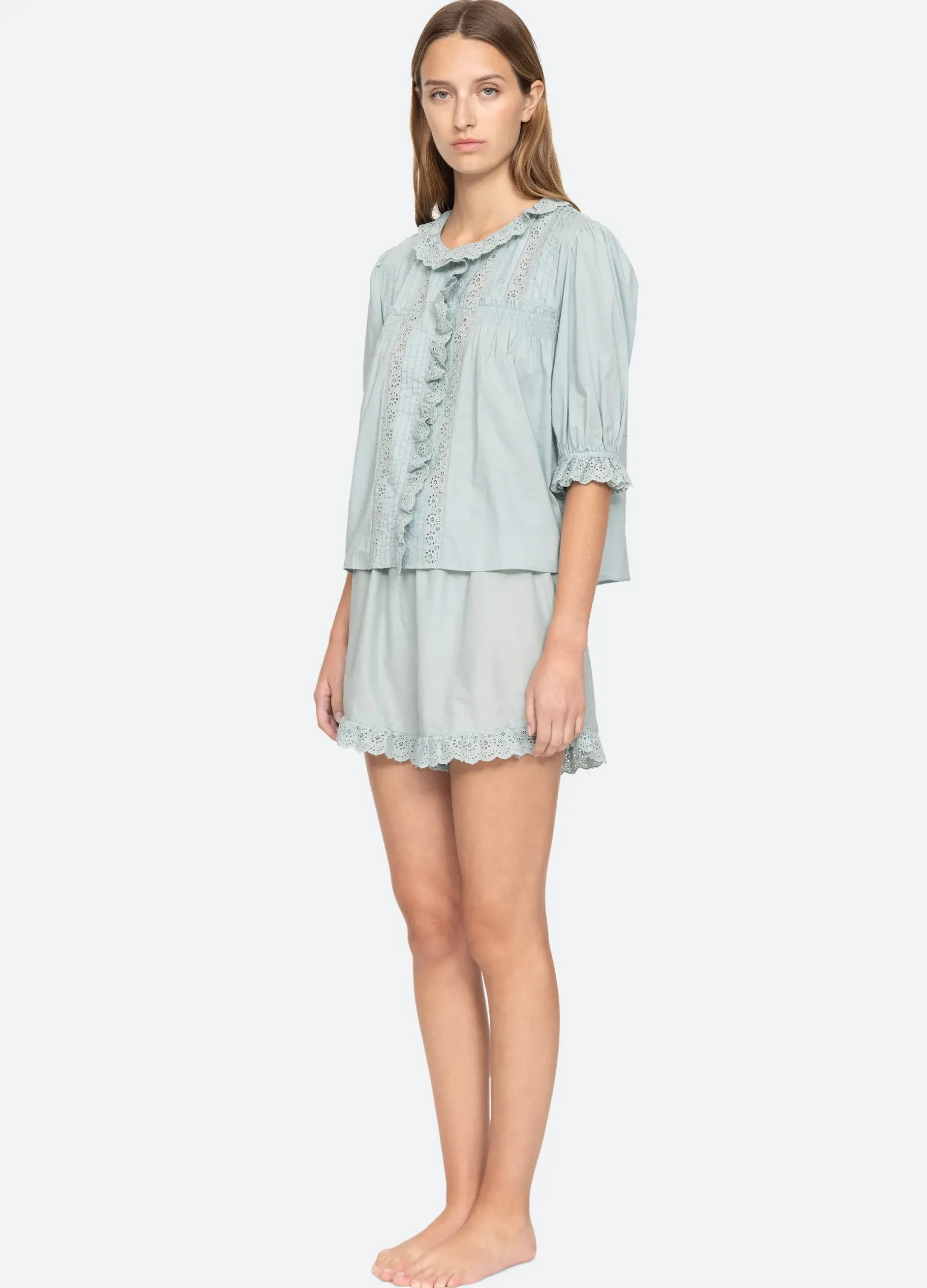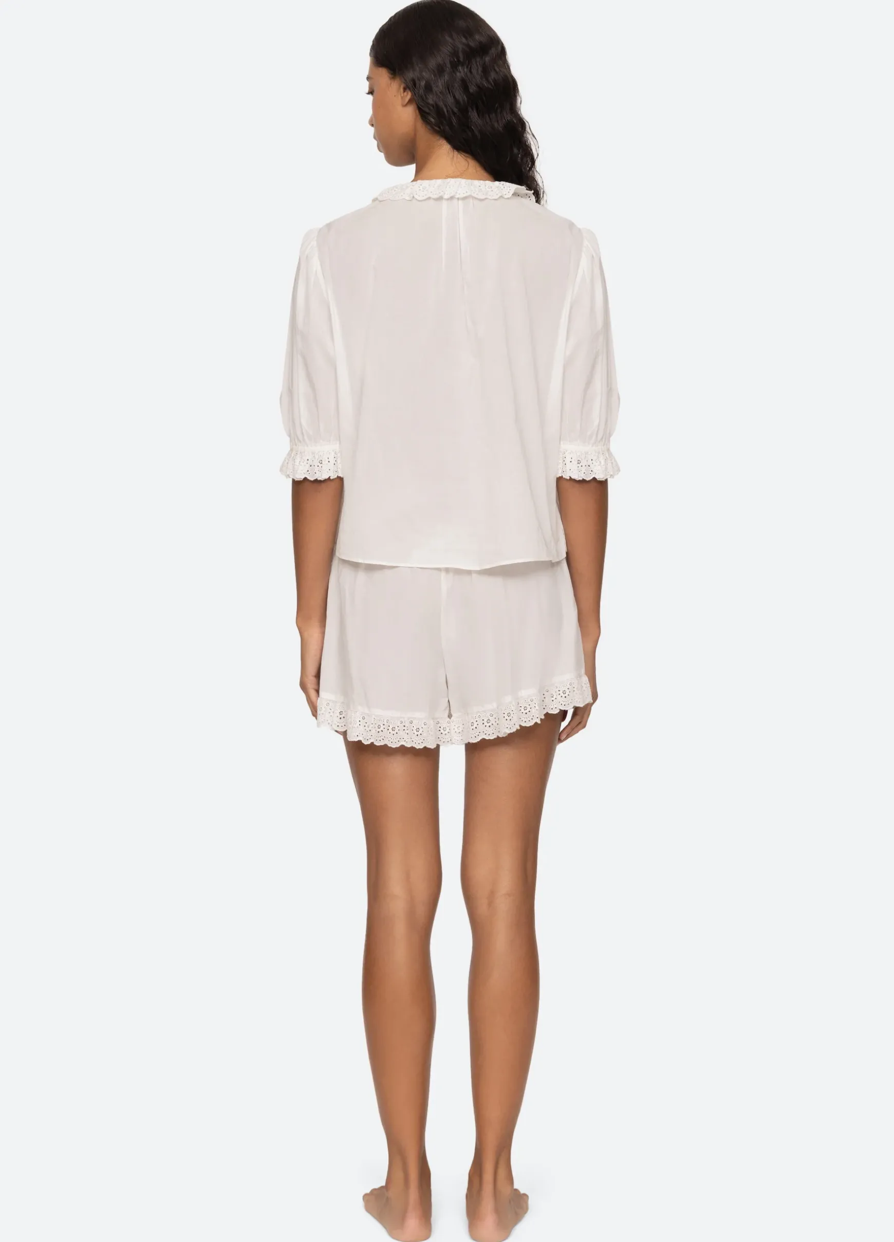 The Elysse embroidered pajama set features puff sleeves and eyelet trim detailing. Designed for an easy, relaxed fit.