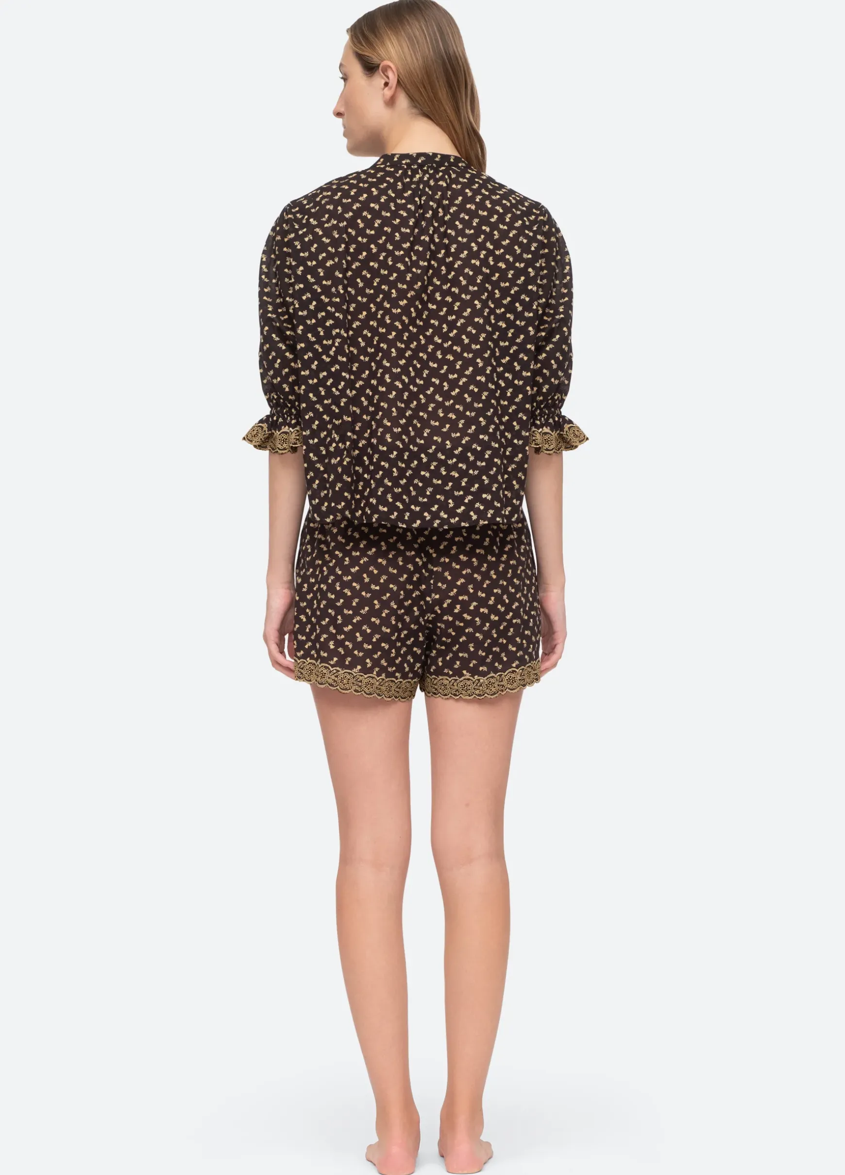 The Rosa embroidery pajama set features puff sleeves and embroidery trim detailing.