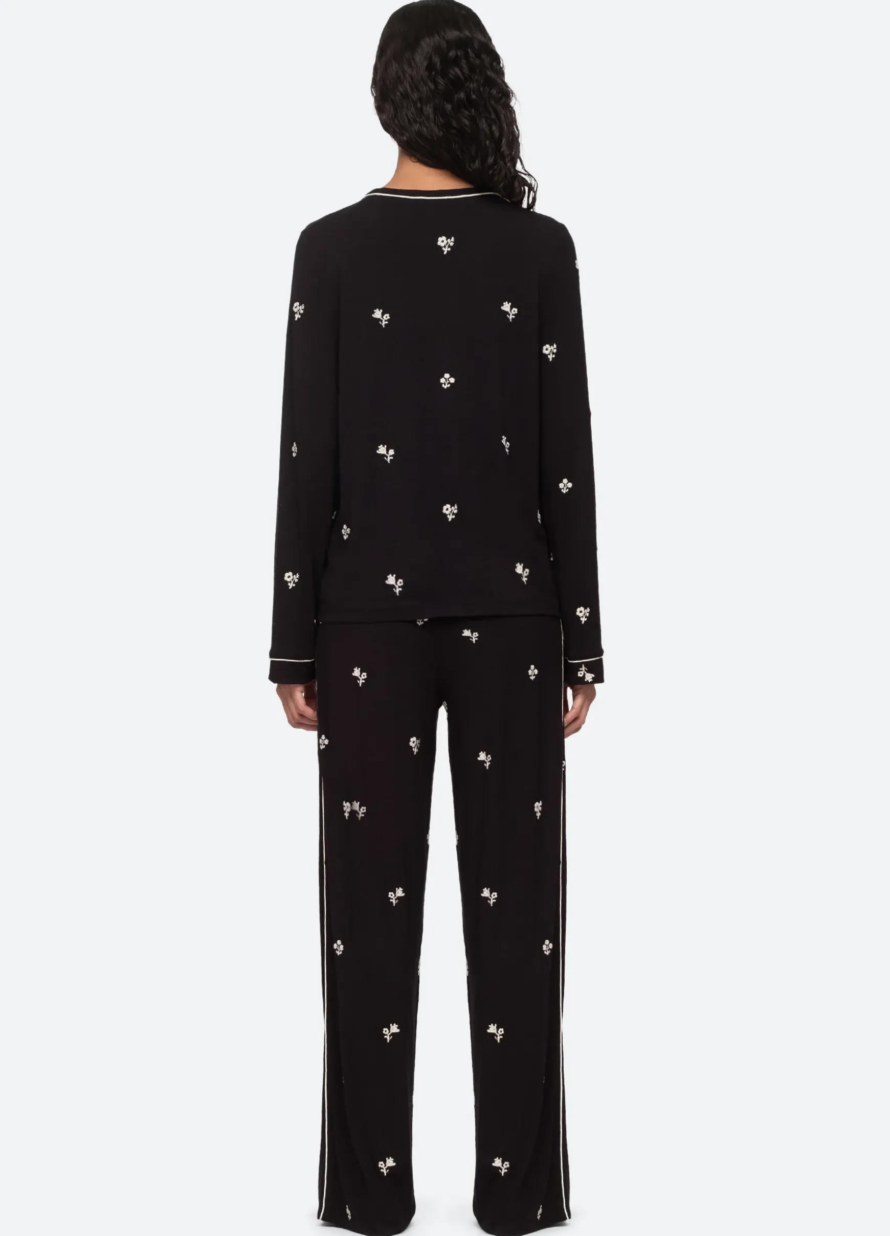 The Rubina embroidery long pajama set features floral embroidery and a round neckline.