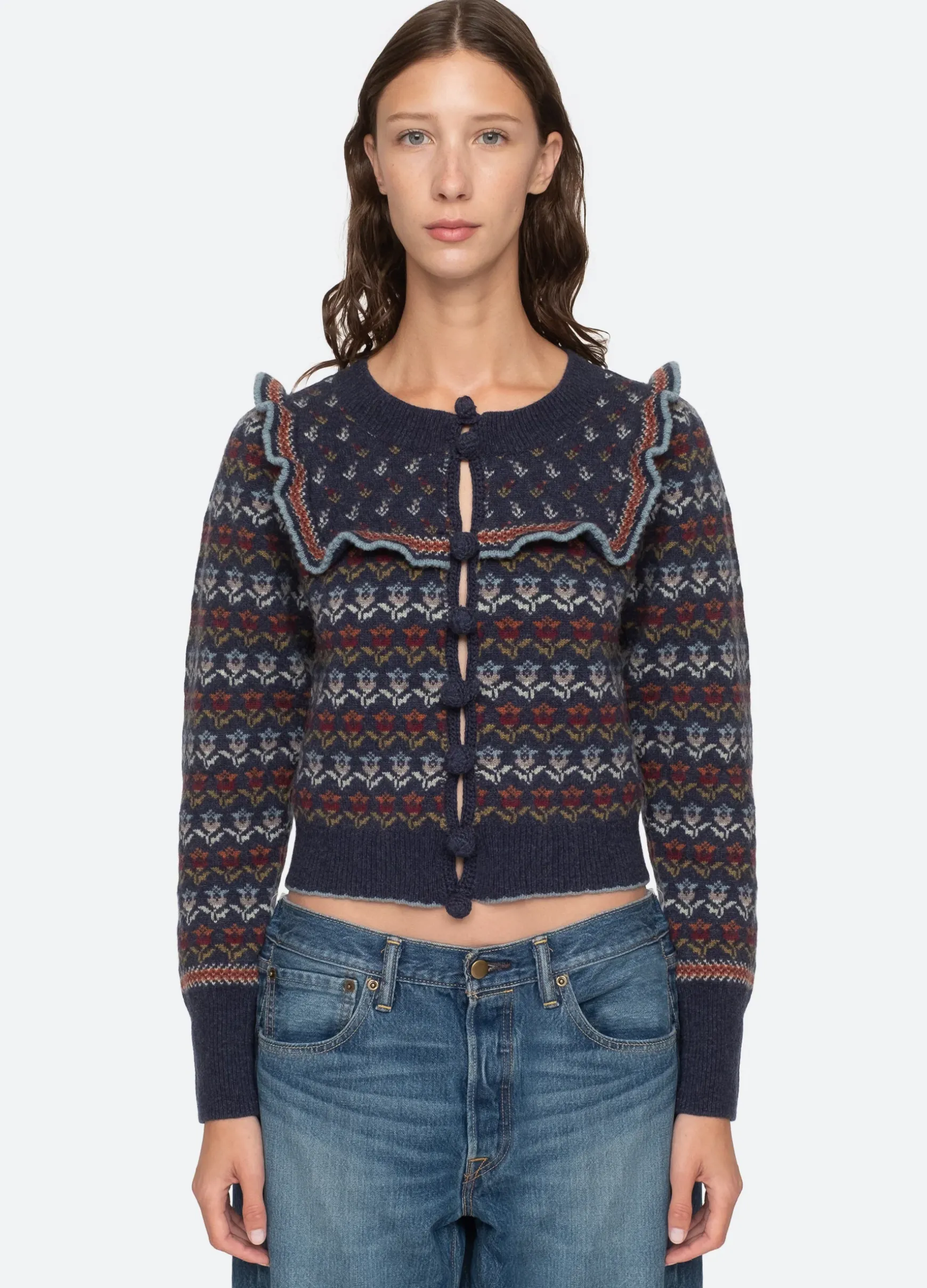 The Anna long sleeve cardigan features a ruffle bib and multi colored floral motif.