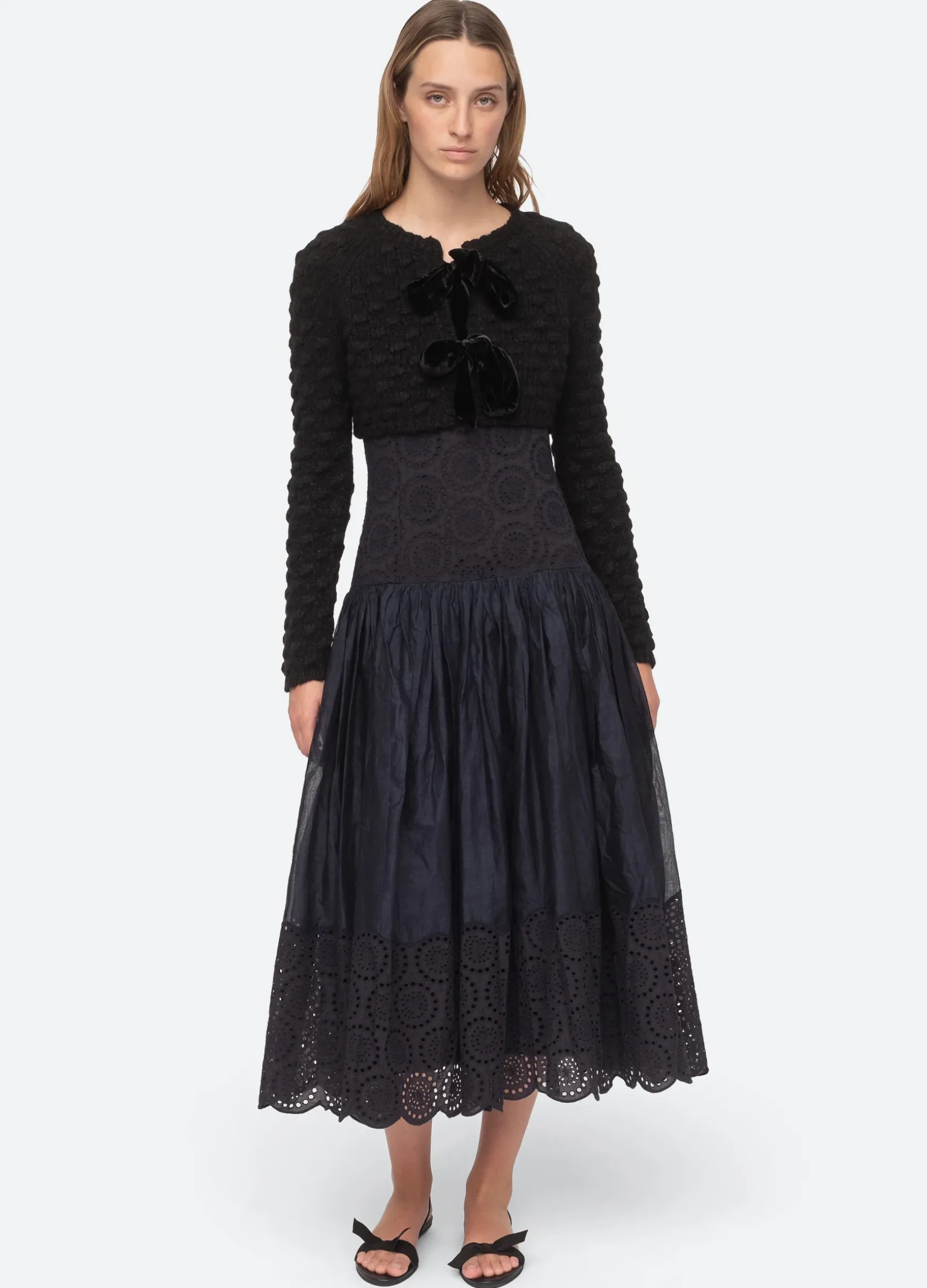 The Teresa bow tie cropped cardigan with long sleeves features velvet bow ties.