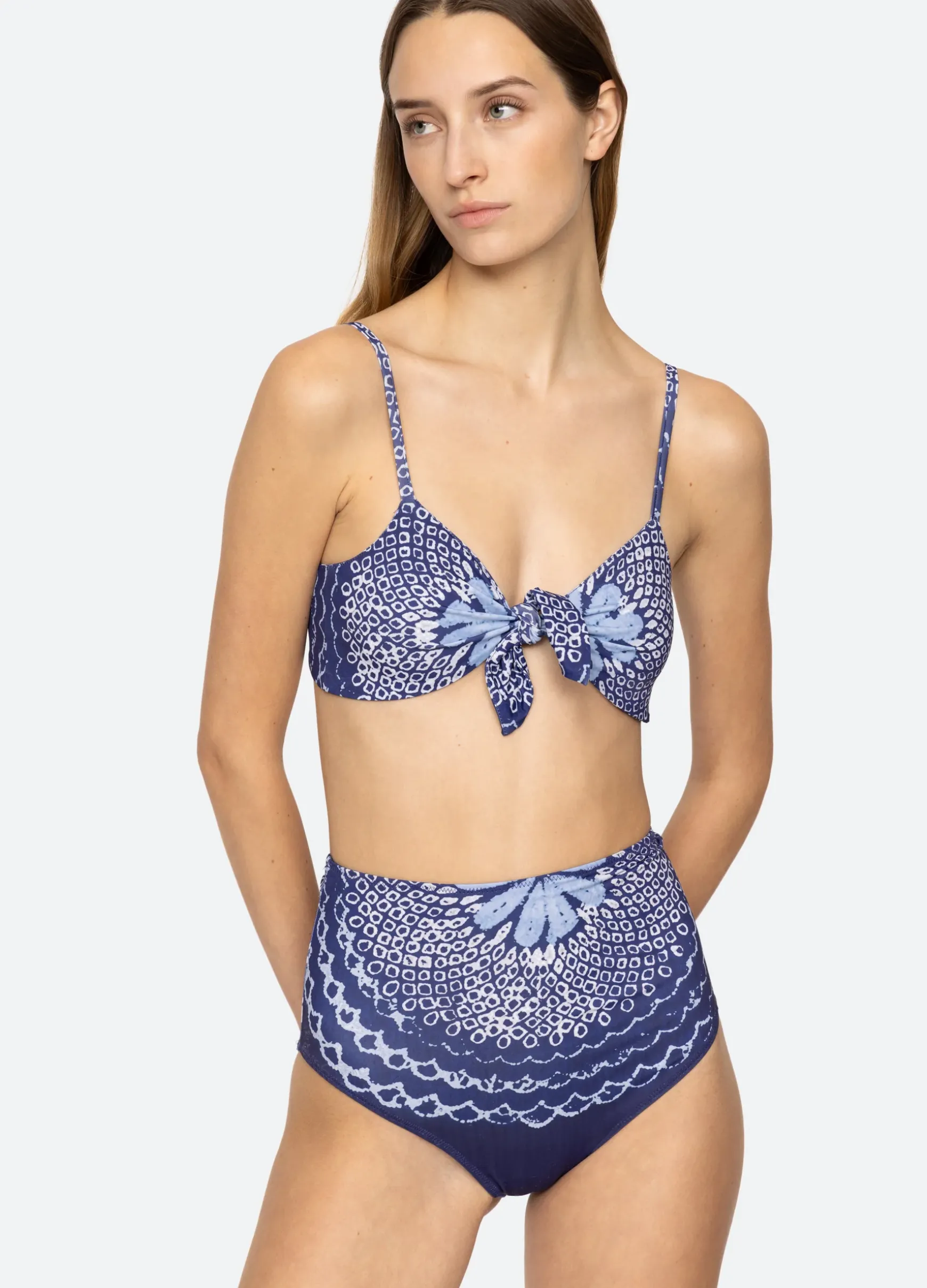 The Blythe tie dye bikini top features a front tie, clasp fastening at back and abstract print.
