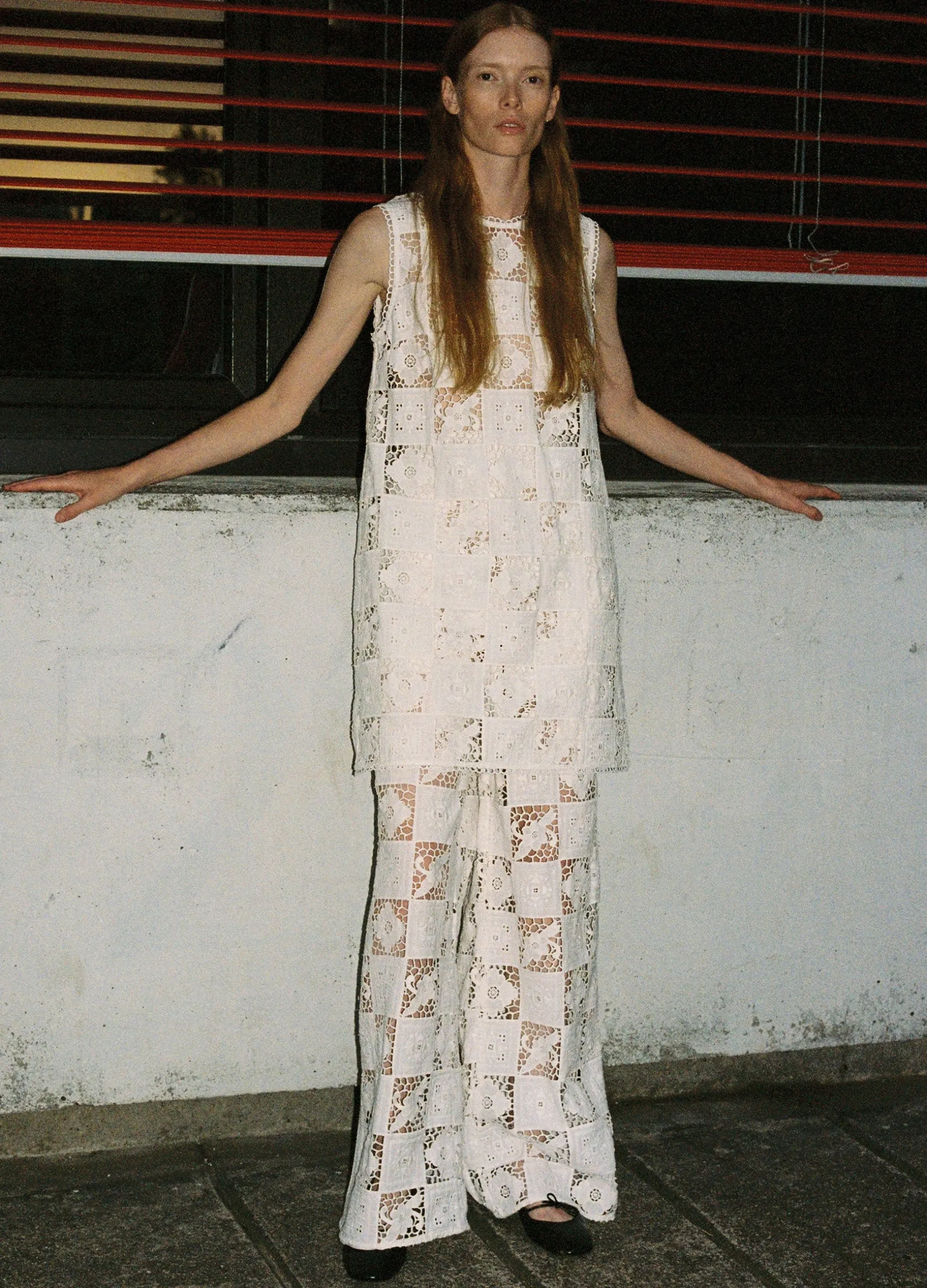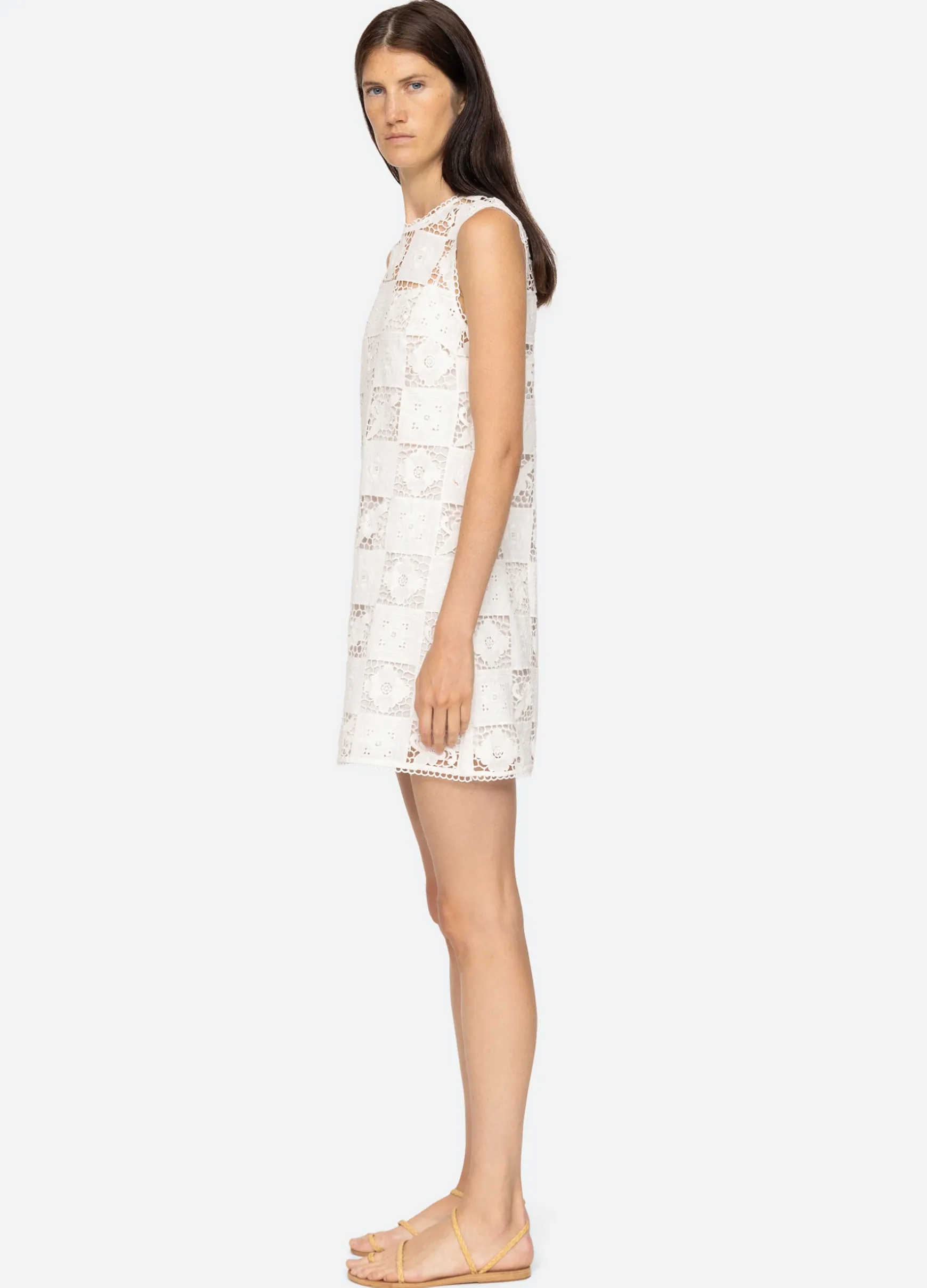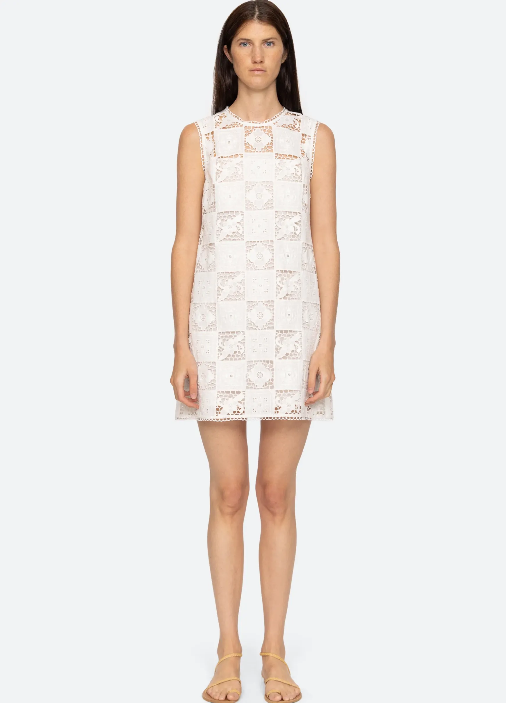 The Melia embroidered tank dress features a floral embroidered patchwork design and mini silhouette.