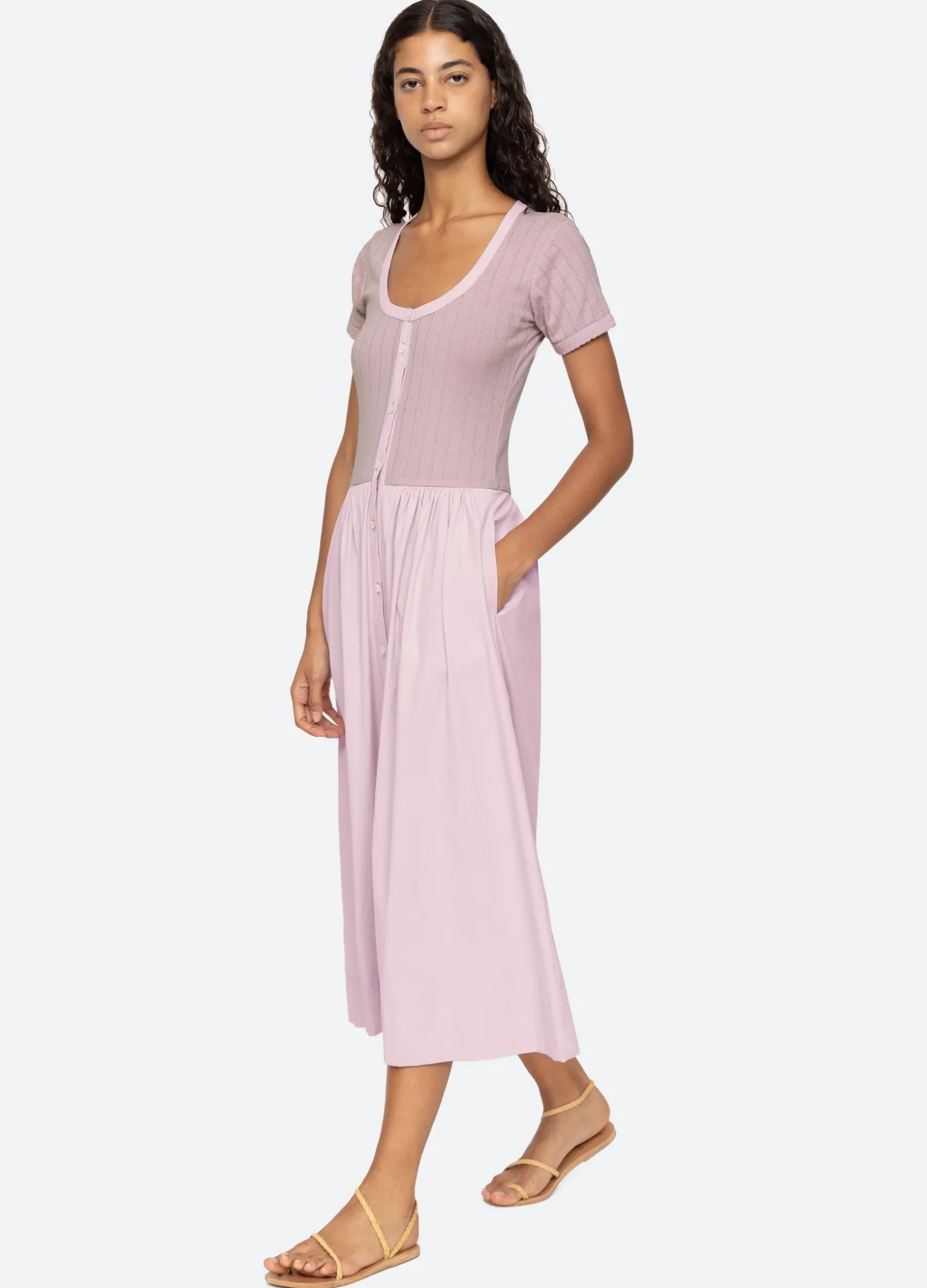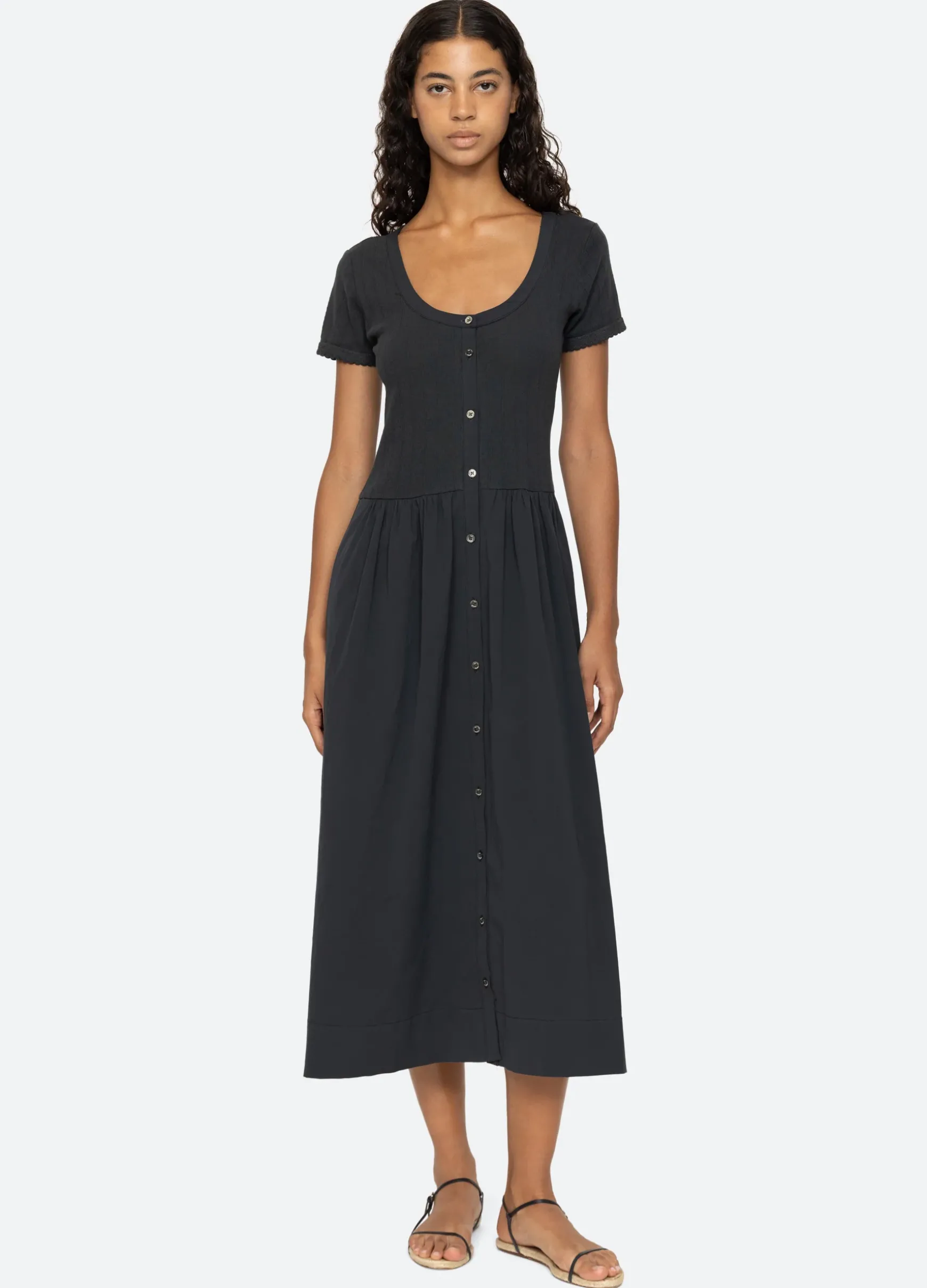 The Salome dress features short sleeves, ribbed bodice and button front closure.