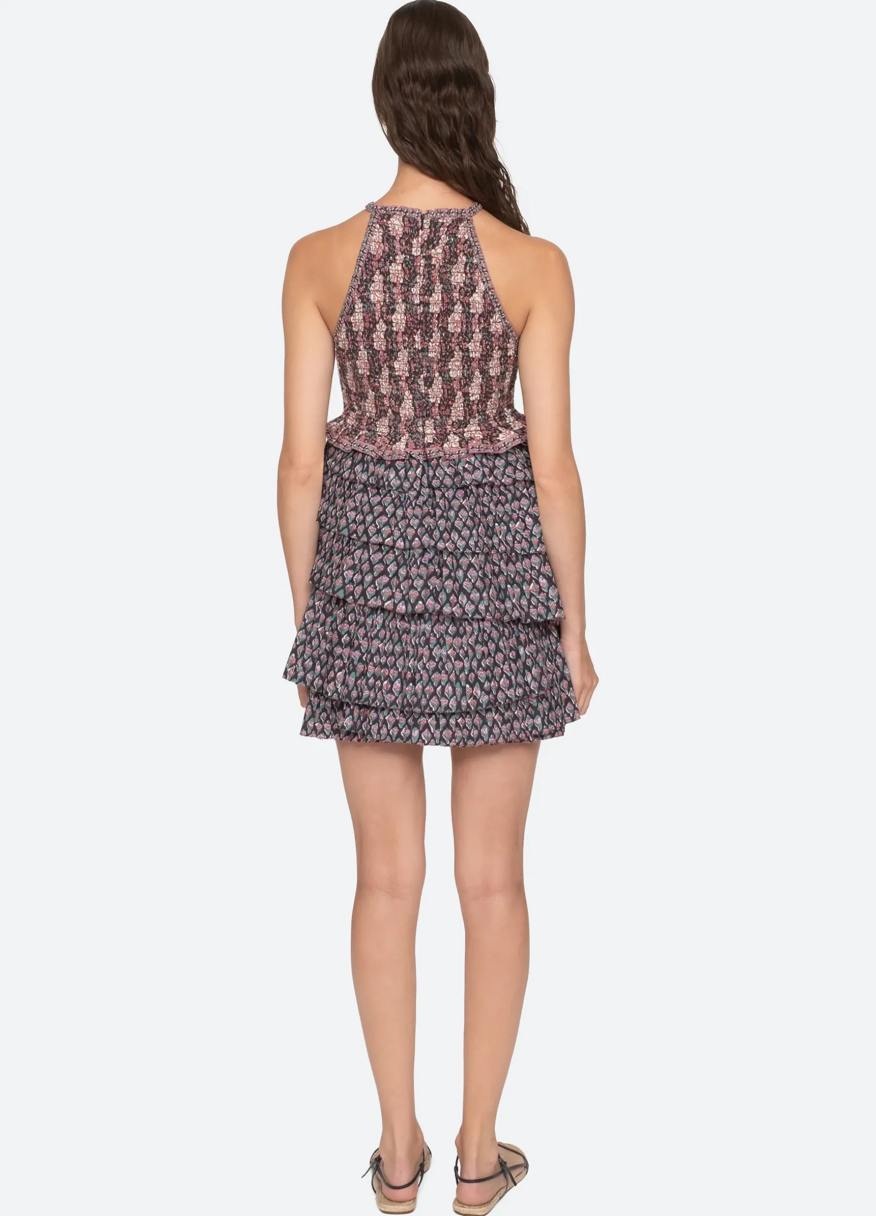 The Donna mix-up floral print tiered dress features a smocked bodice with cutout accent and asymmetrical tiered skirt.