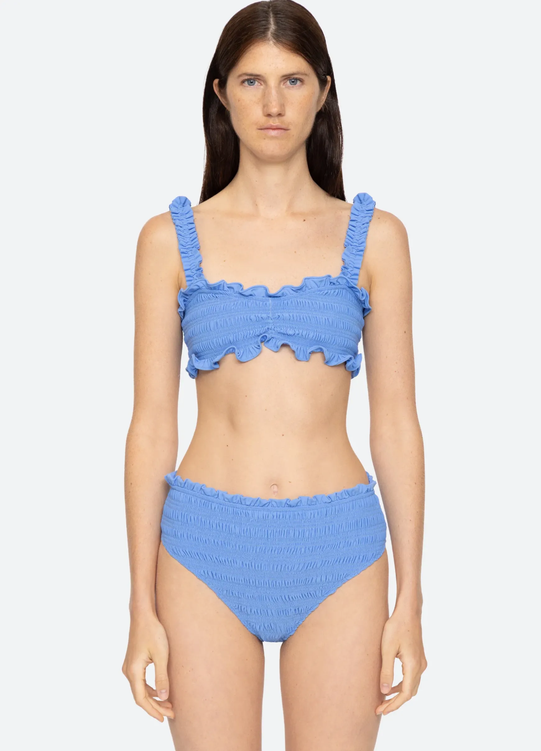 The Brice solid smocked ruffled bikini top features ruffle detailing and ruched straps.