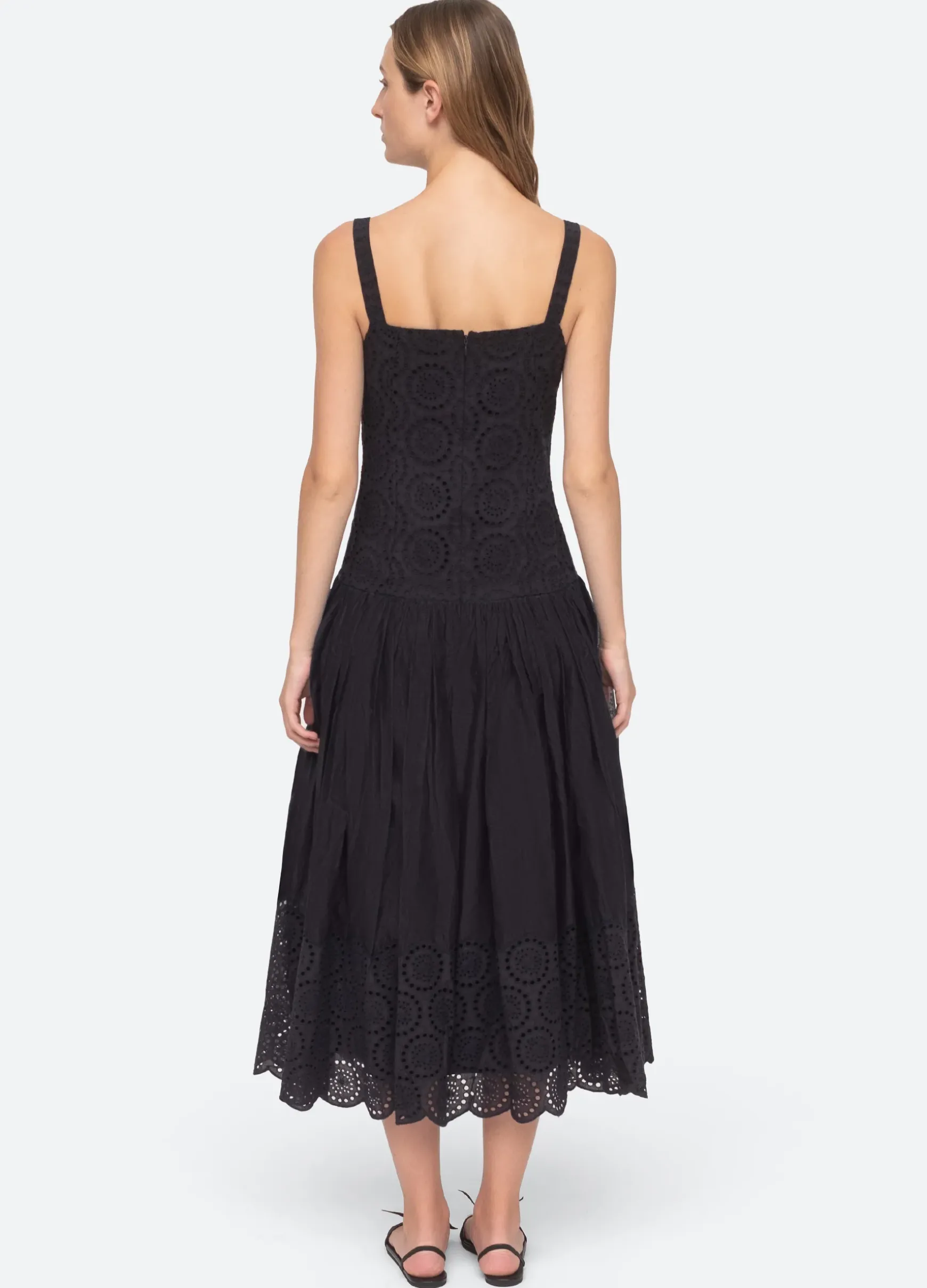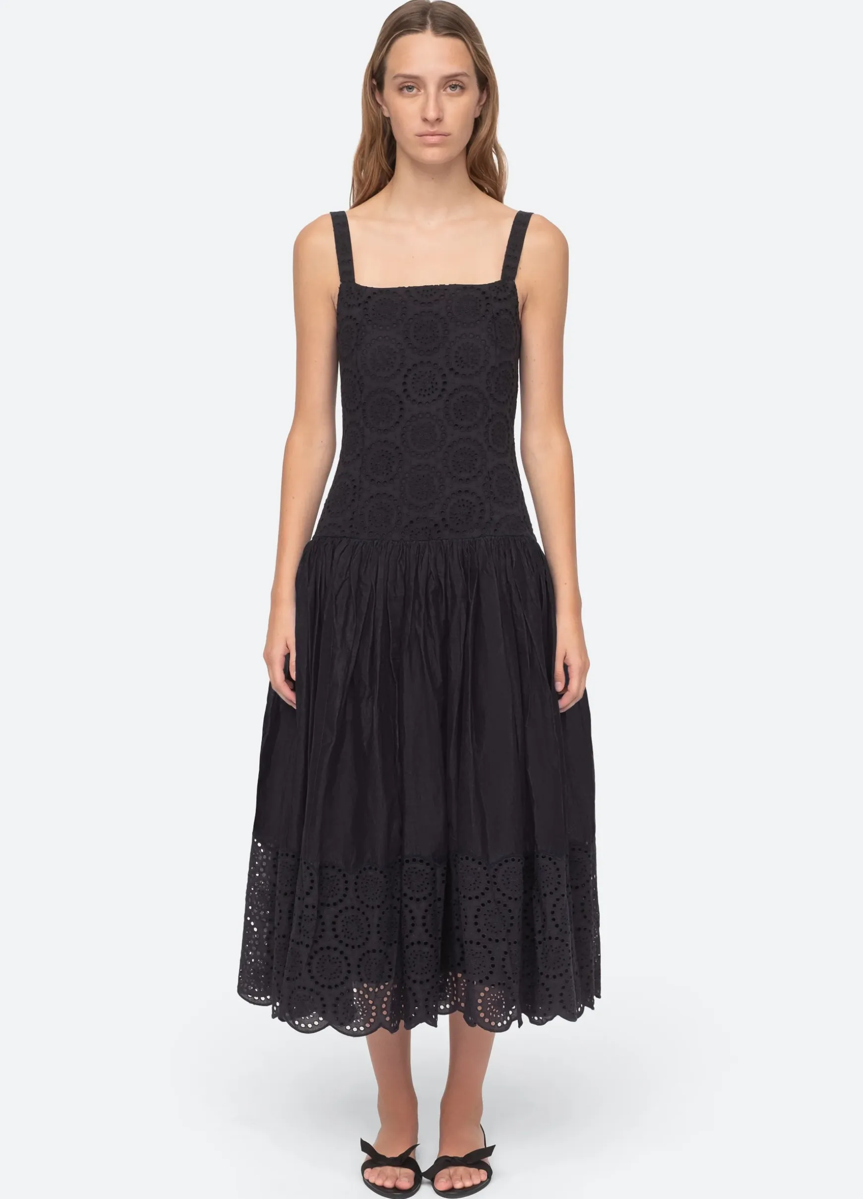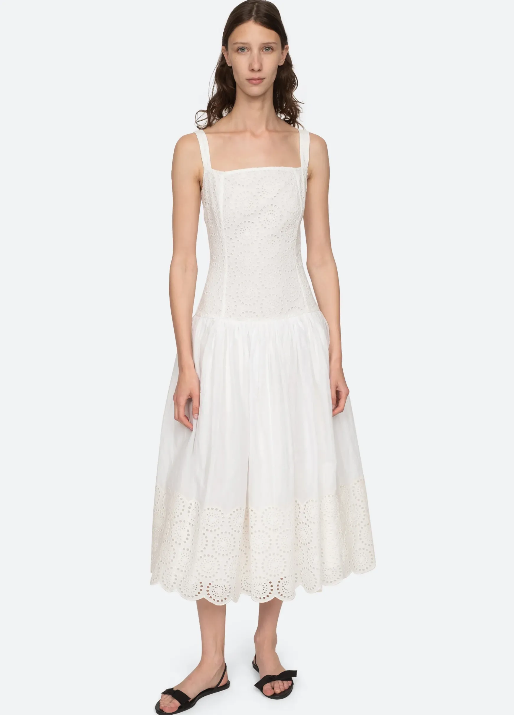 The Maeve eyelet dress features a dropped waist silhouette with full skirt.