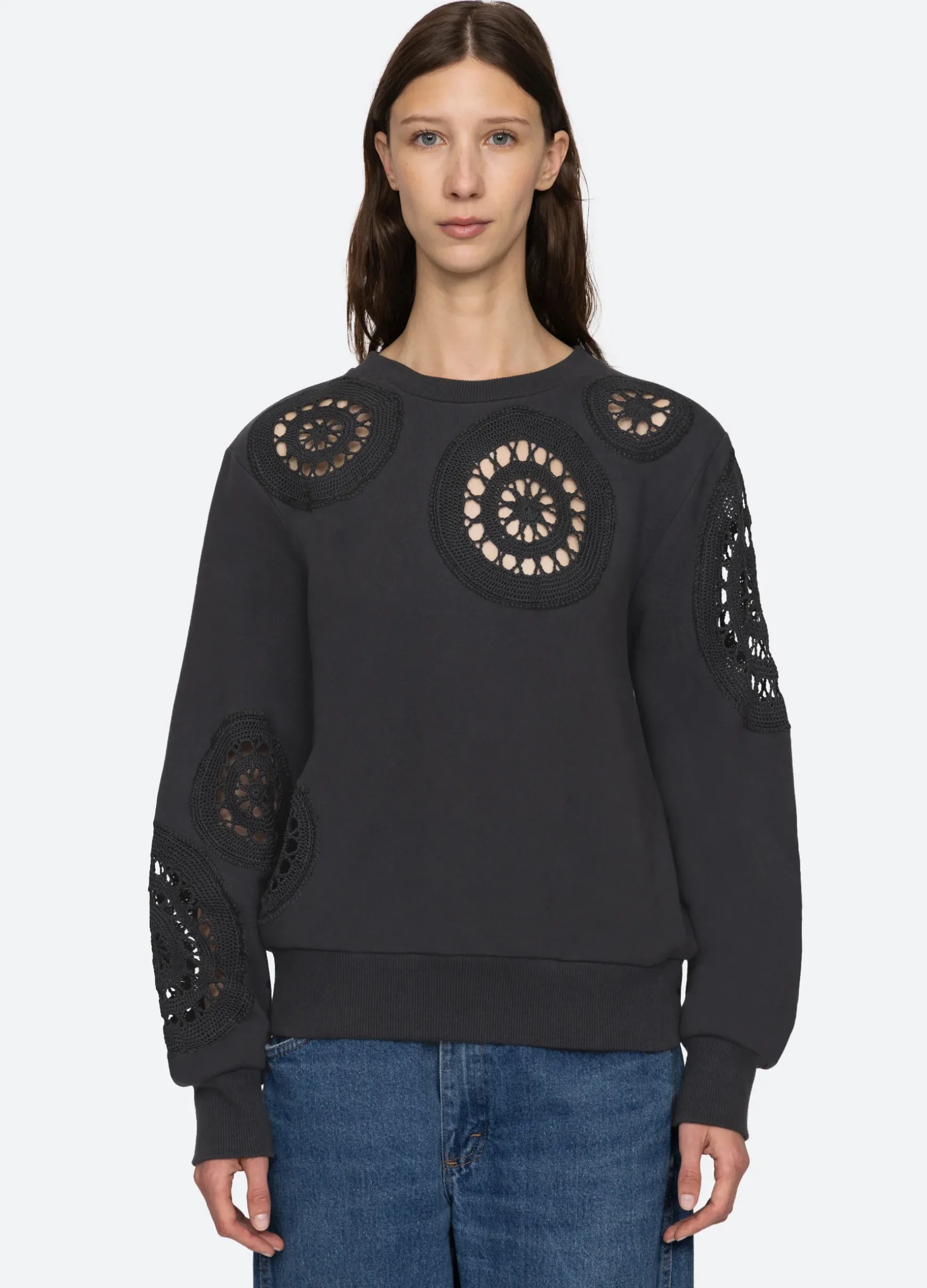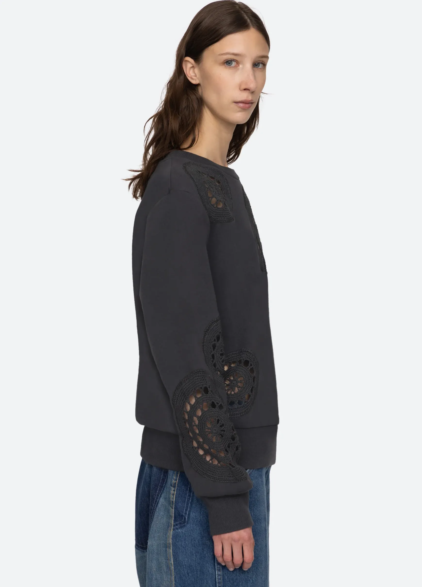 The Joy sweatshirt features crochet inserts throughout.
