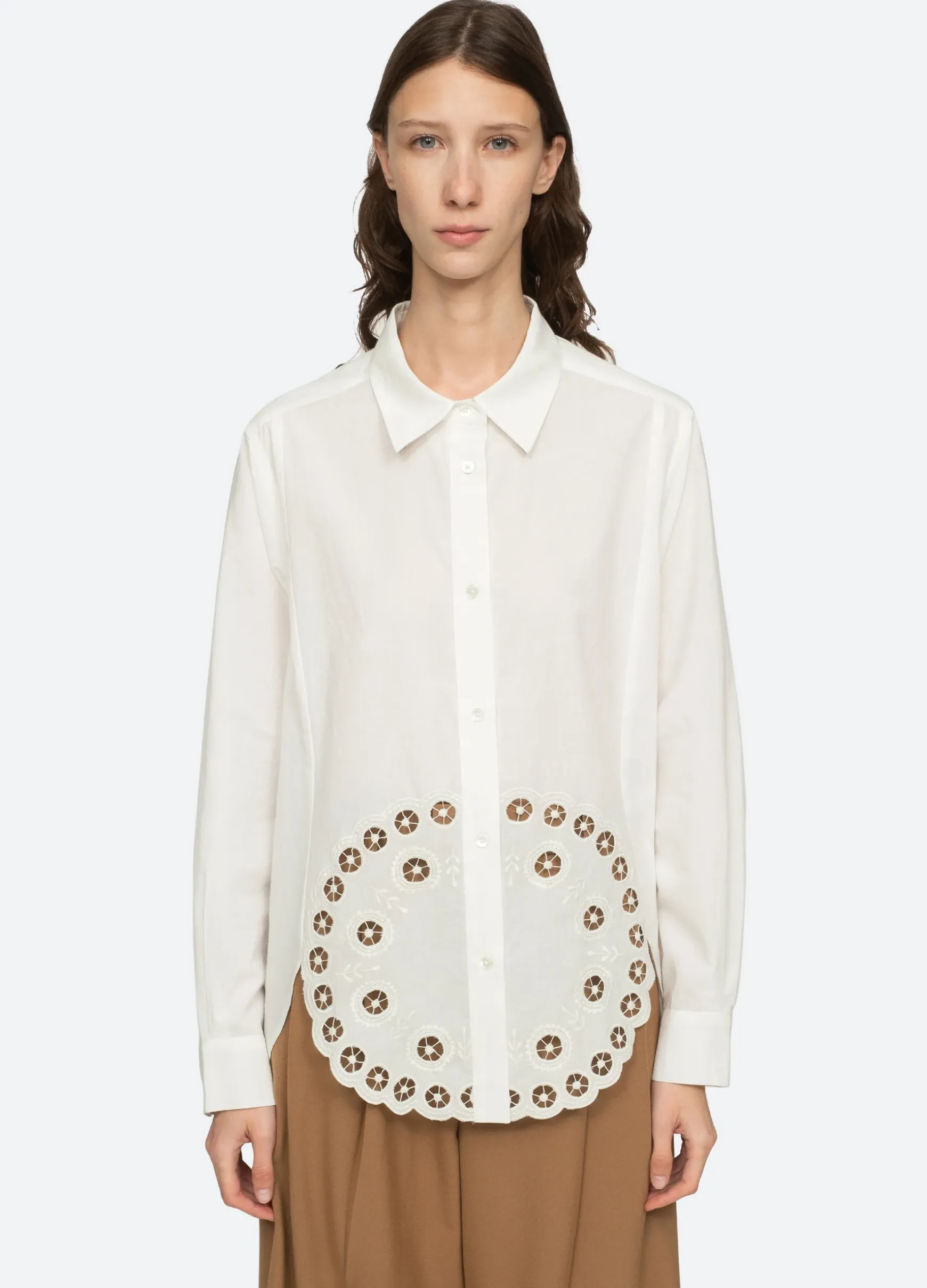 The Arabella eyelet embroidered button down top features eyelet embroidery and high low hem.