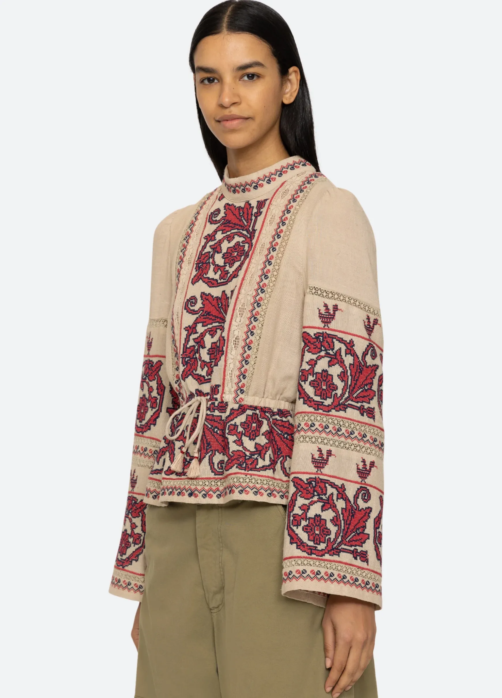 The Beena embroidered long sleeve top features a high neckline, front adjustable waist tie and cross stitching embroidery throughout.