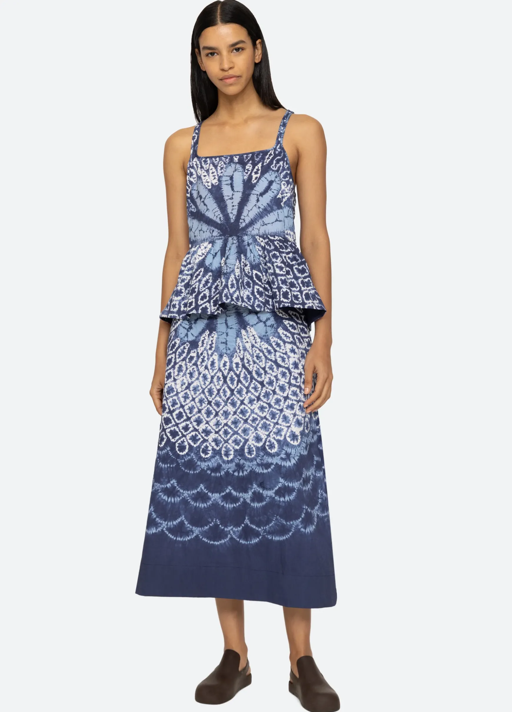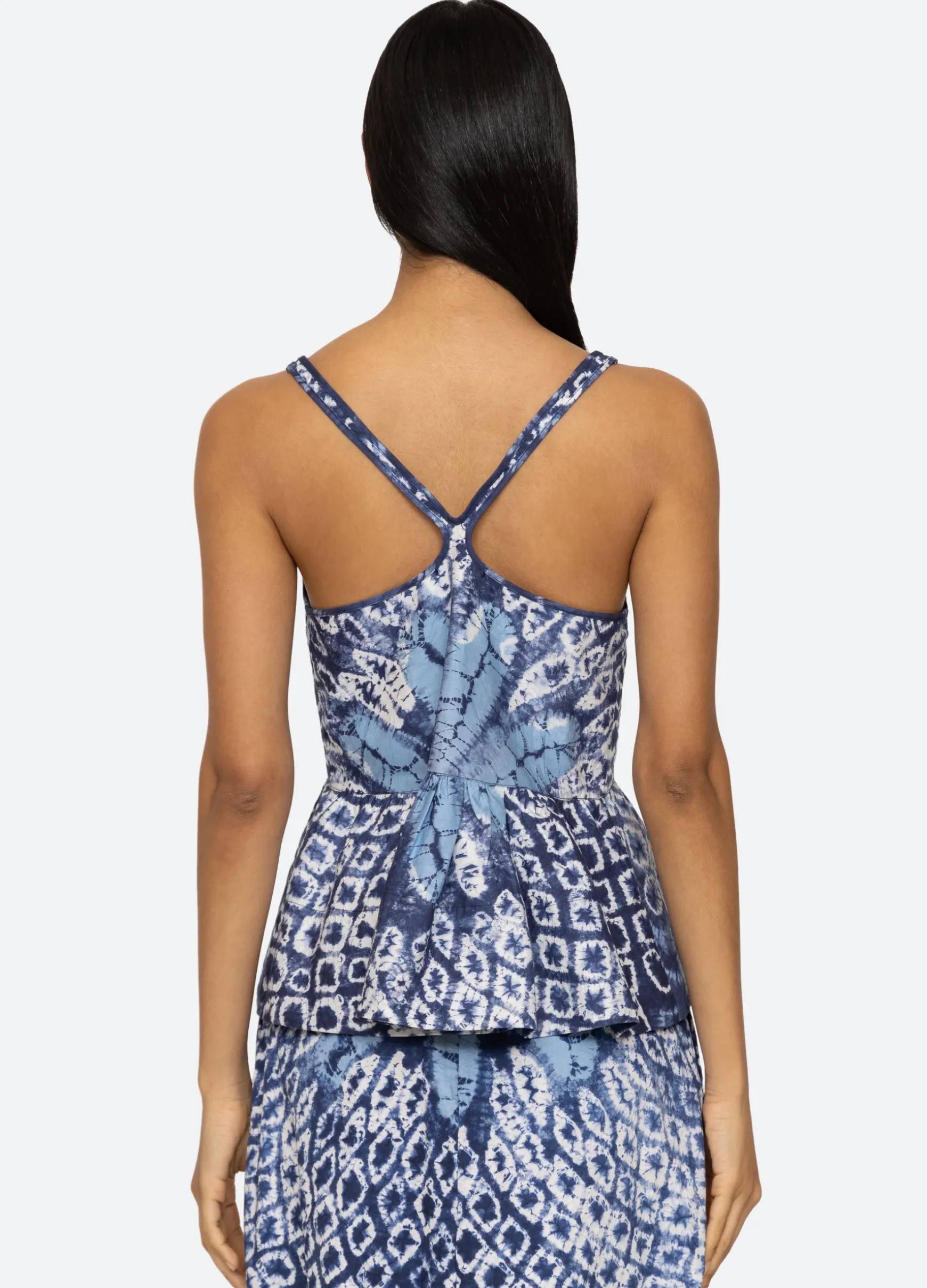 The Blythe tie dye print cami tank features a peplum hem and abstract design.