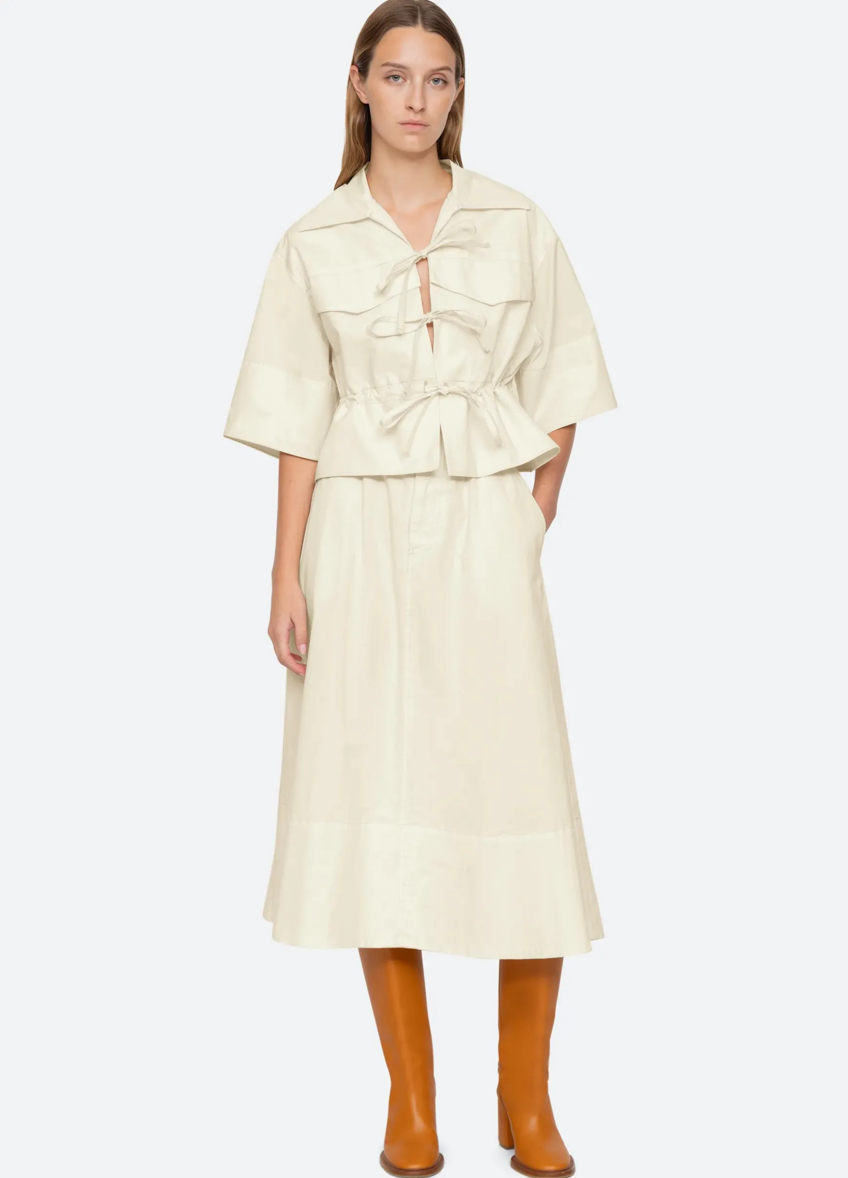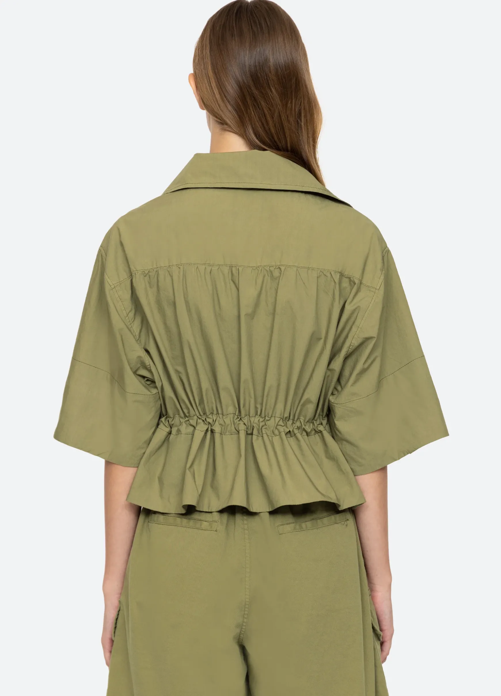 The Karina tie front top features voluminous sleeves, elasticized waist and front tie closures.