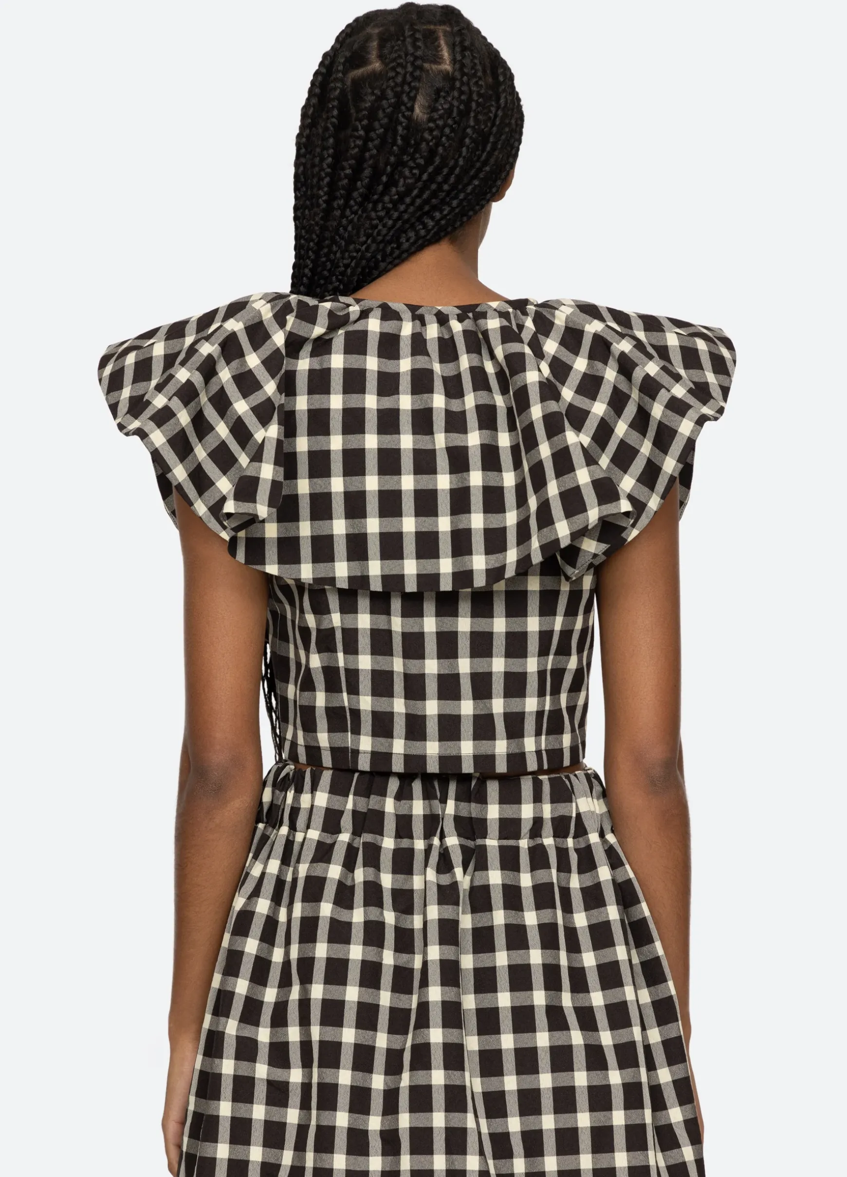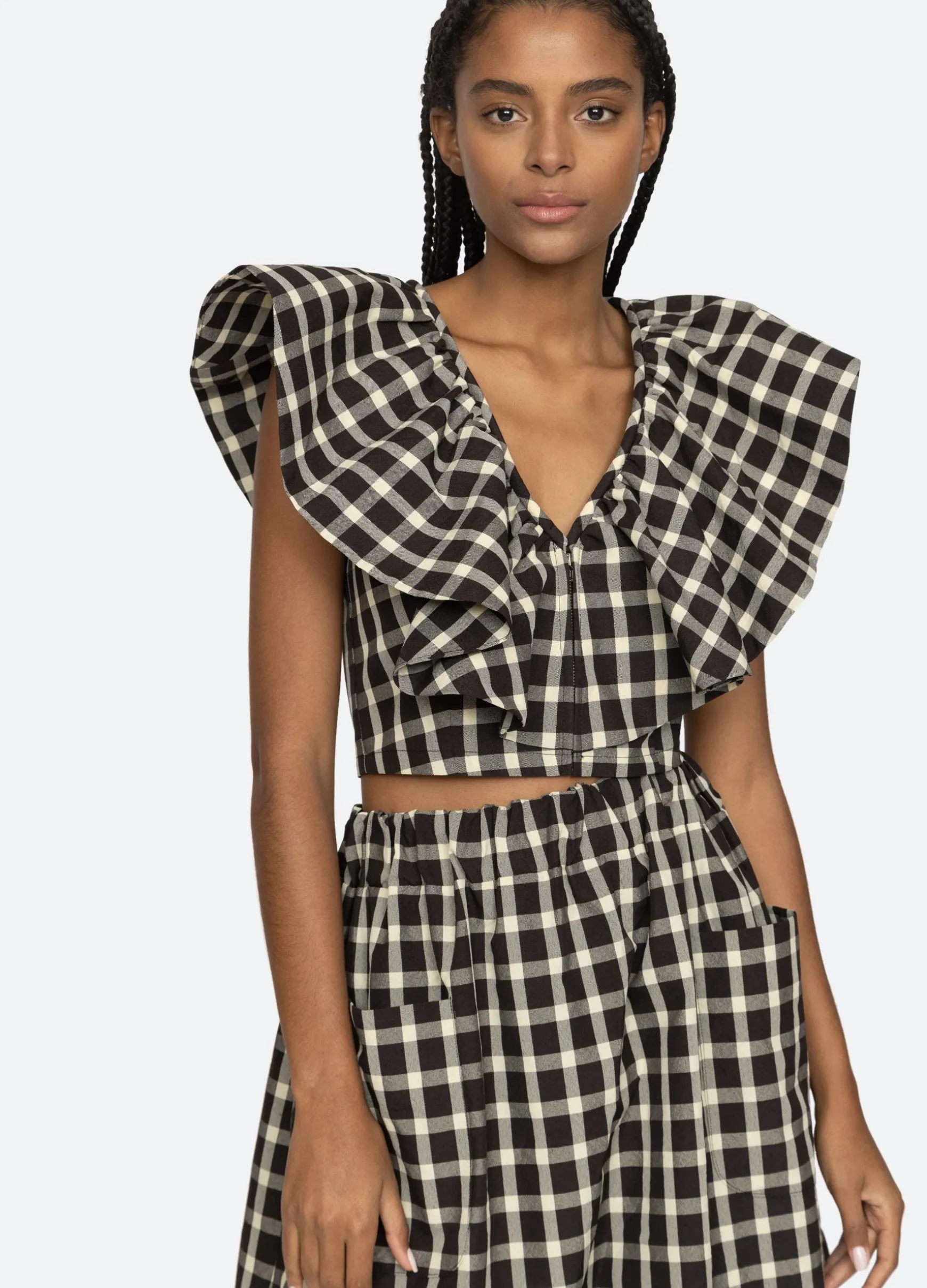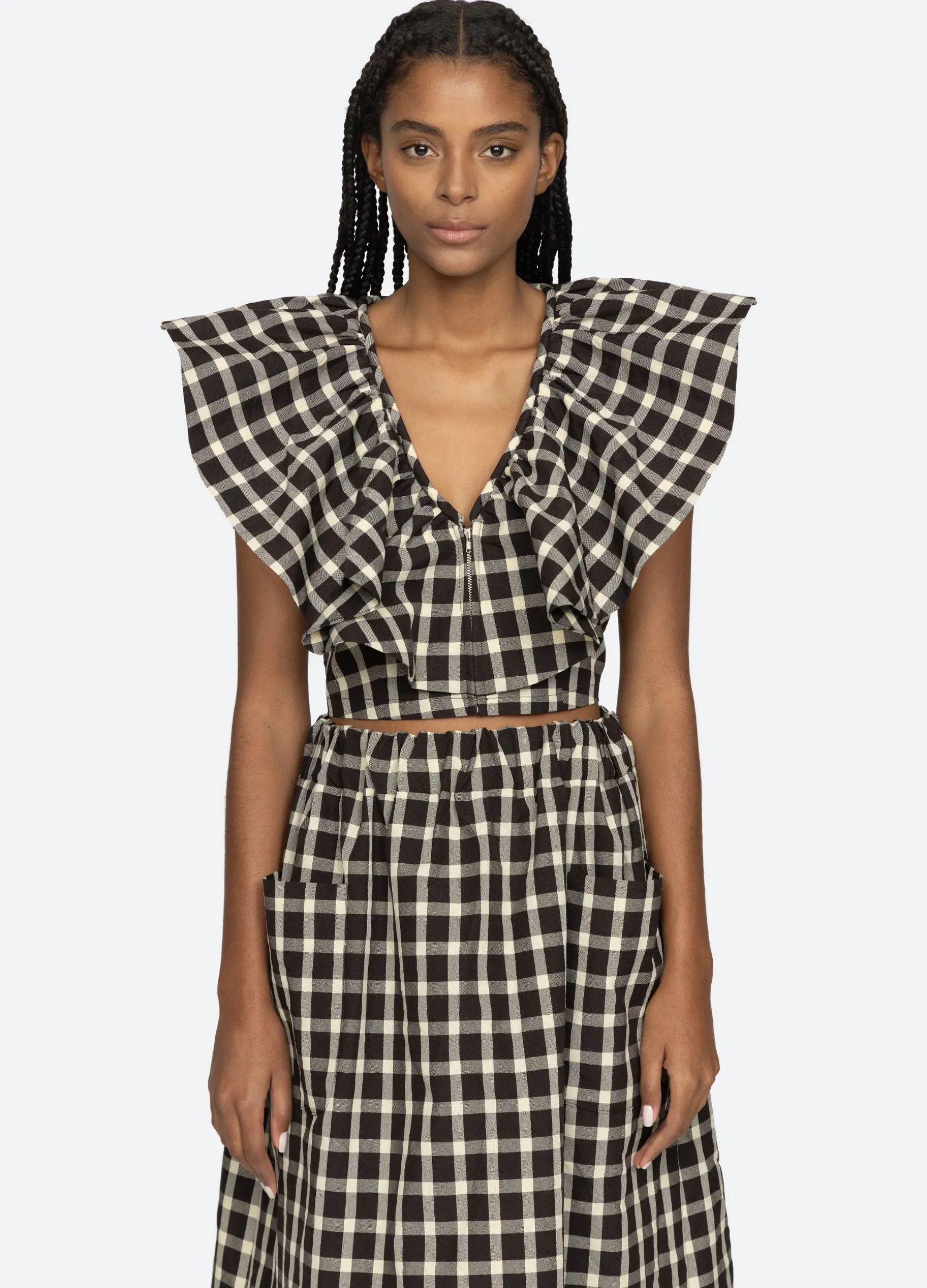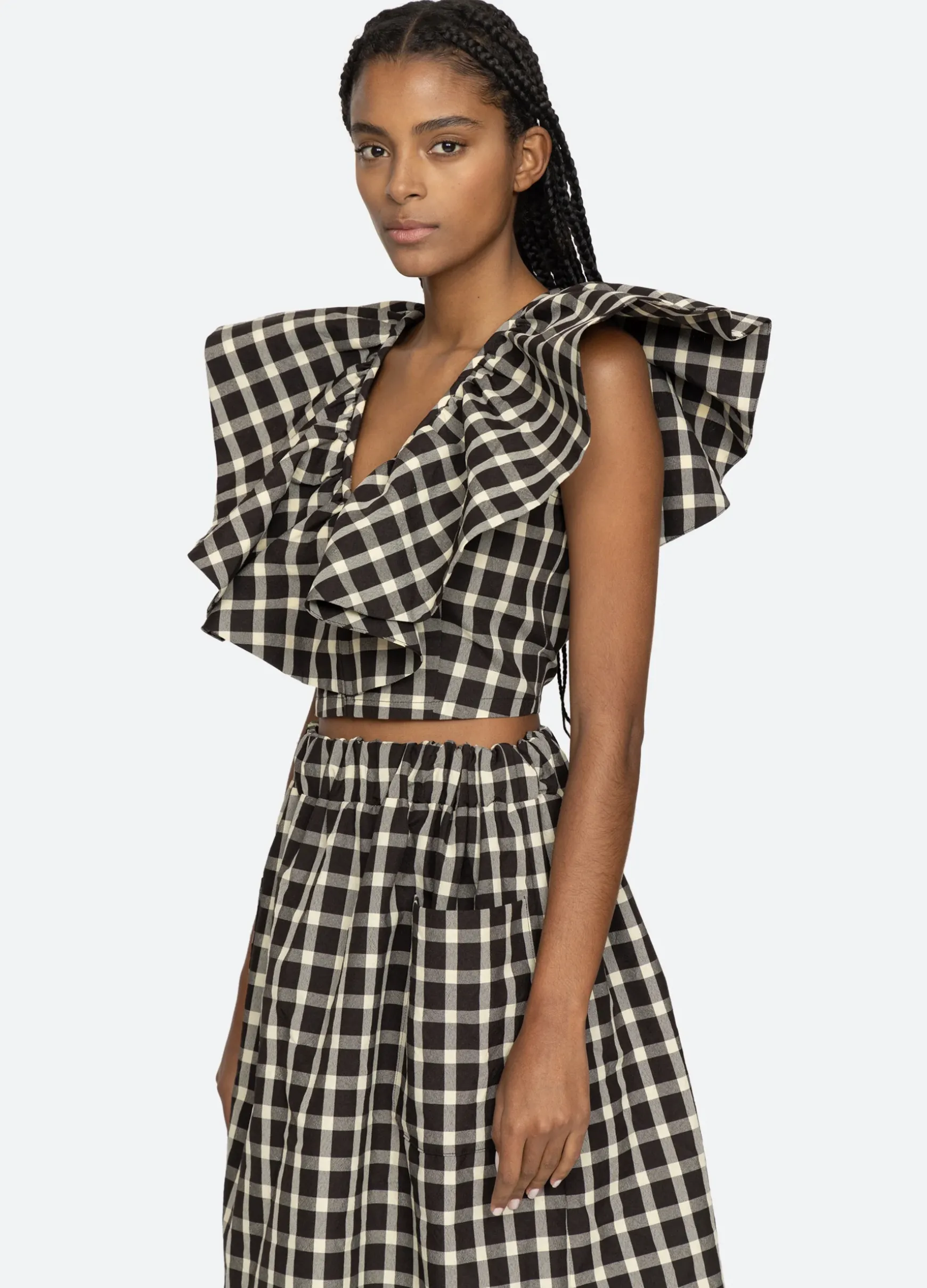 The Valeria check print ruffle tank features a cropped silhouette and oversized ruffle detailing.
