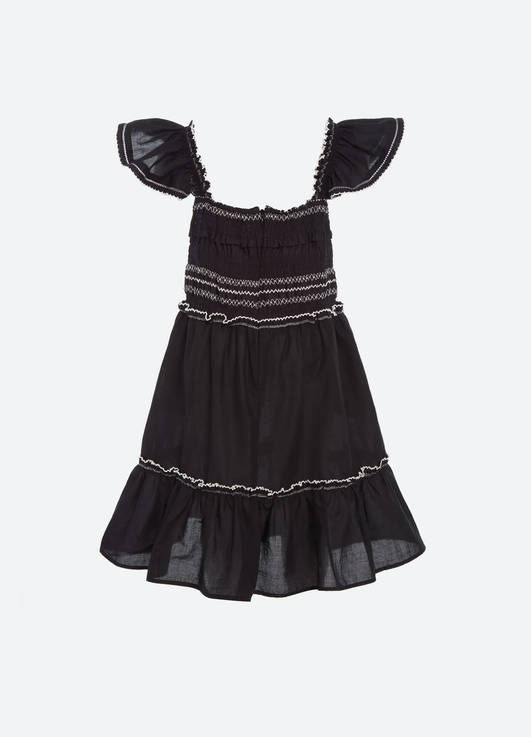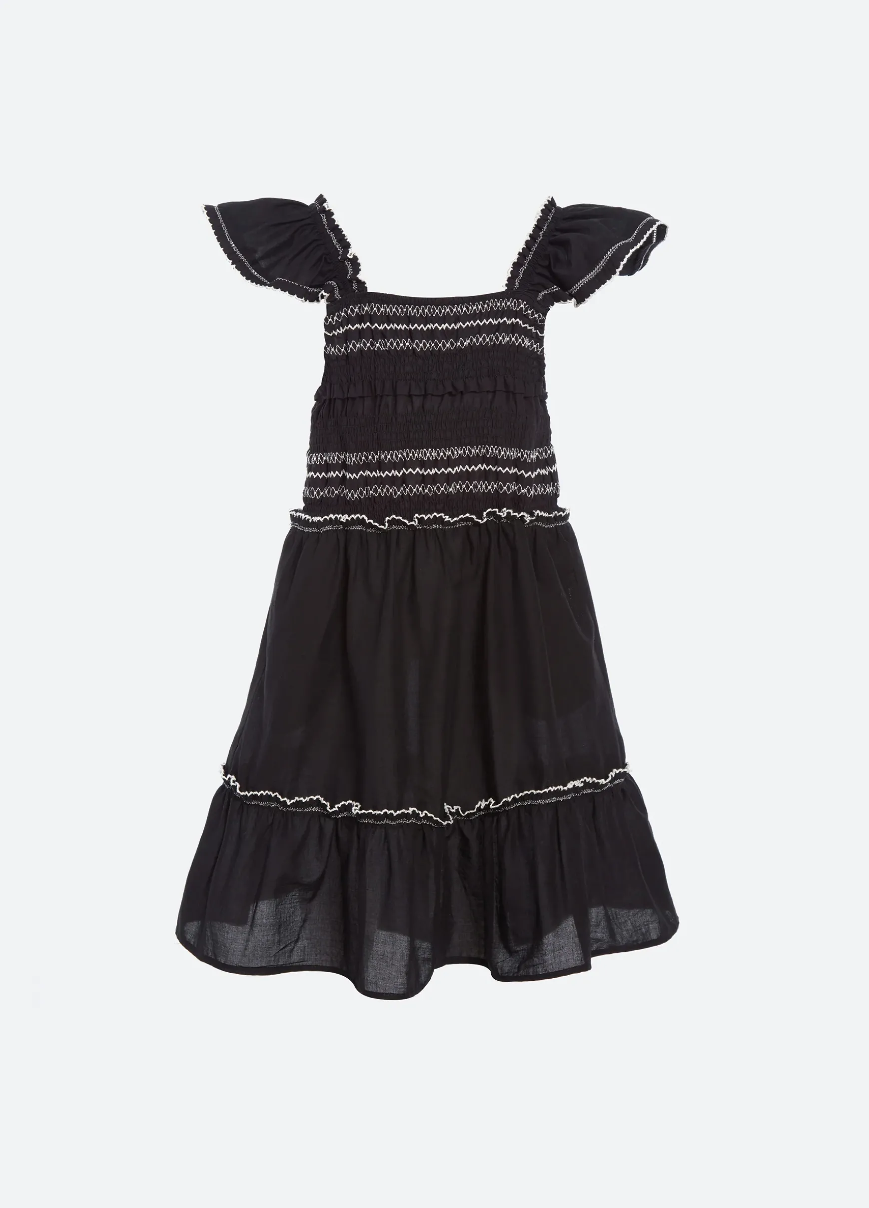 The Mable cambric kids dress features flutter sleeves and a smocked bodice. Part of our mommy & me coordinating collection.