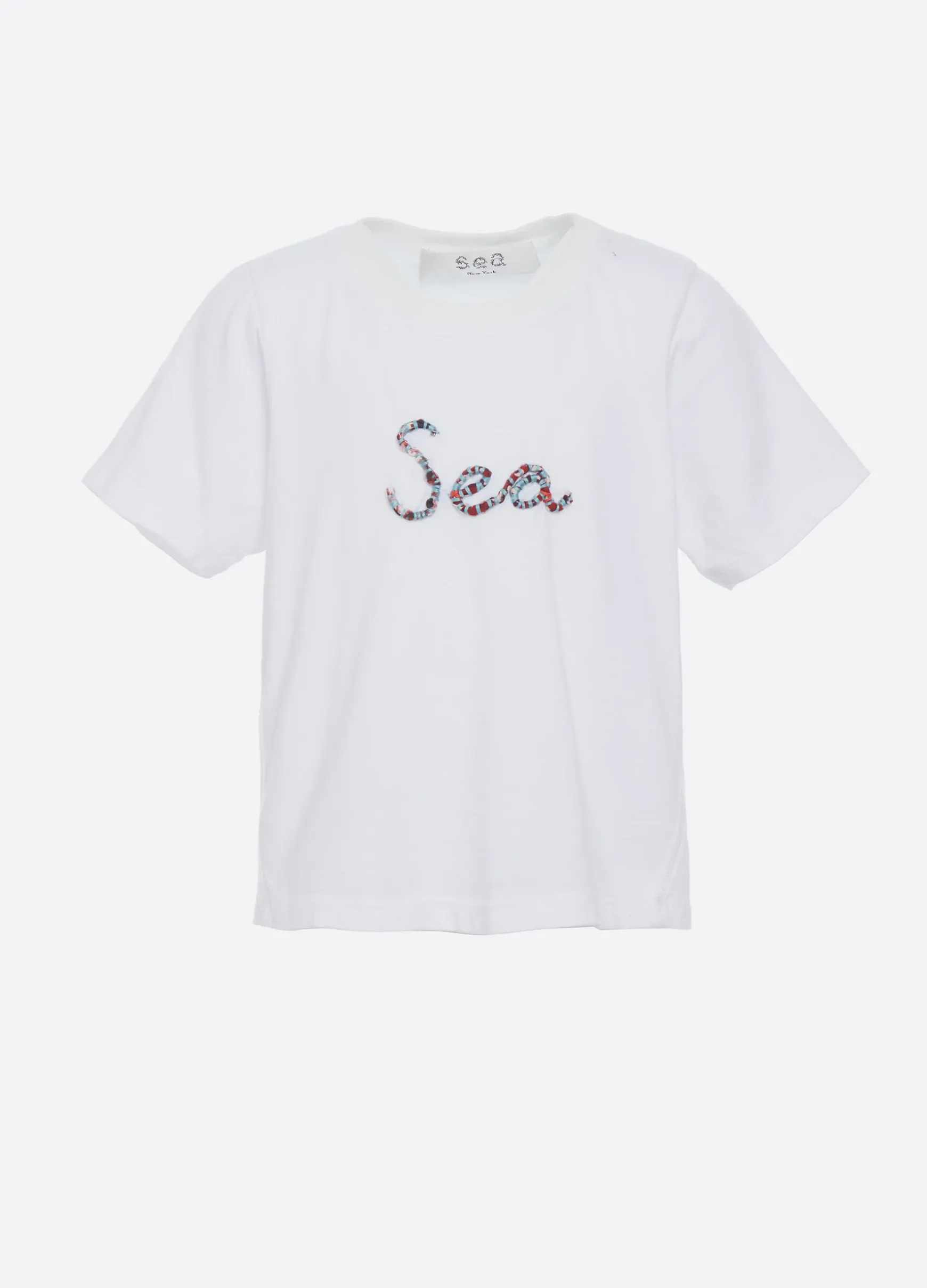 The Sea embroidered kids t-shirt features a multicolored embroidered “Sea” logo. Part of our mommy & me coordinating collection.