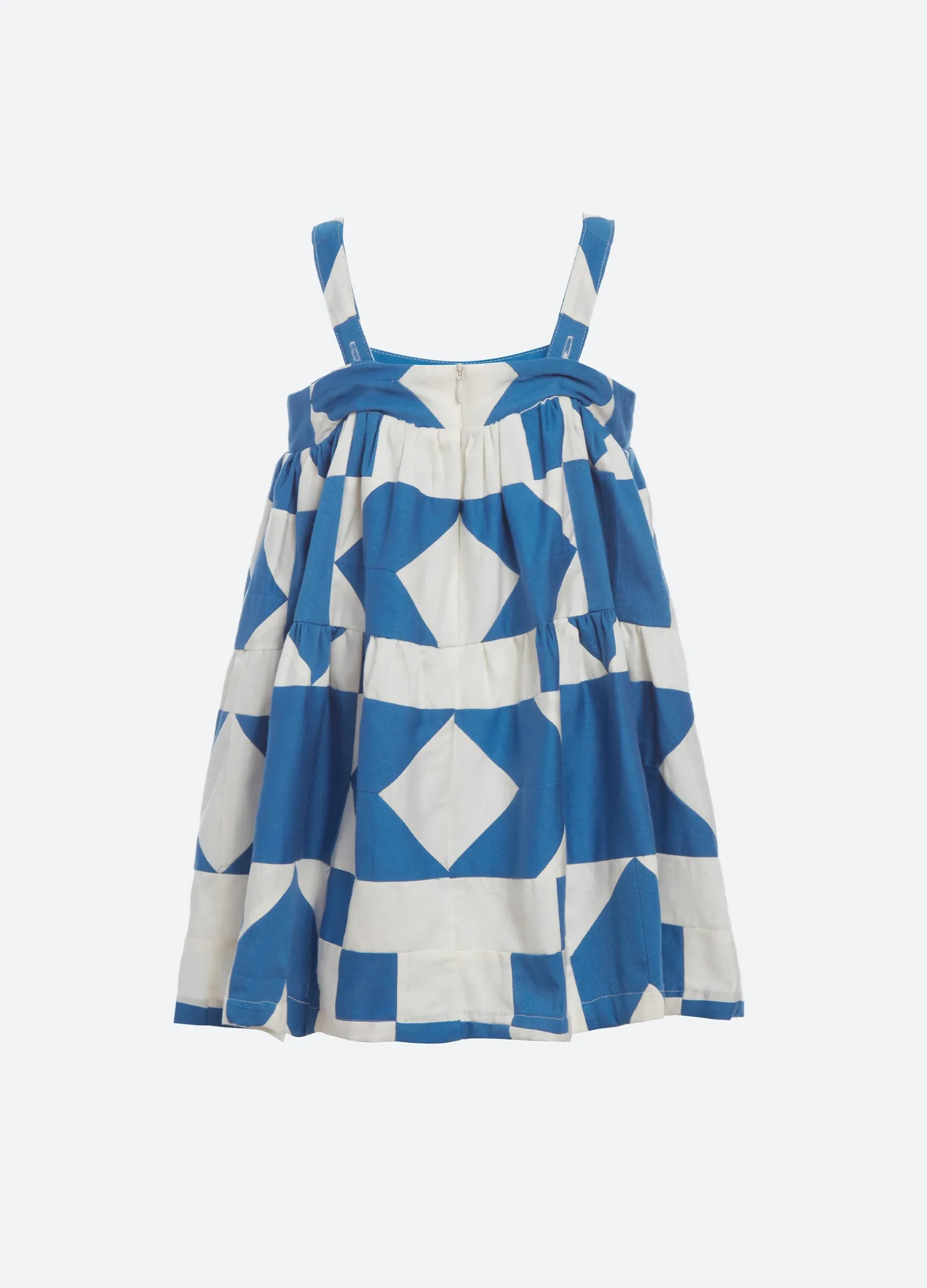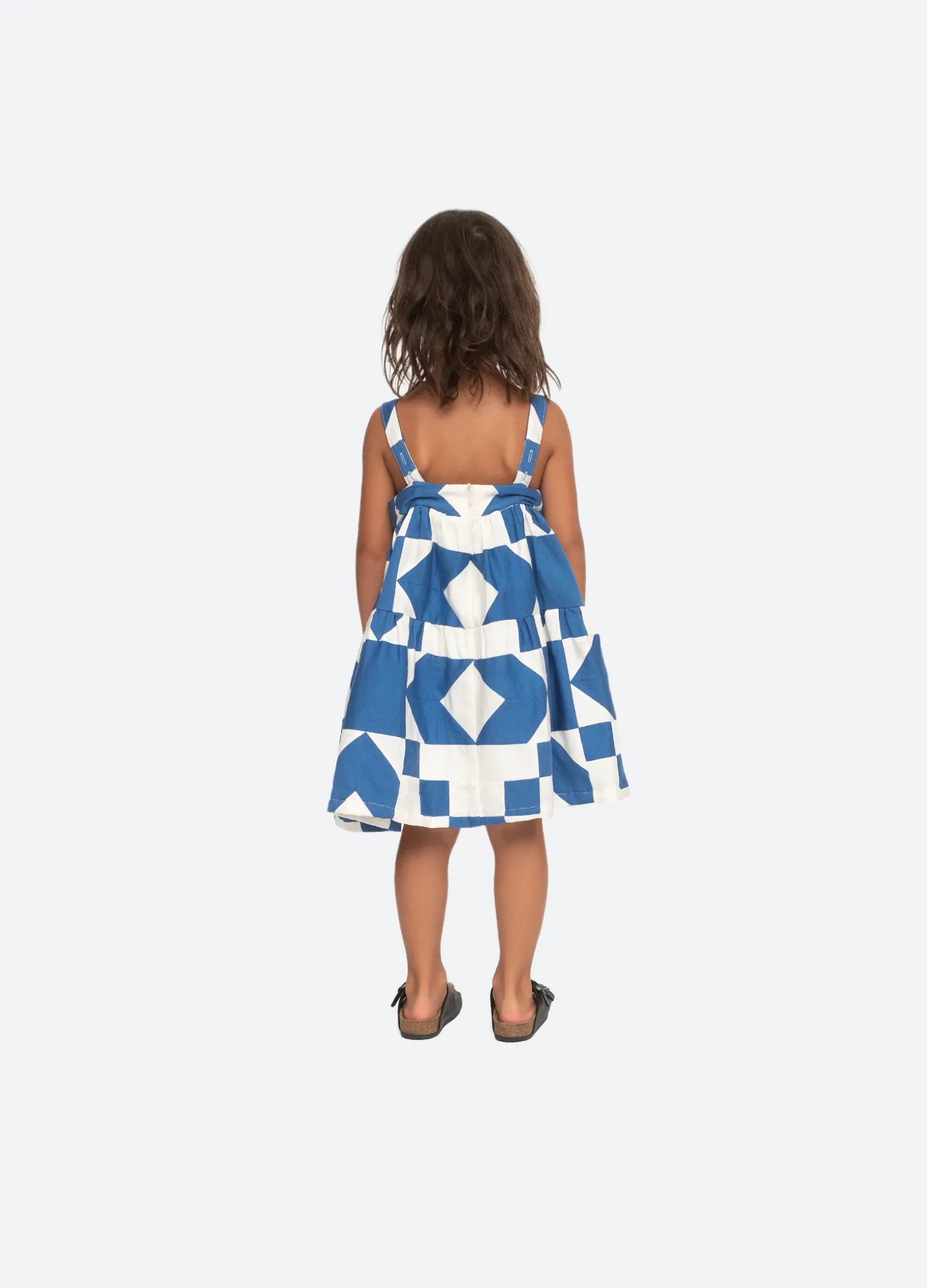 The Tanya patchwork kids dress features adjustable straps and multi colored geometric patchwork print. Part of our mommy & me coordinating collection.