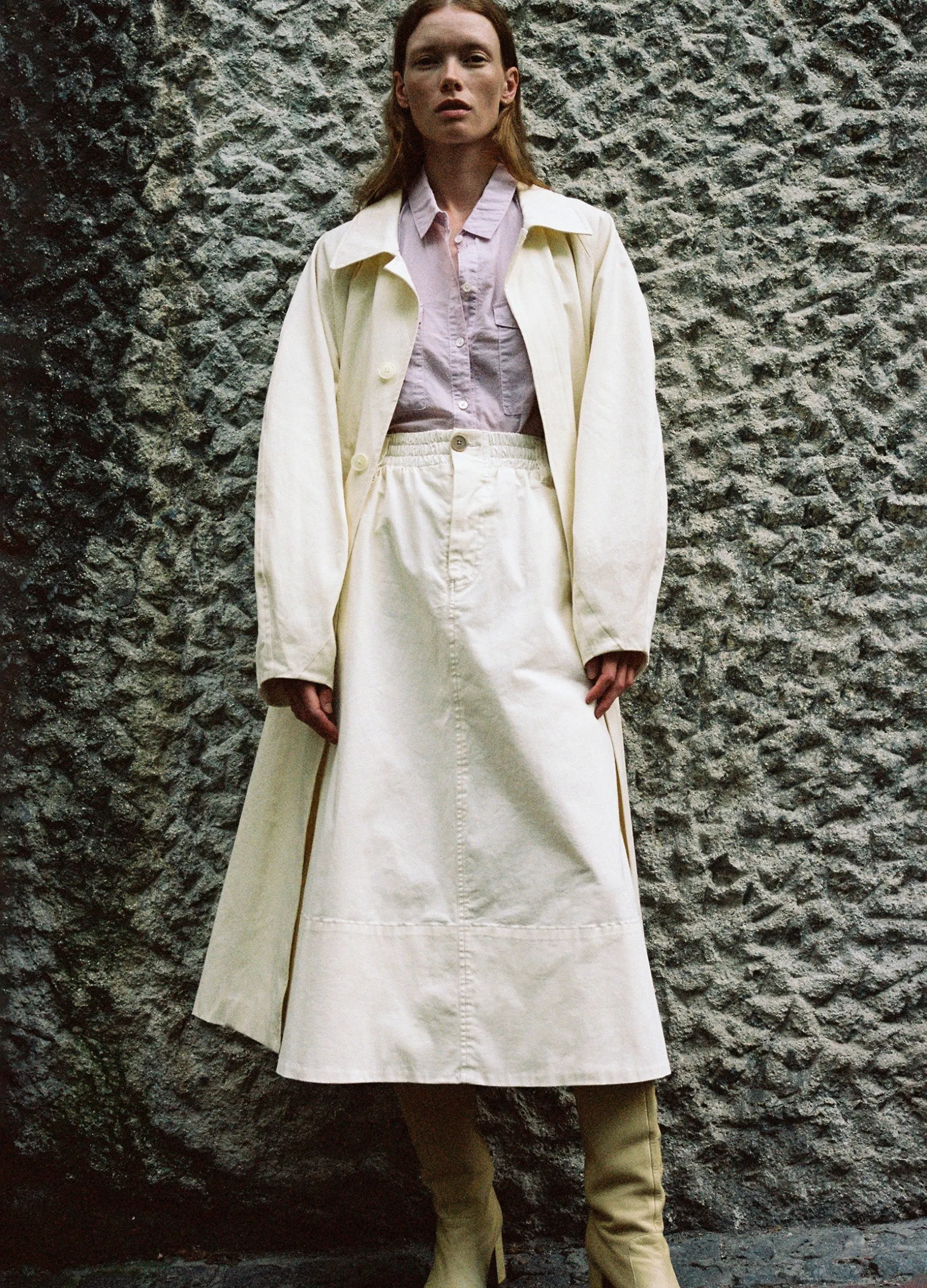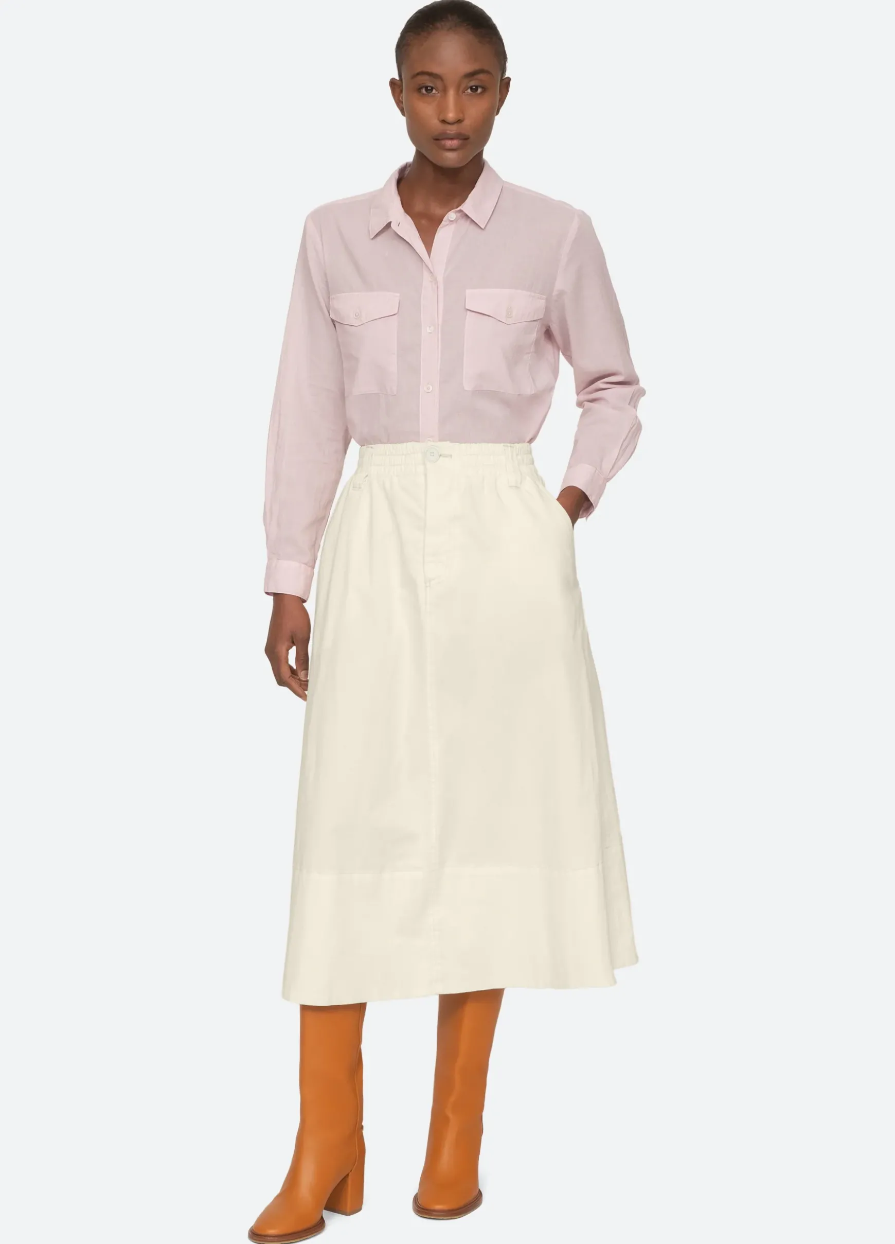 The Karina skirt features a high rise elasticized waistband and a-line silhouette.