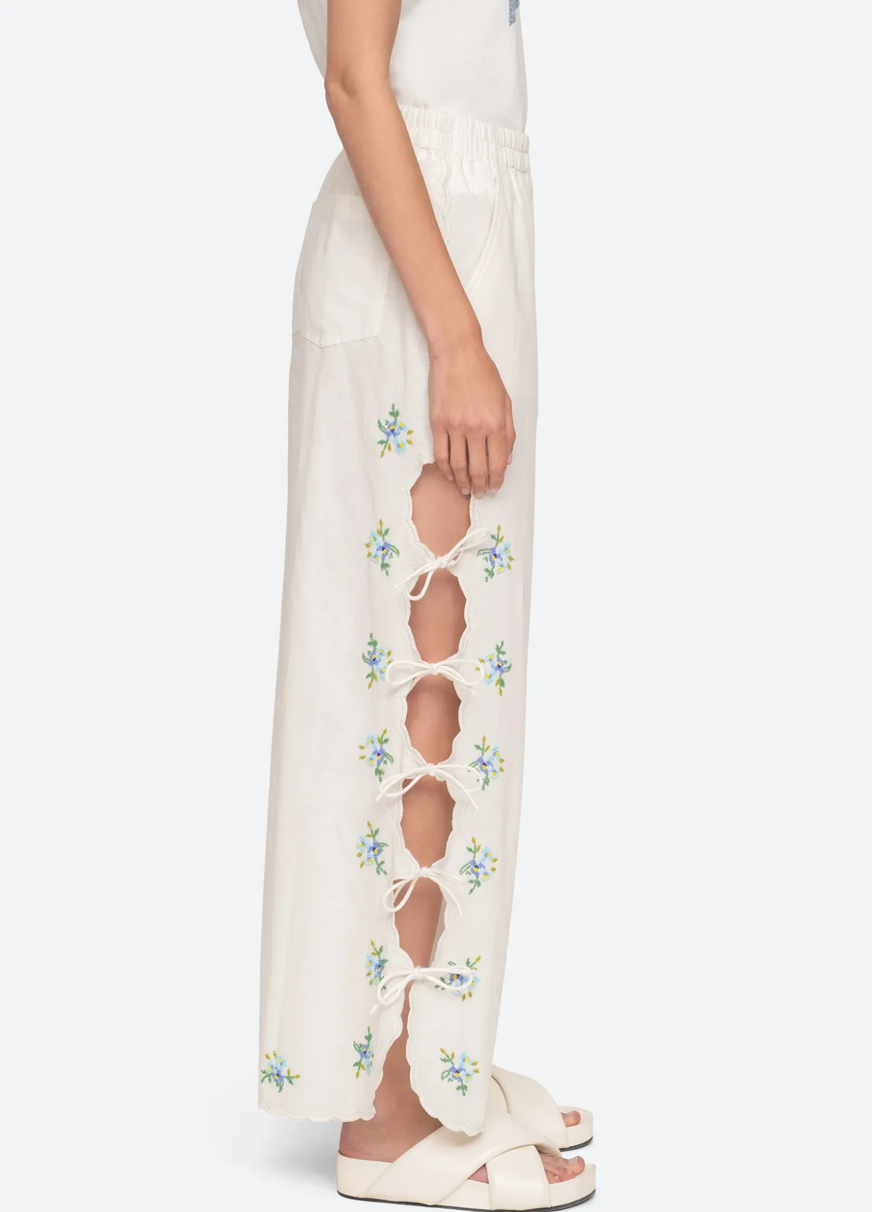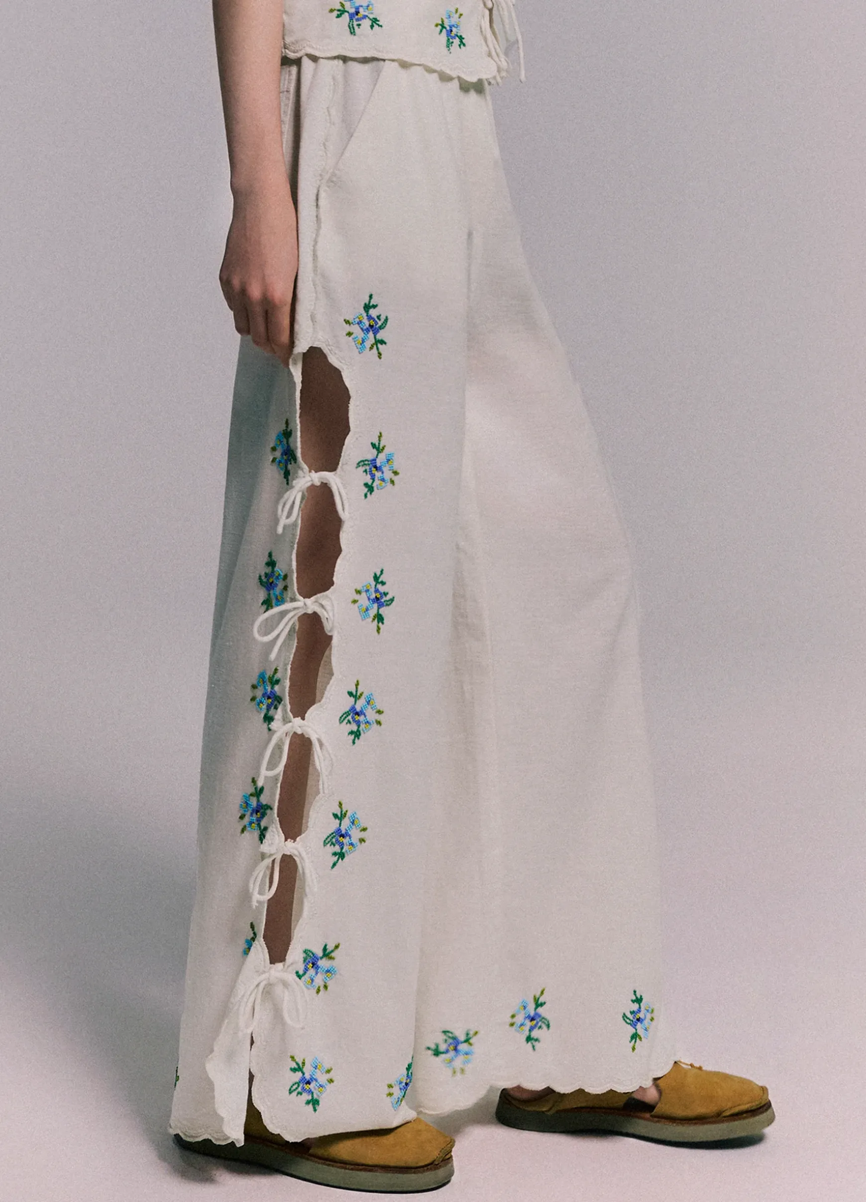 The Tania beaded pants feature an elasticized waistband, floral beaded detailing and ties down the side of the leg. Designed for an easy, relaxed fit.