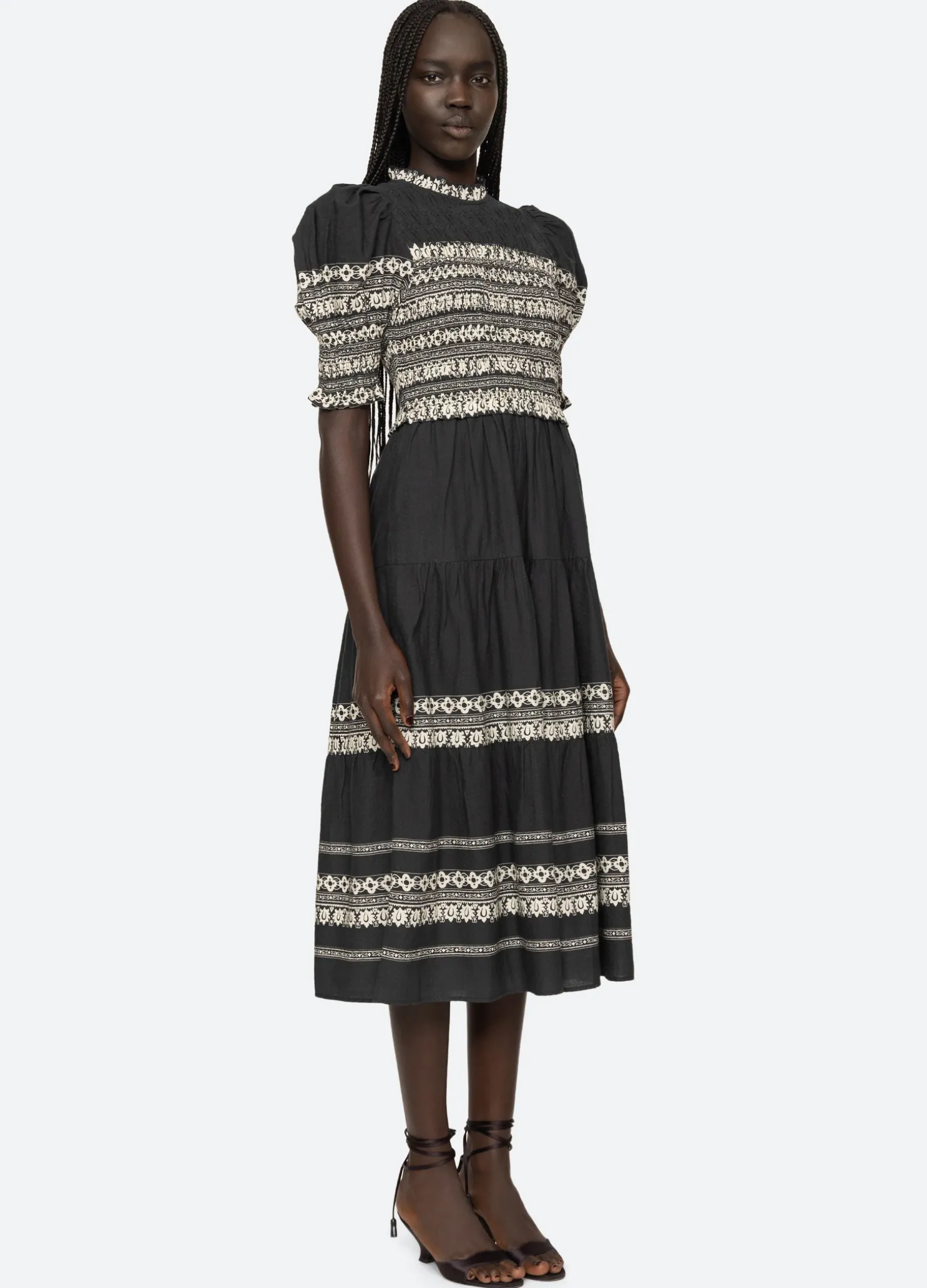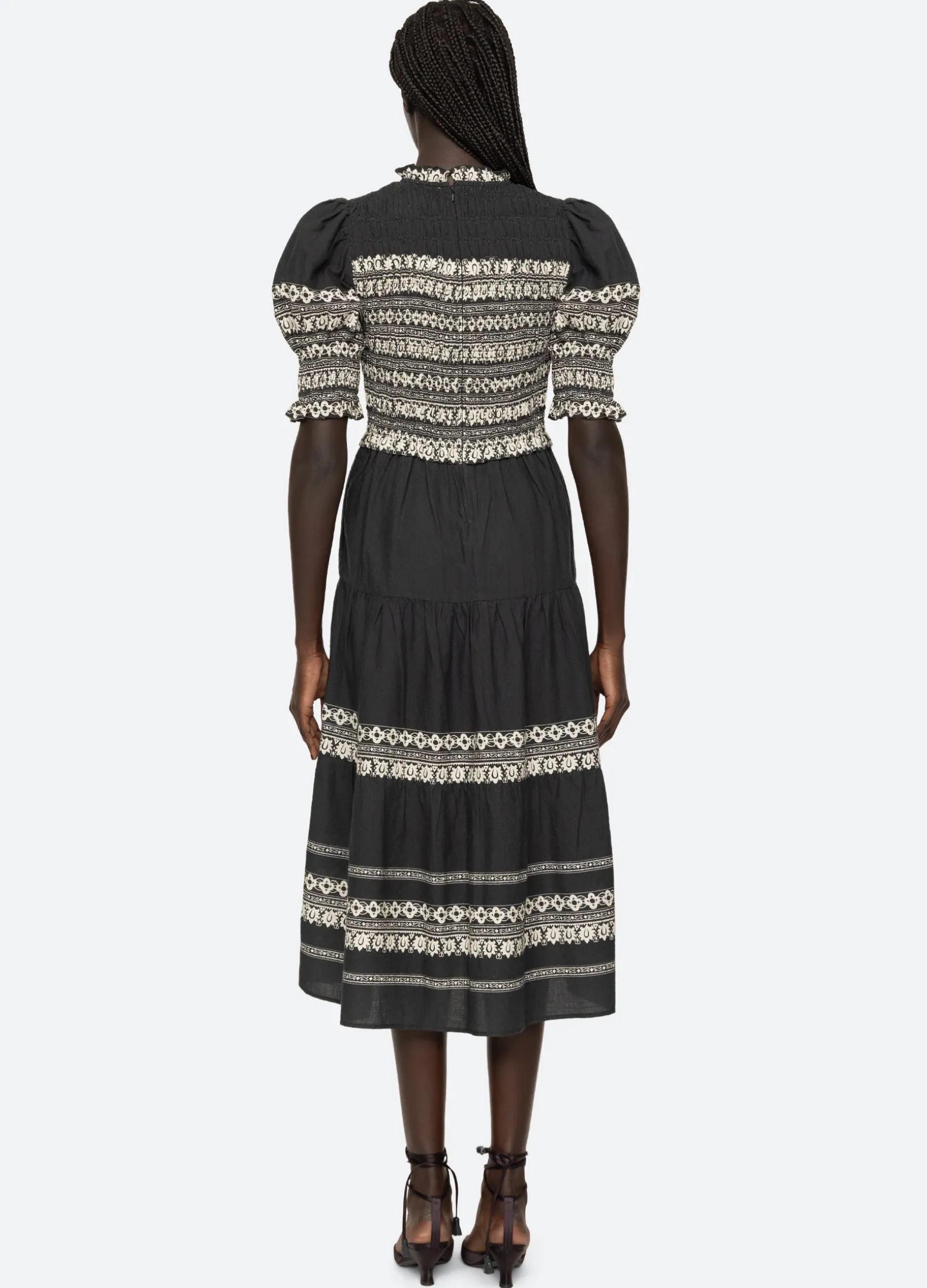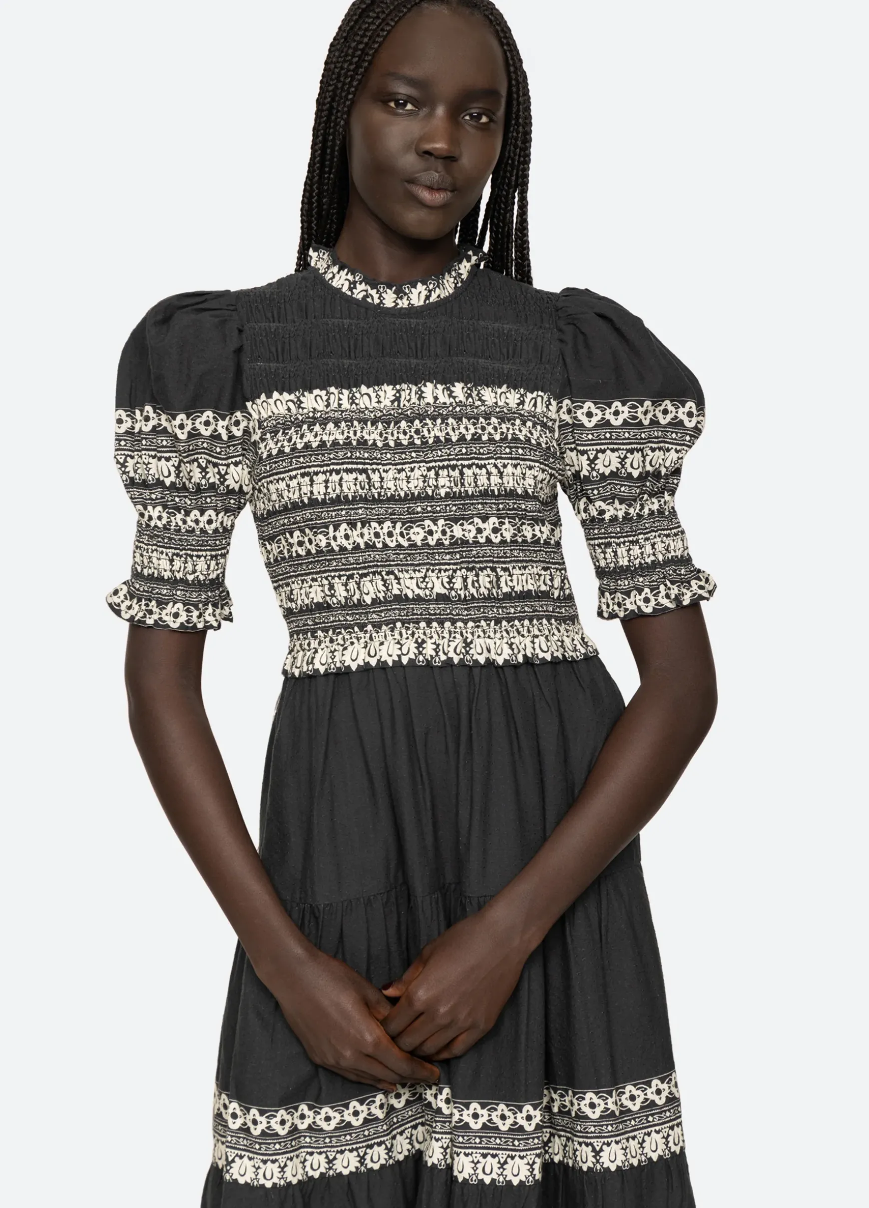 The Amina smocked dress features a smocked bodice, puff sleeves and ruffle trim detailing.