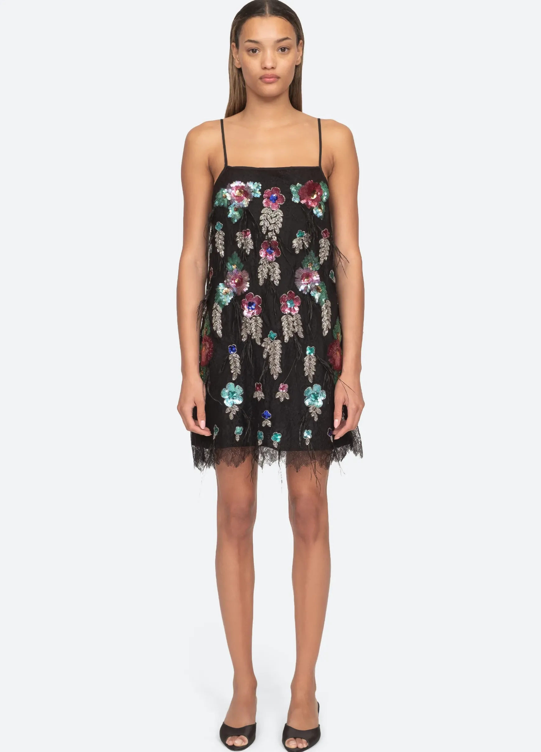 The Bethany lace slip dress is accented with floral sequin appliques, beaded detailing and feathers.