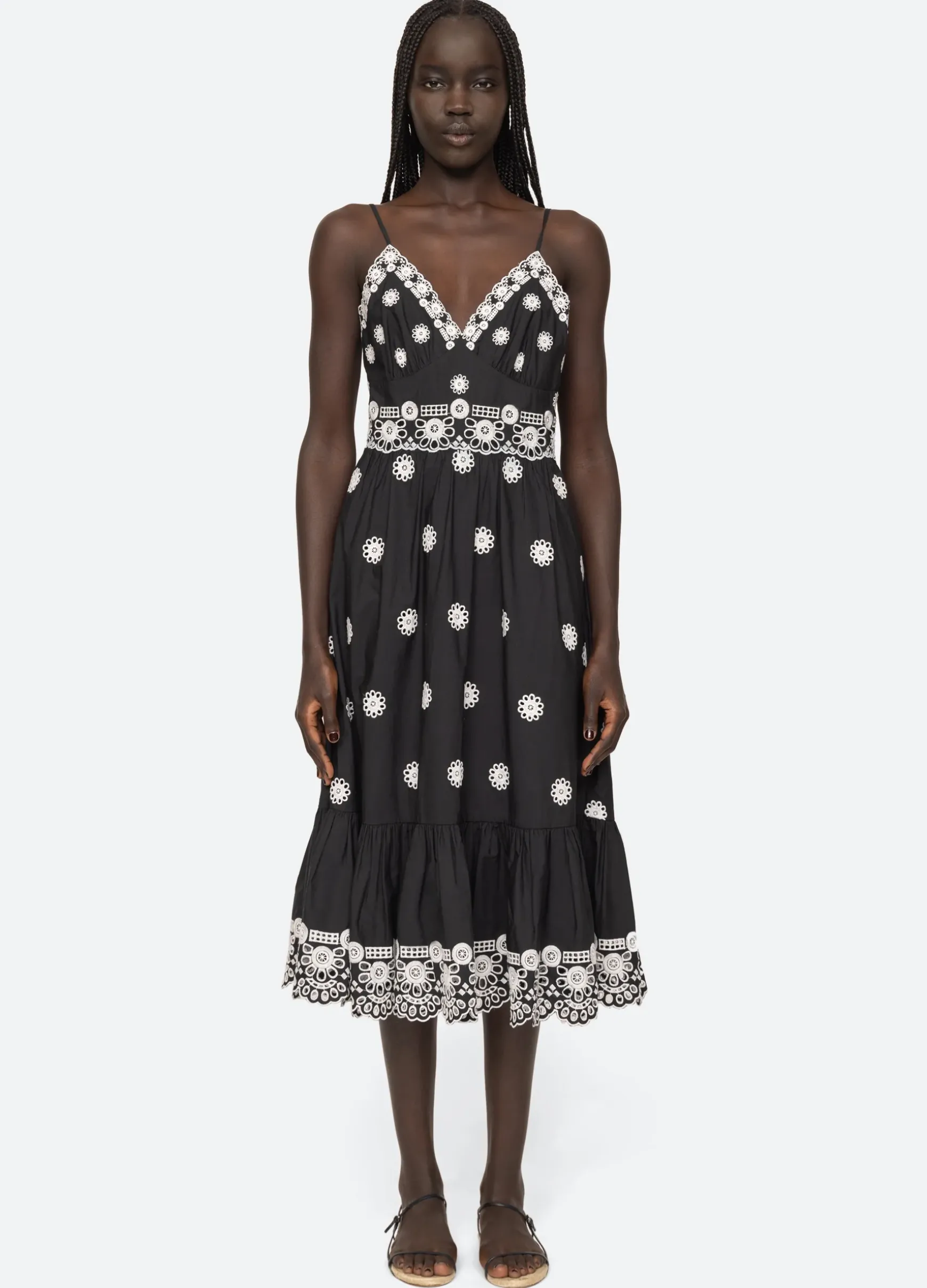 The Elysse embroidered dress features eyelet detailing throughout and midi silhouette.