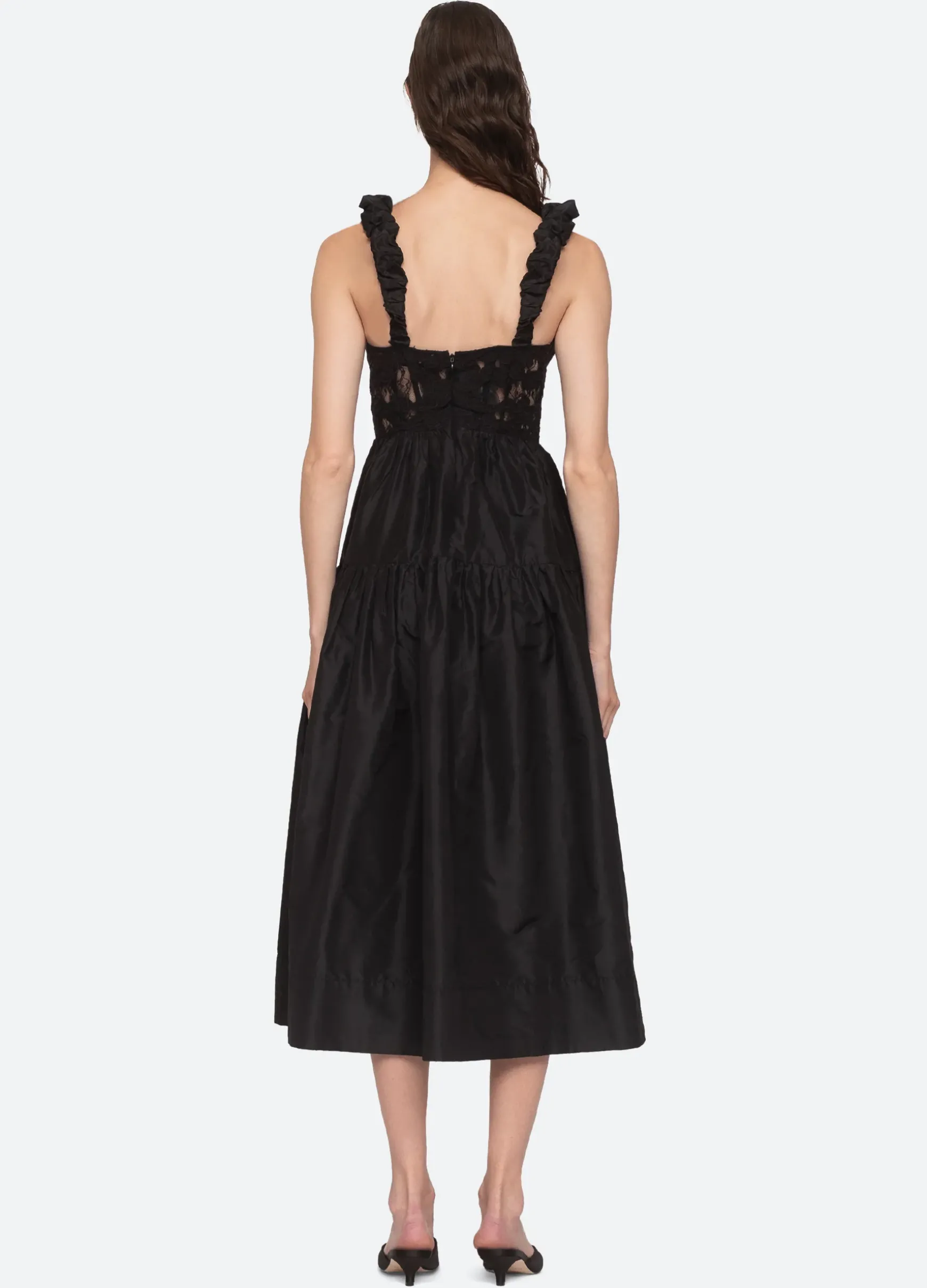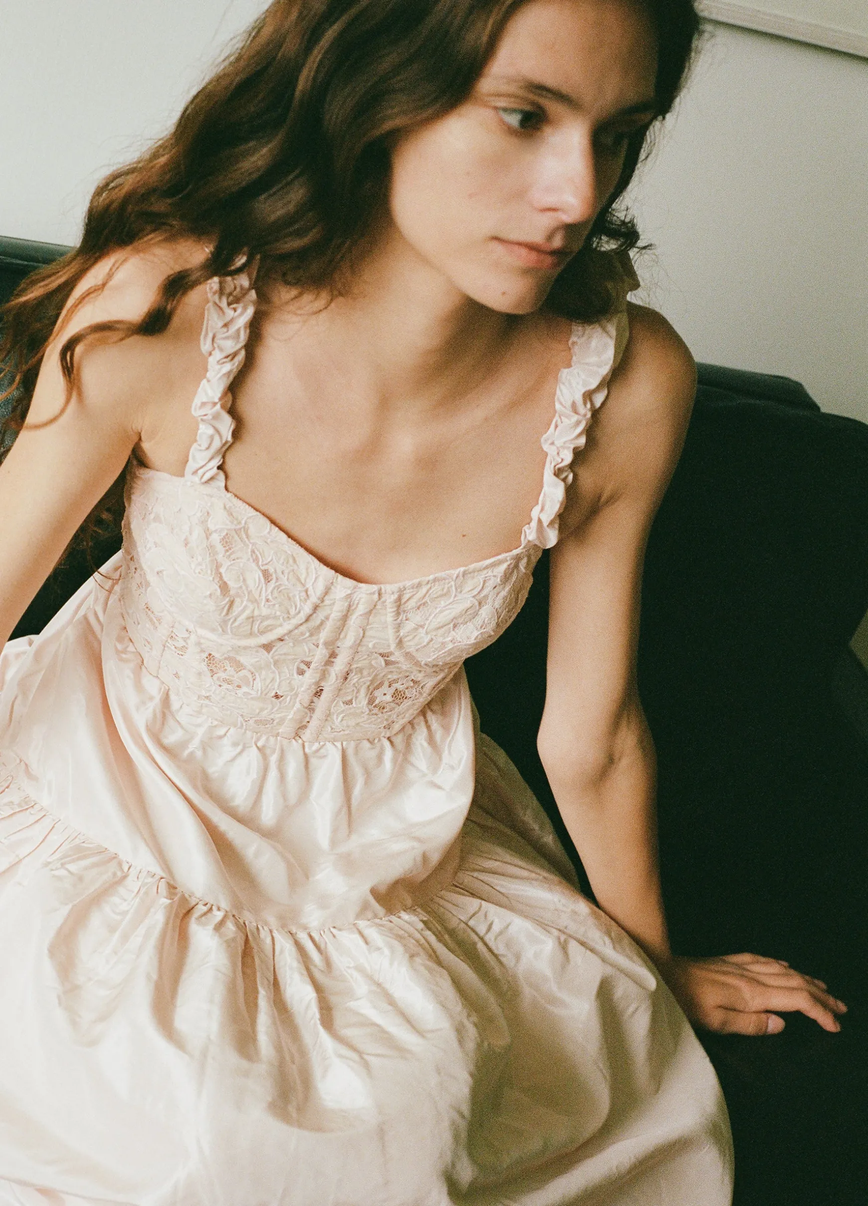 The Evita embroidered corset dress features a lace corset bodice, ruched straps and full skirt.