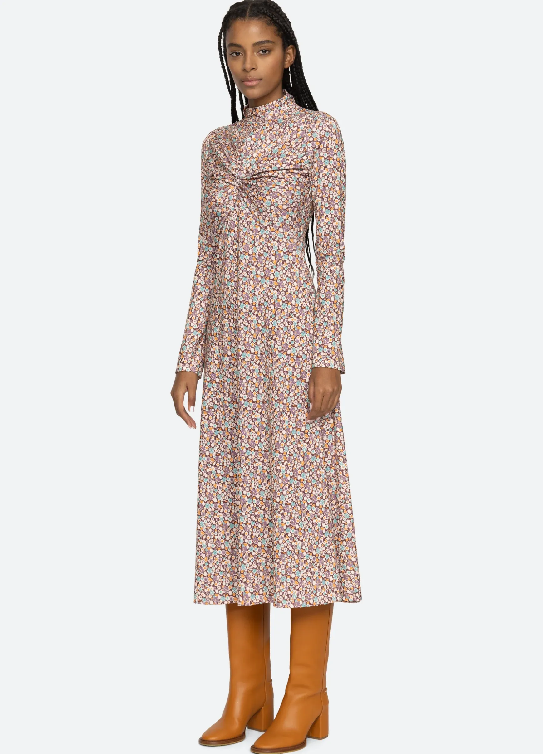 The Fernande floral print long sleeve dress features a midi silhouette with ruched detailing on the bodice.