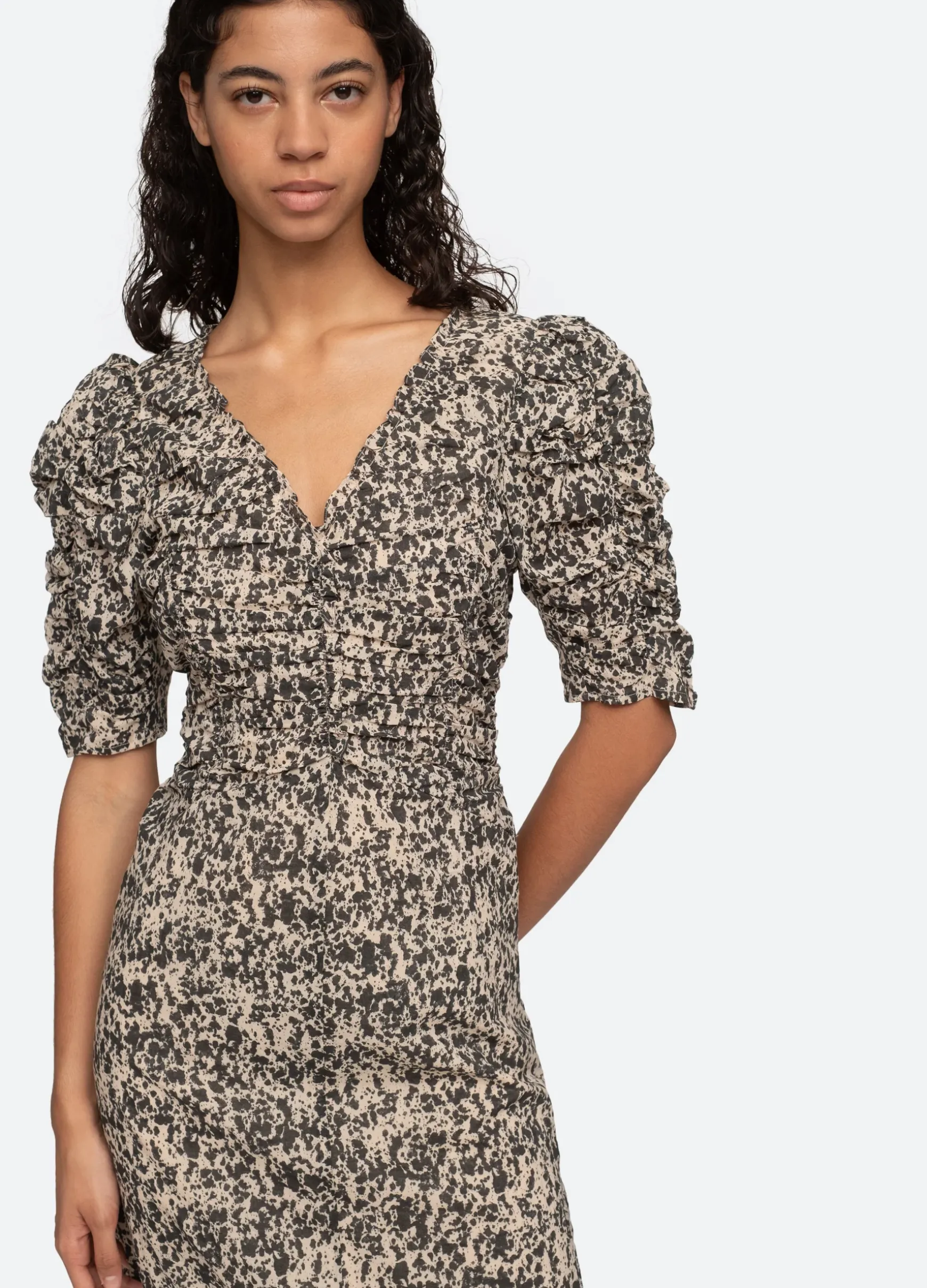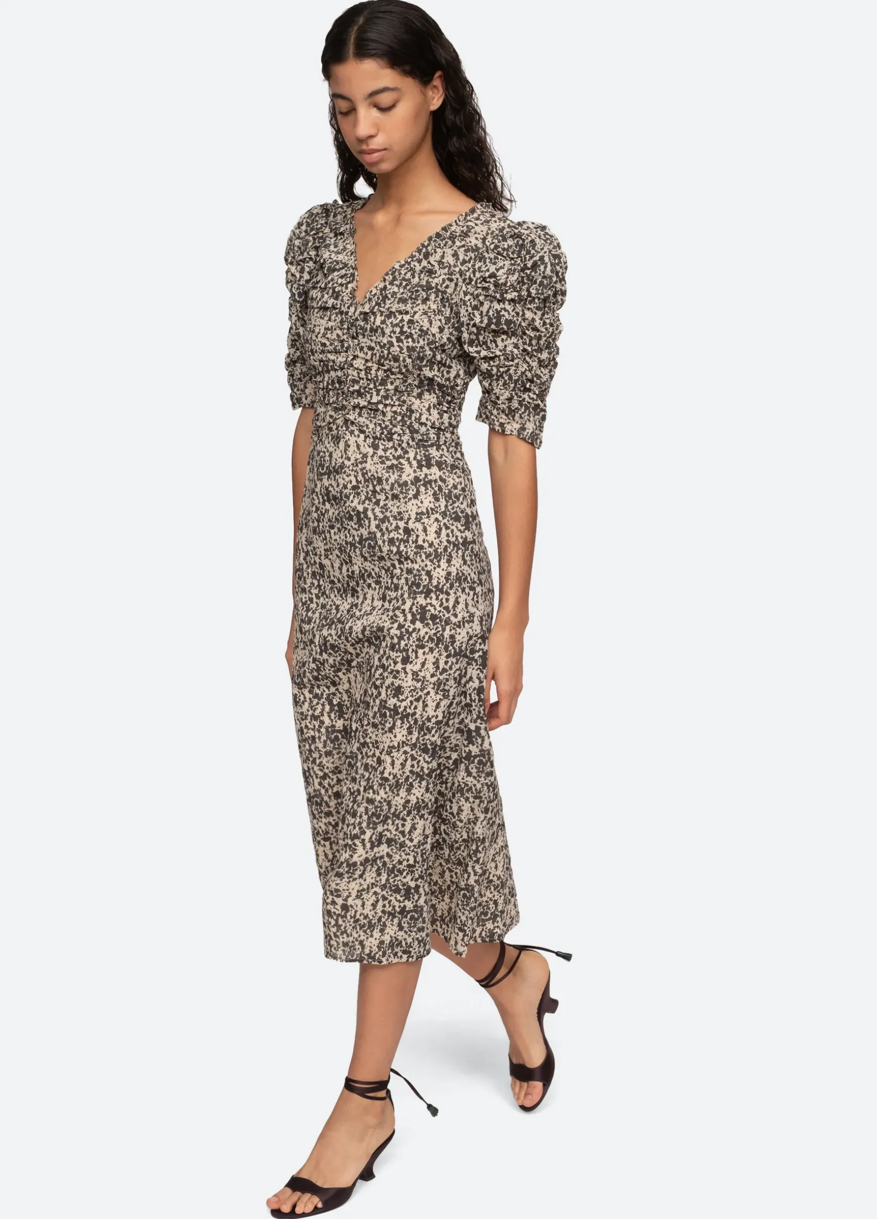The Gia print short sleeve dress features a v-neckline, puff sleeves and ruched detailing.